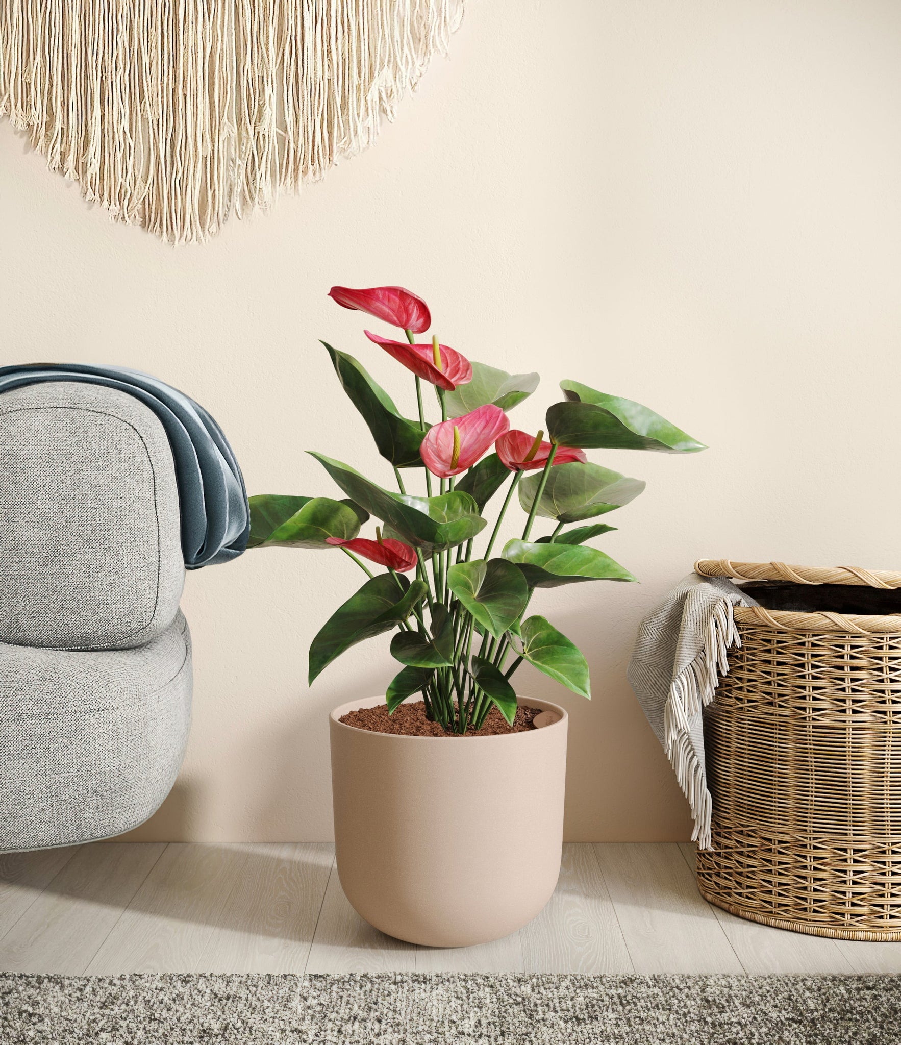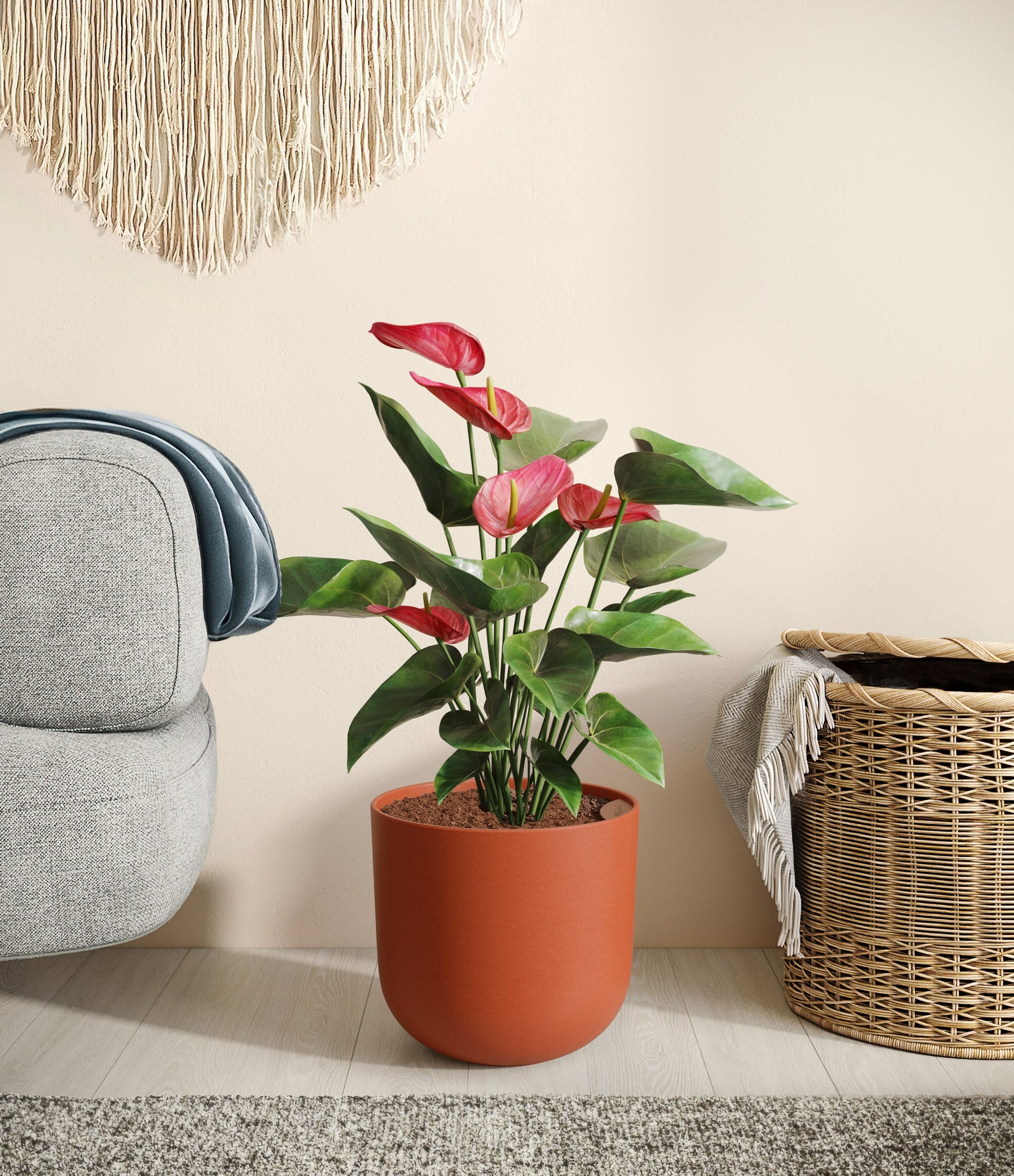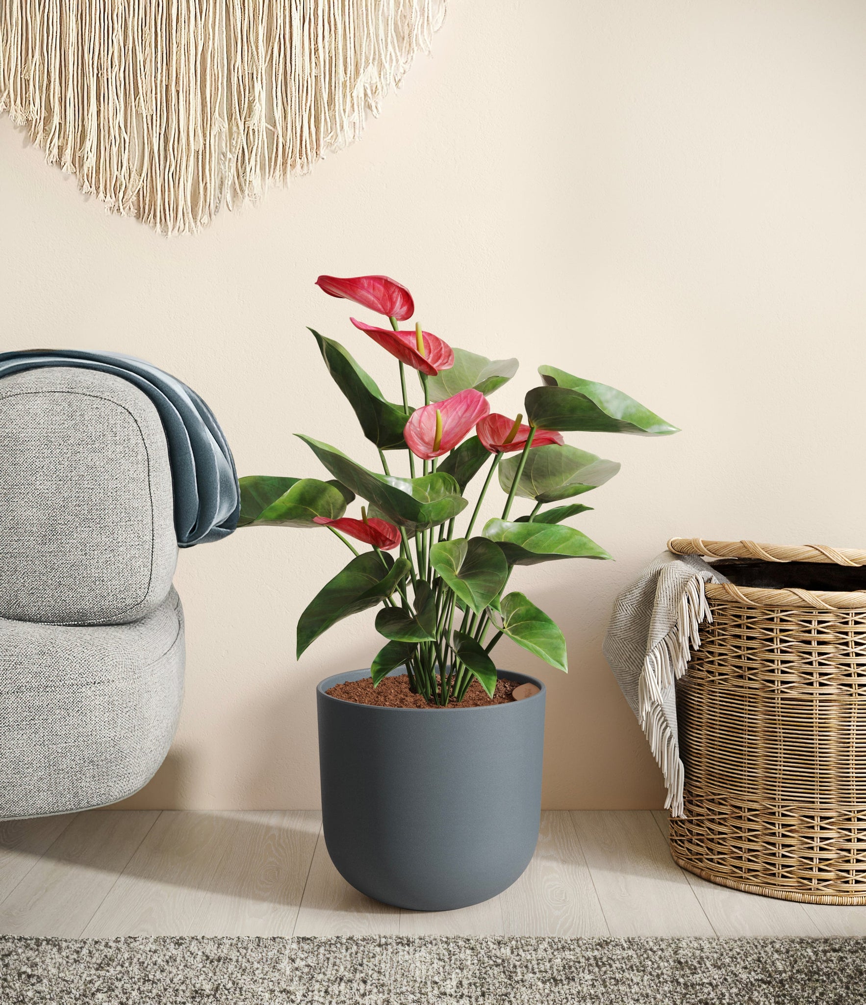 Native to the Americas and Caribbeans, this tropical evergreen beauty brings out the best and brightest in any space it inhabits. The colorful heart-shaped waxy leaves, called spathes, act as protectors for its straight spike, called spadix, where very small flowers grow in its bloom. As the plant matures, bloom colors may naturally vary or evolve, reflecting its dynamic beauty. Thanks to its long-lived, heart-opening charm, Anthurium is the quintessential symbol of generosity and kindness, making it a perfect gift for those you love the most. It is cherished for its long blooms, lasting anywhere from eight to twelve weeks.