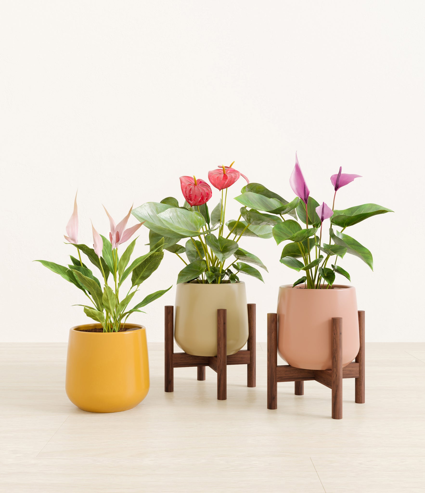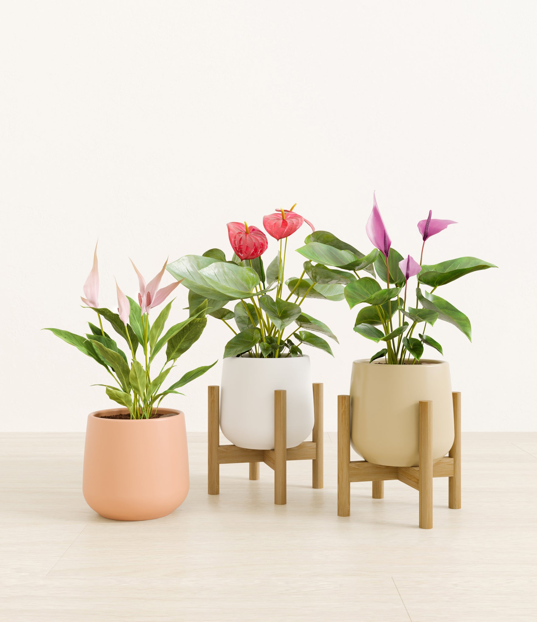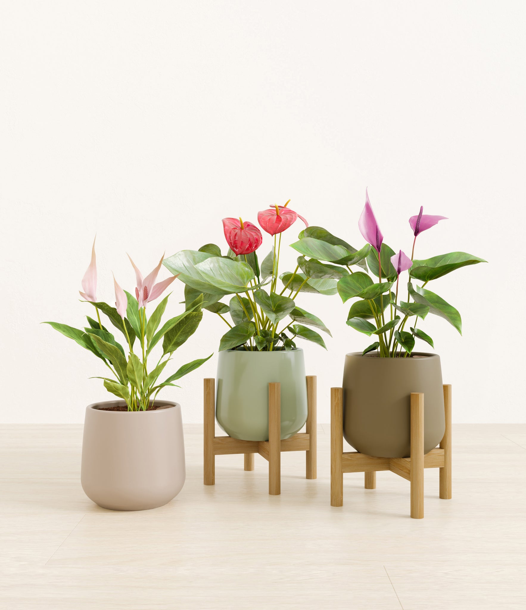 In this collection, you’ll receive a vibrant trio of flowering houseplants that instantly light up any space. The set includes a small Anthurium Red - a beloved classic, admired for its vivid, heart-shaped waxy leaves that symbolize generosity and joy; a small Anthurium Lilli, dressed in delicate pink spathes that whisper softness and affection; and a small Anthurium Zizou, with its rich violet hues and striking upright blooms. Together, these three create a radiant and harmonious display of color, perfect for bringing life, charm, and a touch of romance into any room.