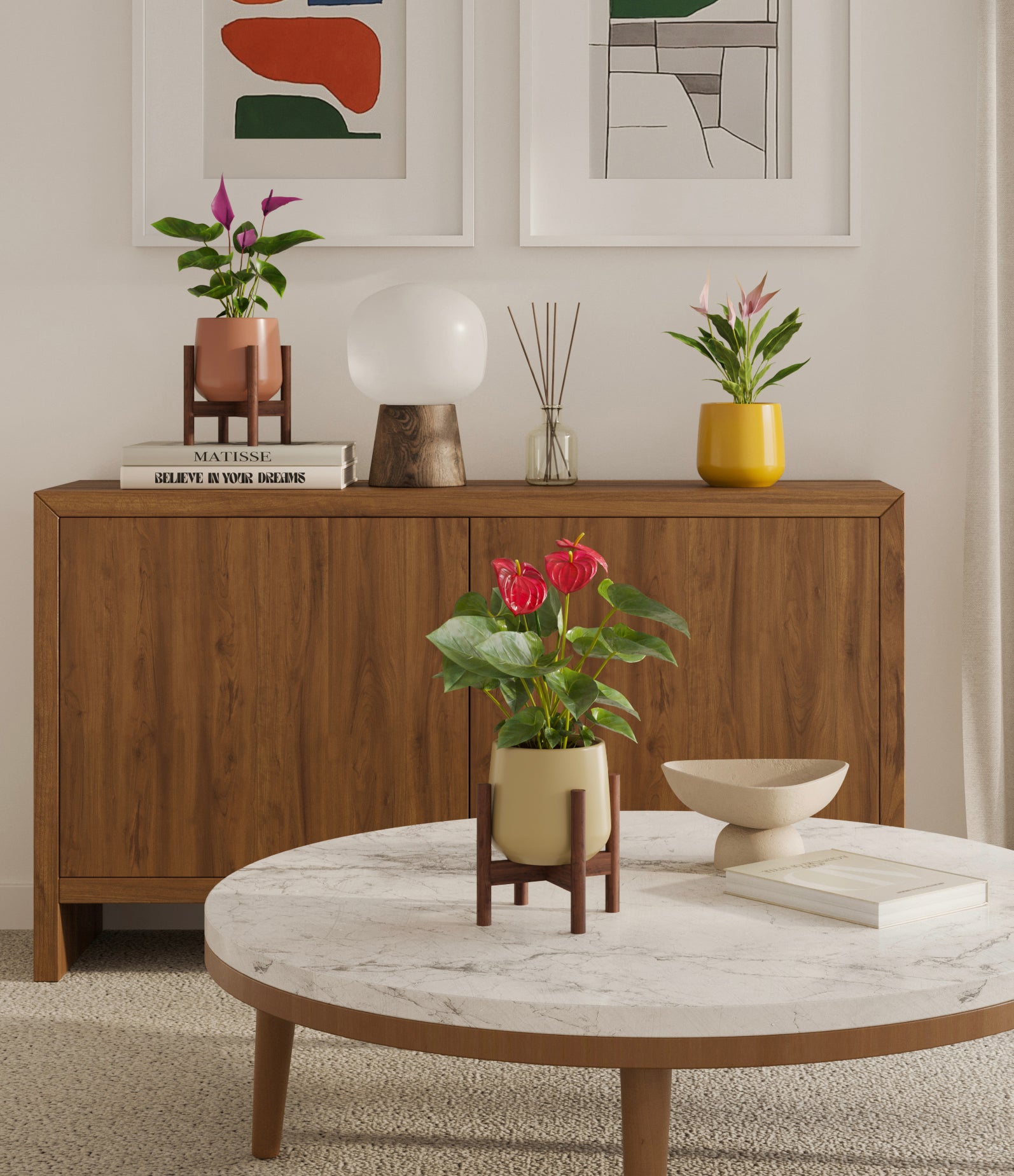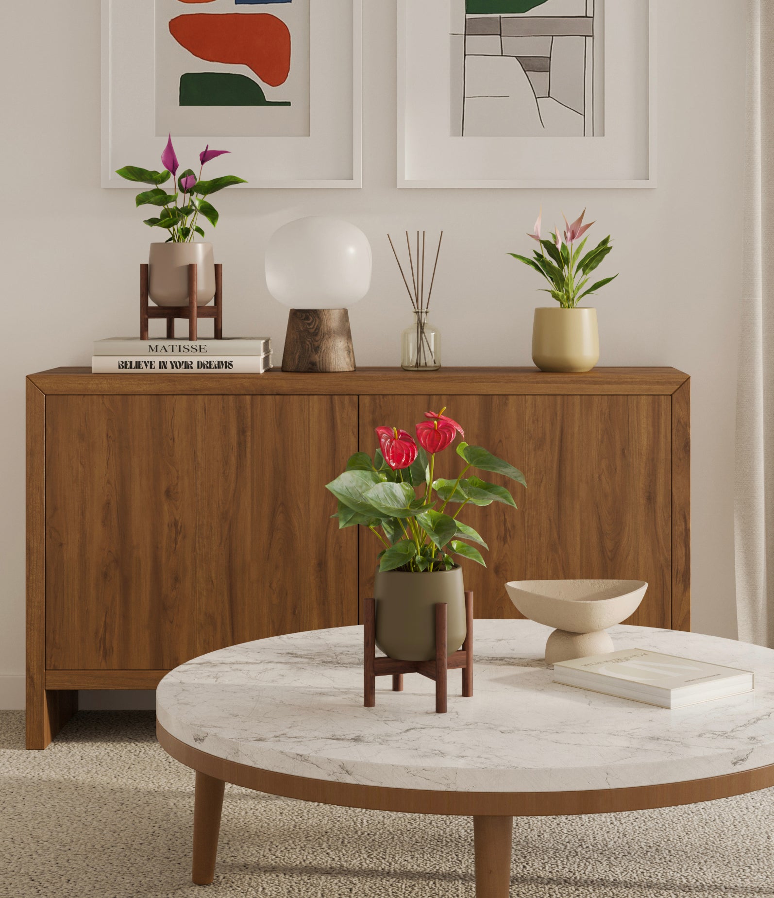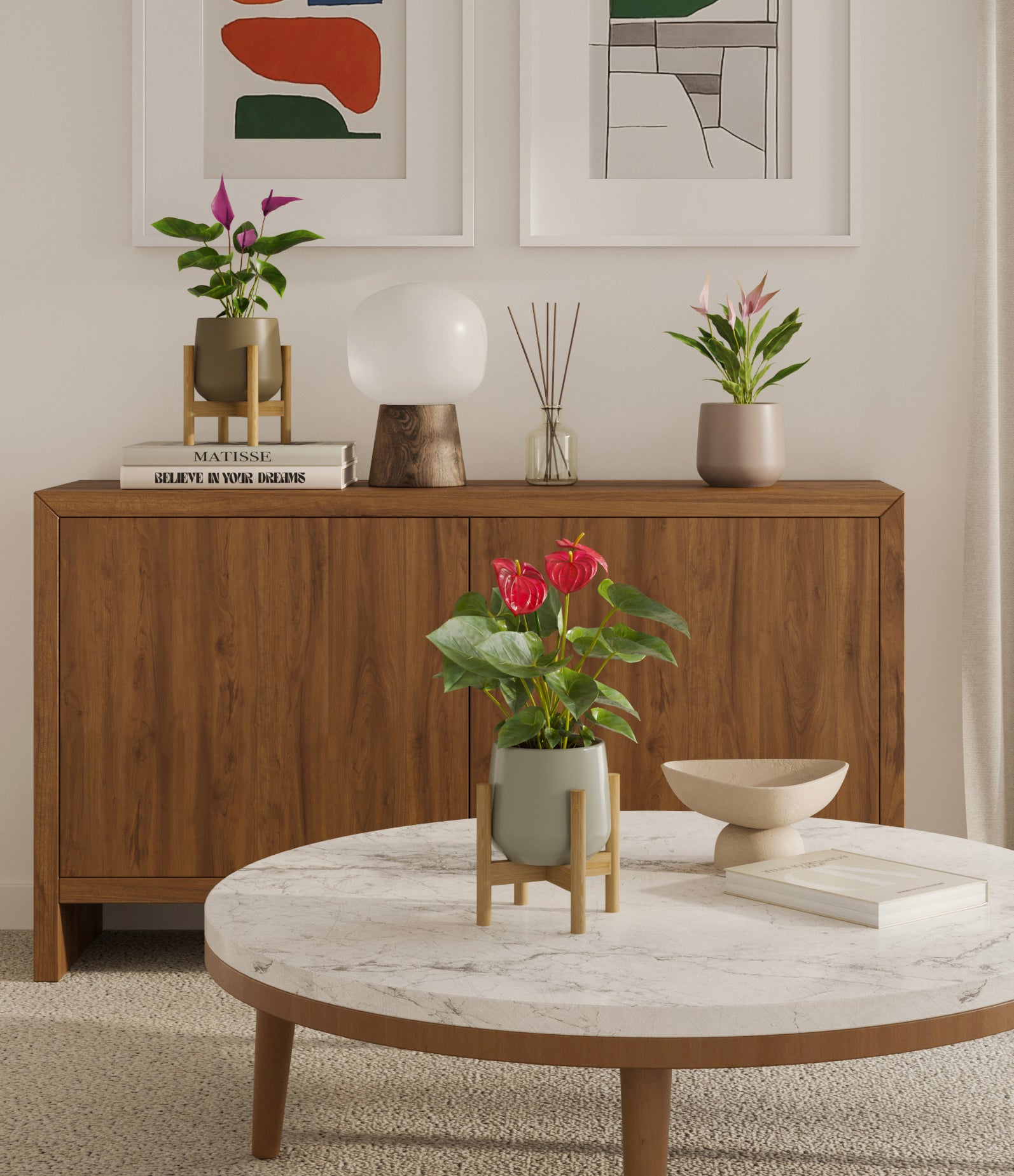 In this collection, you’ll receive a vibrant trio of flowering houseplants that instantly light up any space. The set includes a small Anthurium Red - a beloved classic, admired for its vivid, heart-shaped waxy leaves that symbolize generosity and joy; a small Anthurium Lilli, dressed in delicate pink spathes that whisper softness and affection; and a small Anthurium Zizou, with its rich violet hues and striking upright blooms. Together, these three create a radiant and harmonious display of color, perfect for bringing life, charm, and a touch of romance into any room.