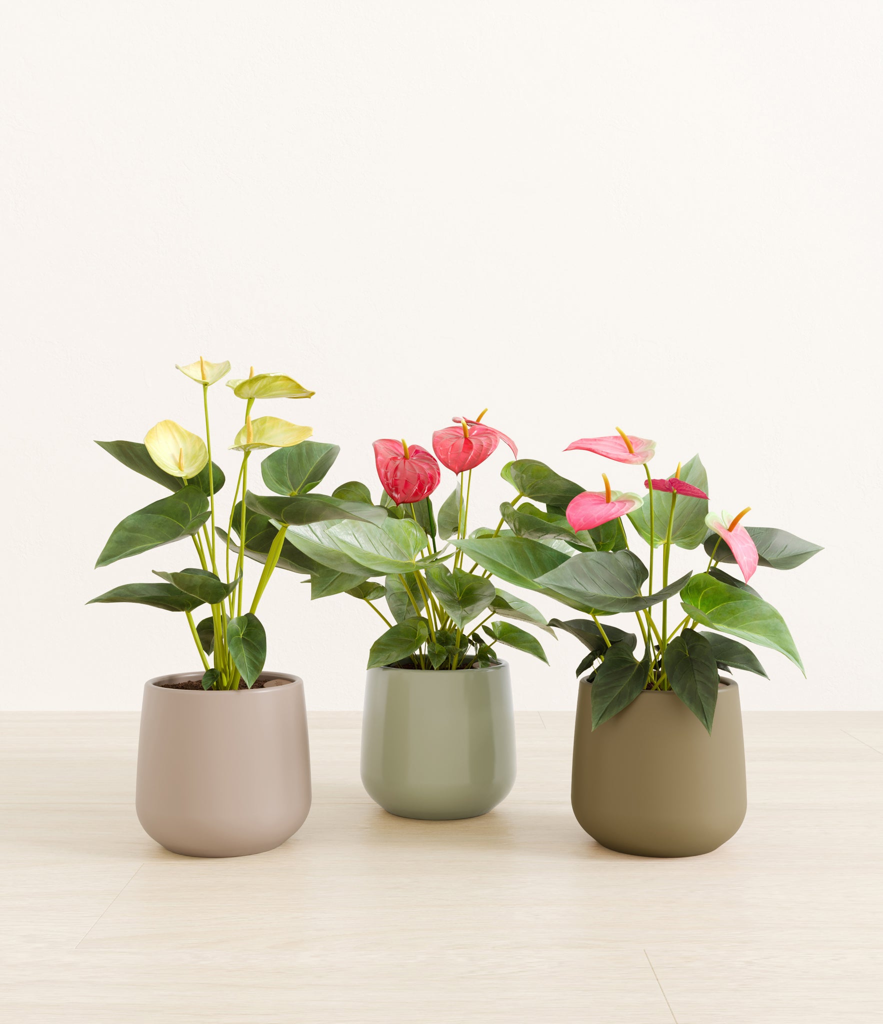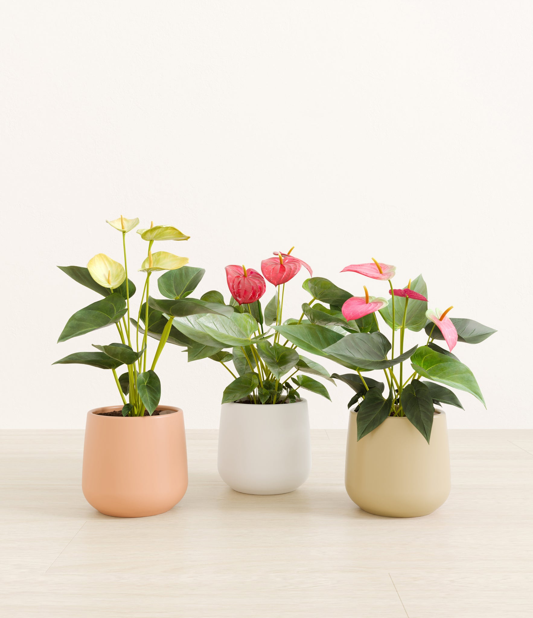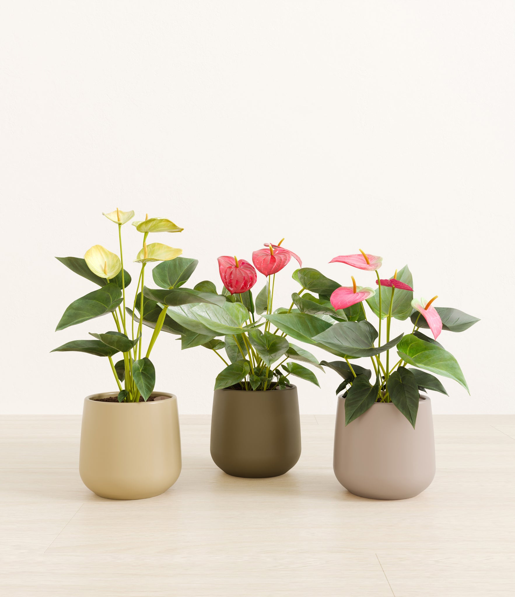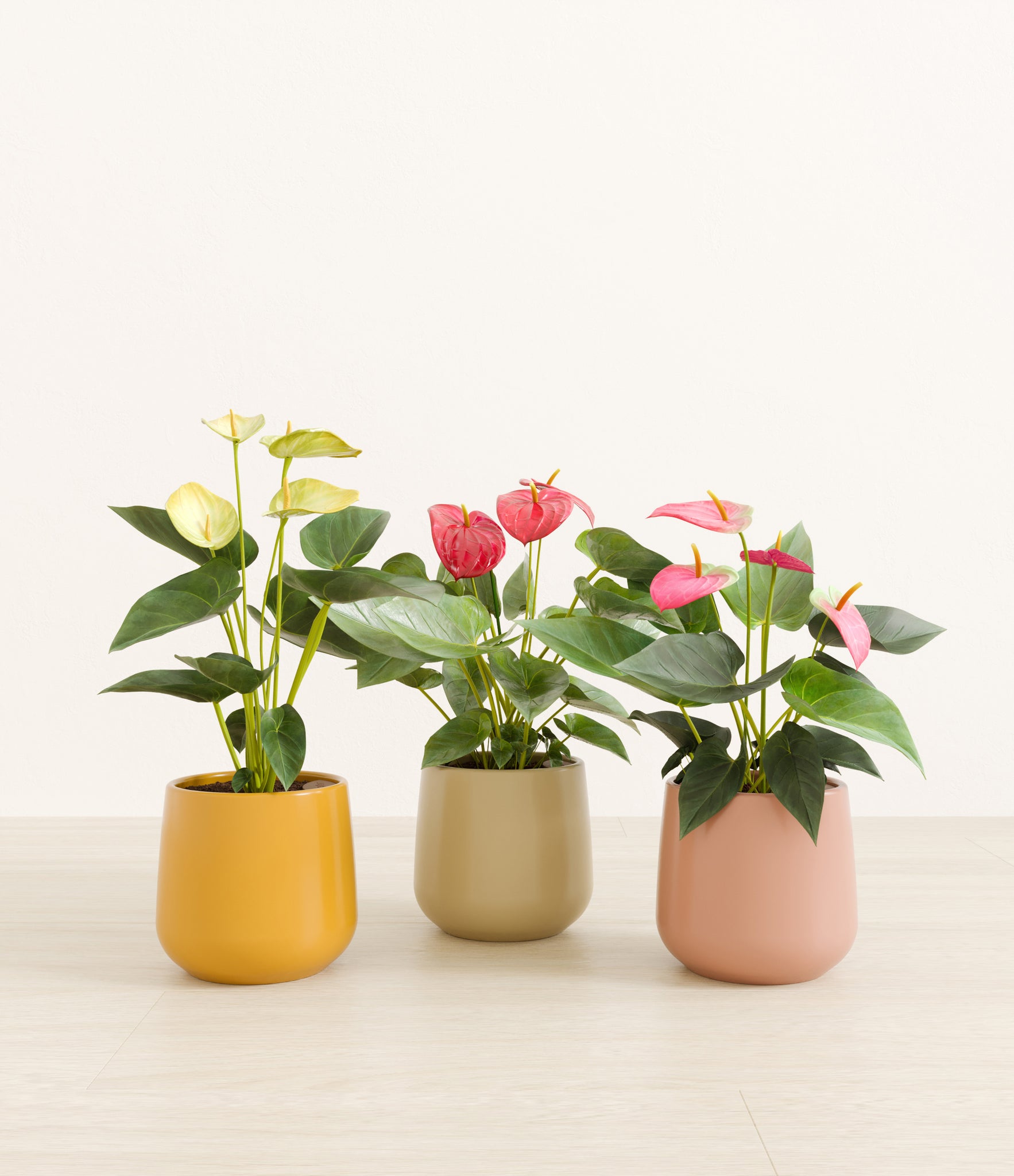 In this collection, you’ll receive a vibrant trio of flowering houseplants that instantly light up any space. The set includes a small Anthurium Red - a beloved classic, admired for its vivid, heart-shaped waxy leaves that symbolize generosity and joy; a small Anthurium Sweet Dreams, dressed in delicate pink spathes that whisper softness and affection; and a small Anthurium Yellow, with its rich yellow hues and striking upright blooms. Together, these three create a radiant and harmonious display of color, perfect for bringing life, charm, and a touch of romance into any room.