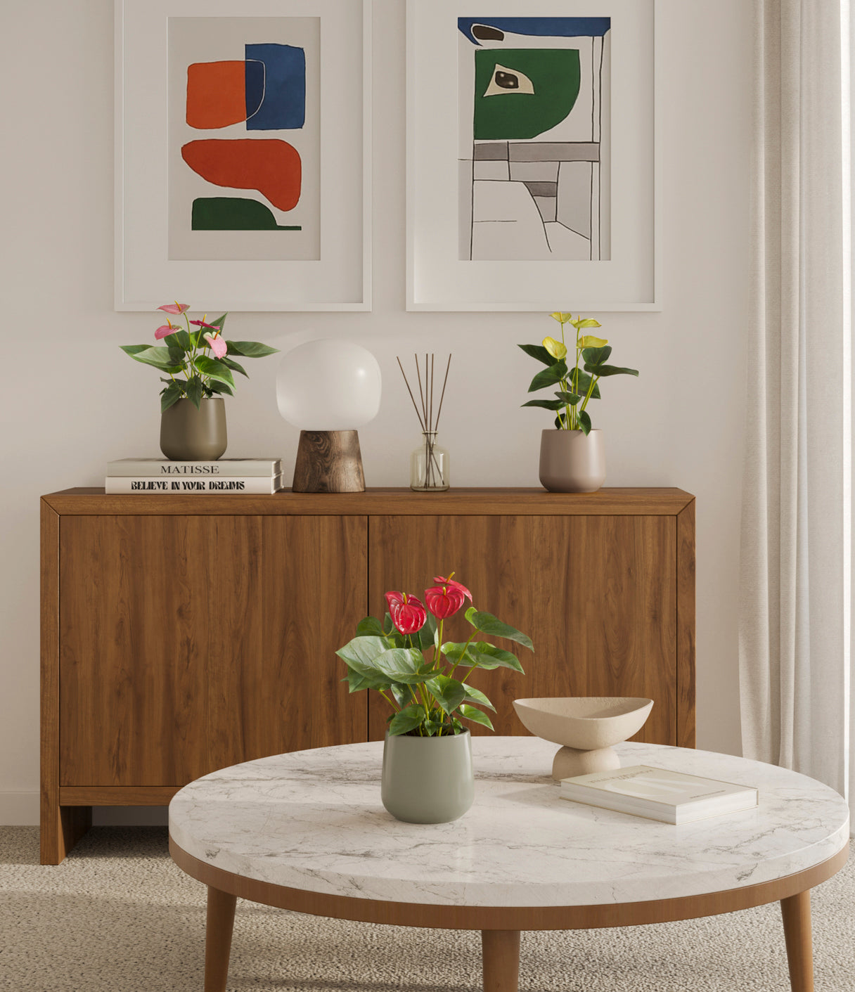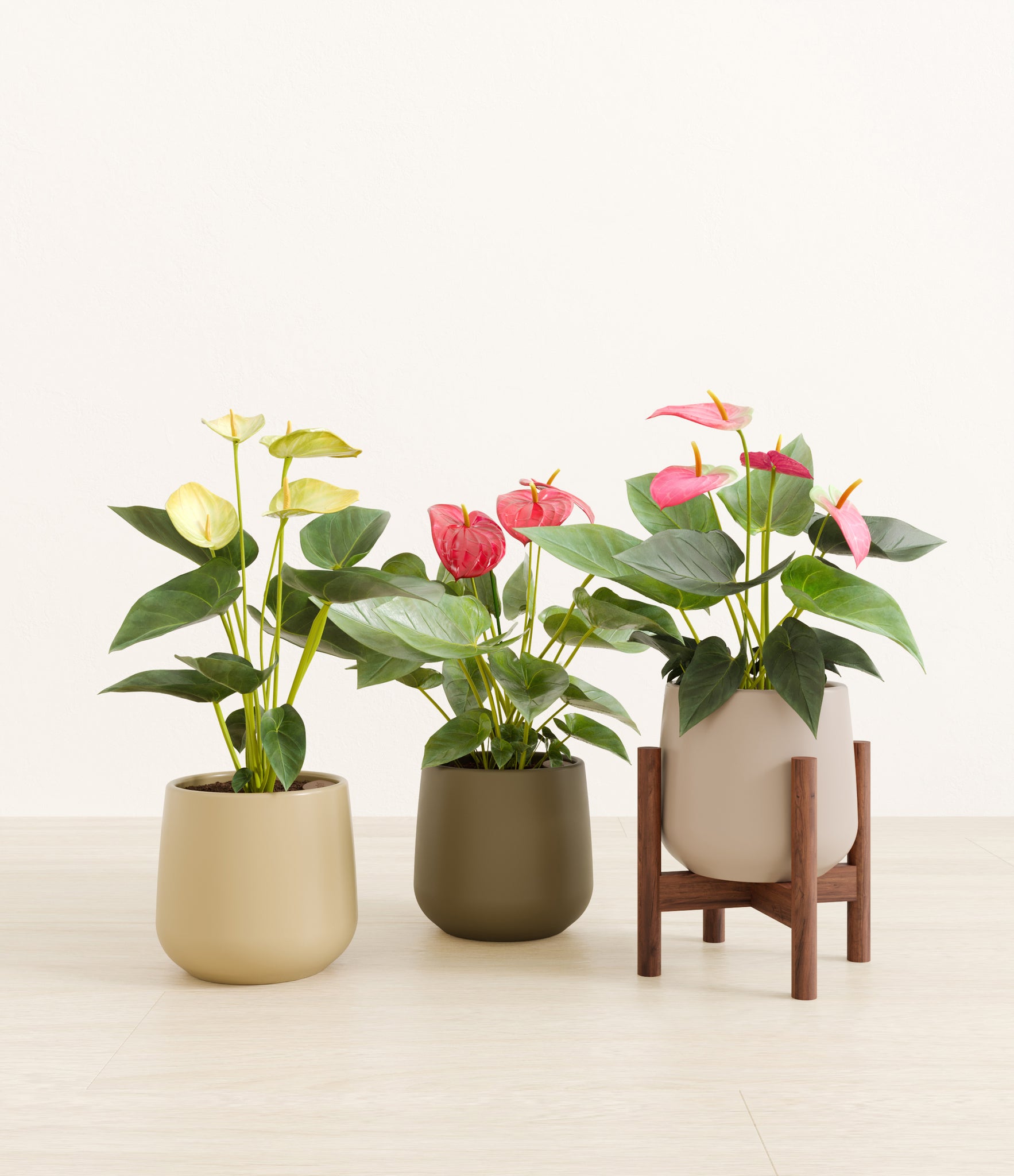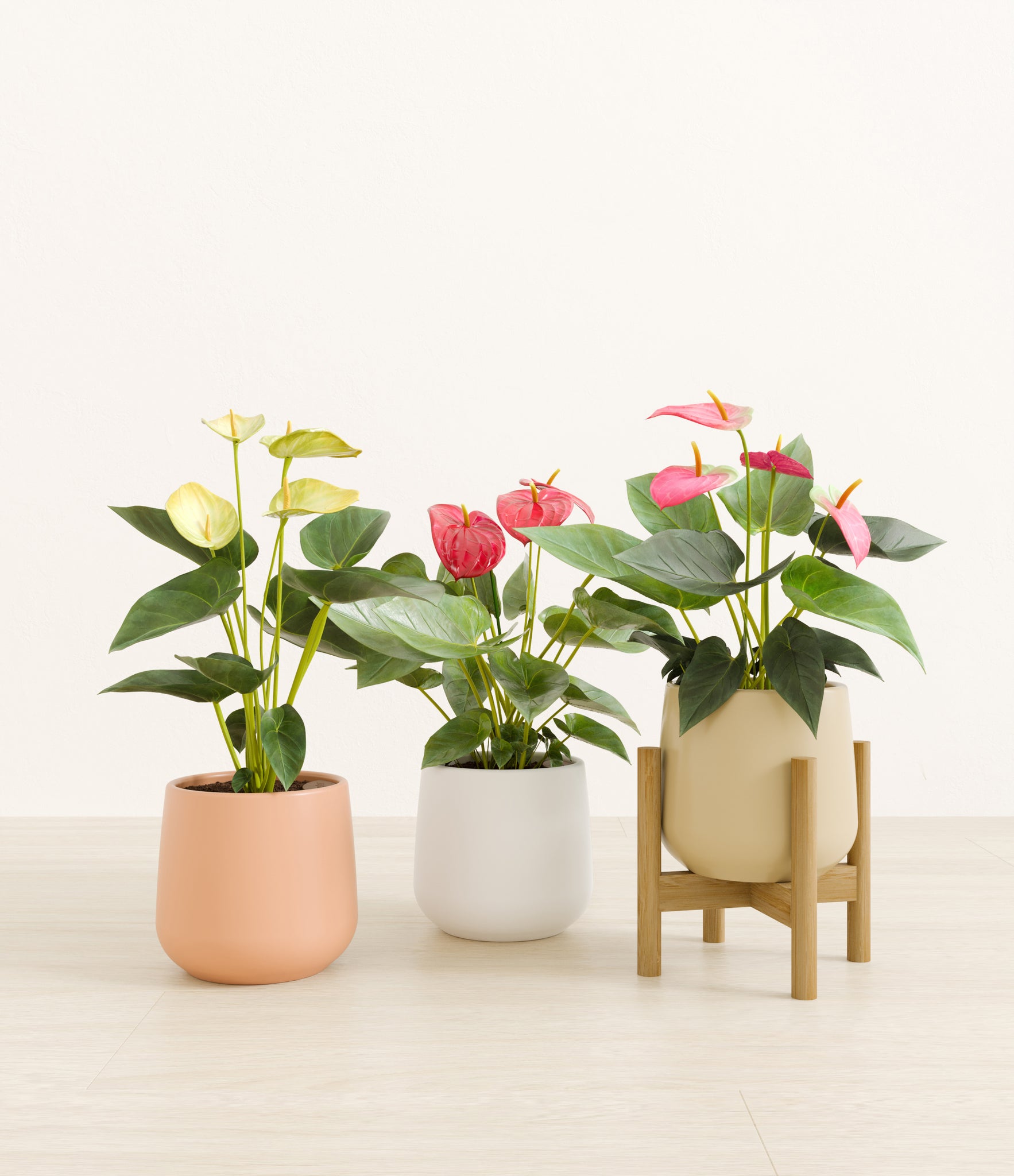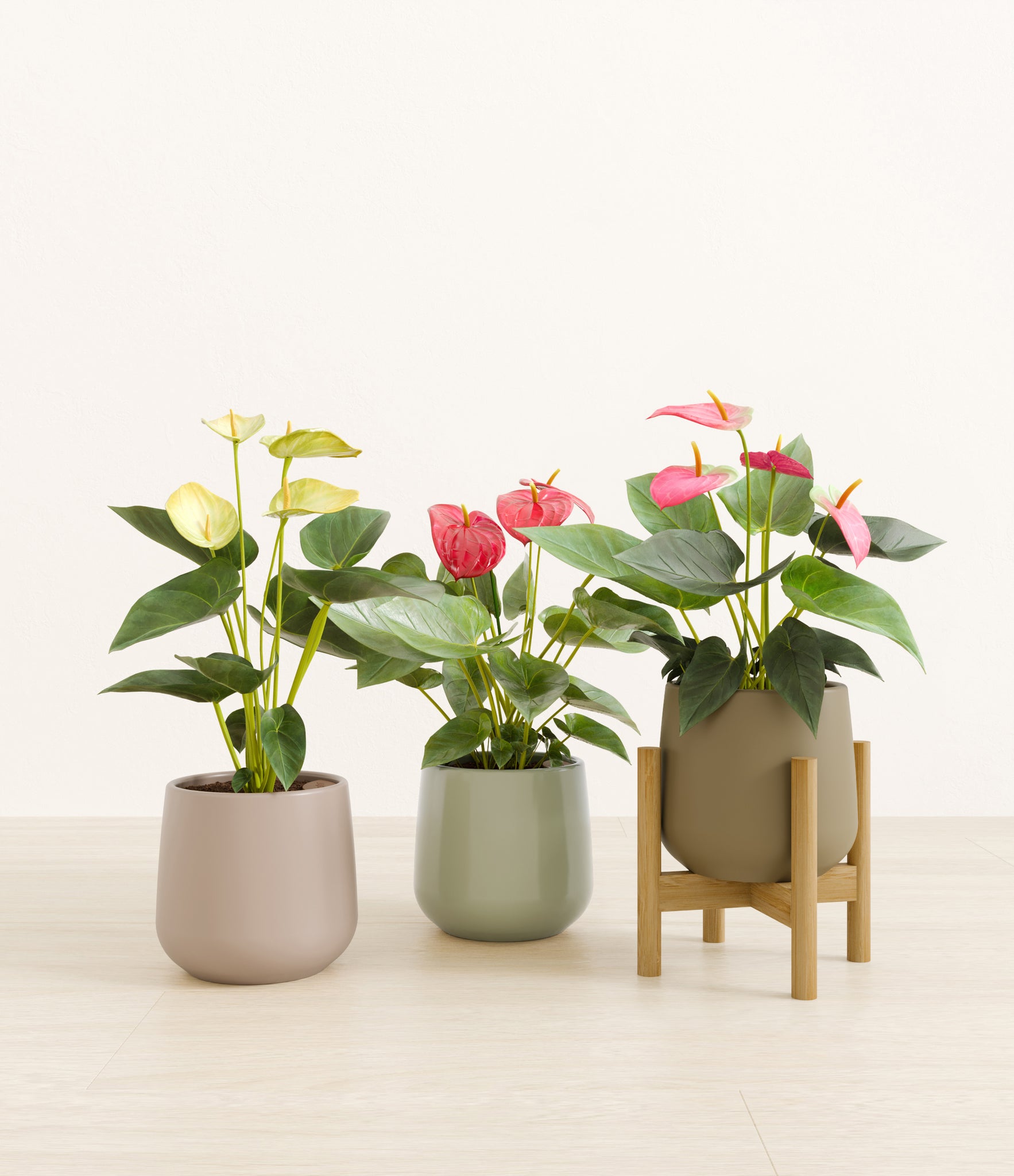 In this collection, you’ll receive a vibrant trio of flowering houseplants that instantly light up any space. The set includes a small Anthurium Red - a beloved classic, admired for its vivid, heart-shaped waxy leaves that symbolize generosity and joy; a small Anthurium Sweet Dreams, dressed in delicate pink spathes that whisper softness and affection; and a small Anthurium Yellow, with its rich yellow hues and striking upright blooms. Together, these three create a radiant and harmonious display of color, perfect for bringing life, charm, and a touch of romance into any room.