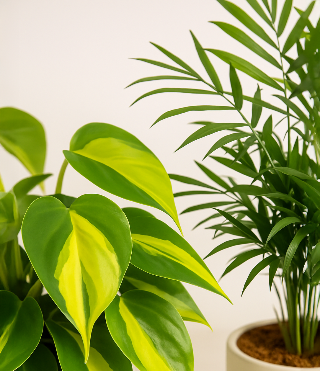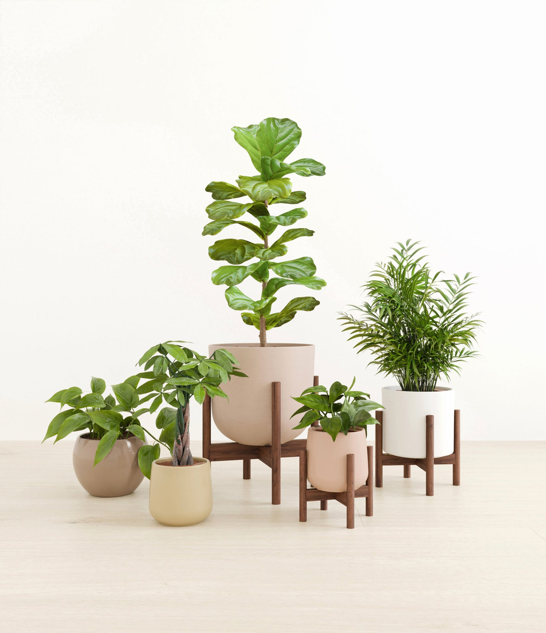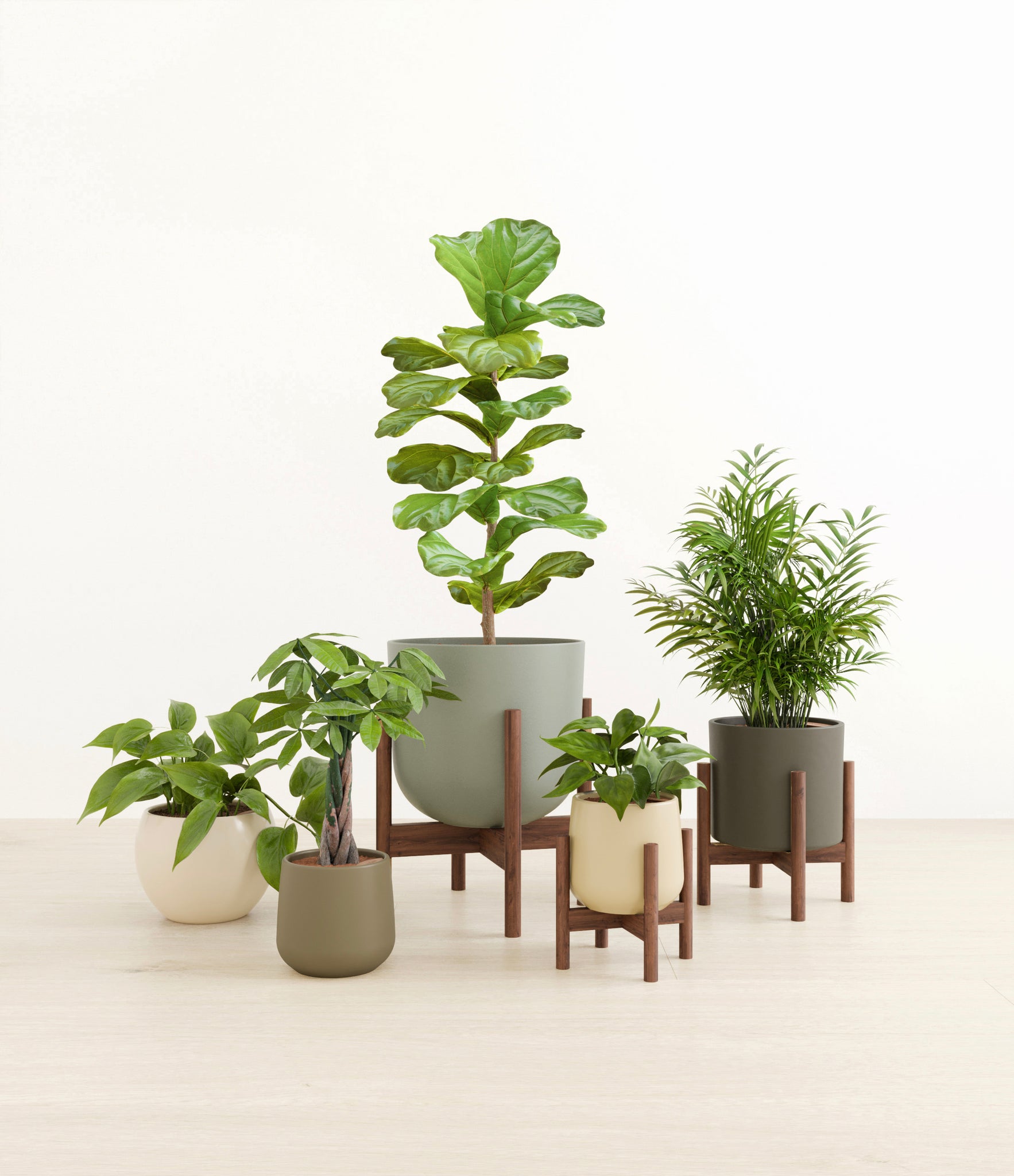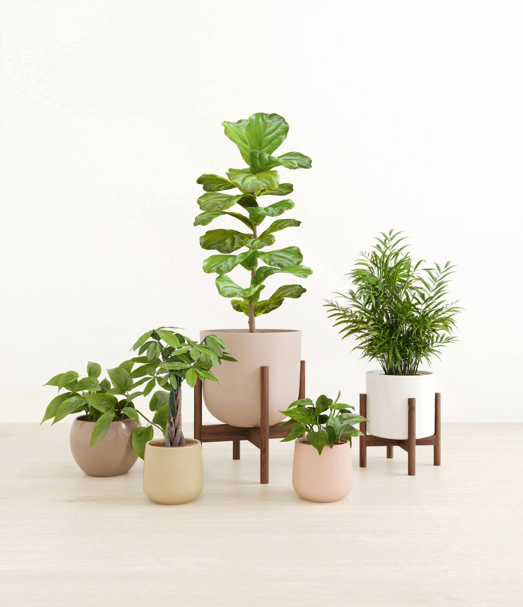In this collection, you'll receive five exquisite, easy-to-maintain houseplants that together, effortlessly elevate every space. The assortment includes a small Money Tree with leaves and a trunk symbolizing good fortune and prosperity; a small Heartleaf Philodendron – wearing glossy, forest green heart-shaped foliage; a medium Parlor Palm – a must-have centerpiece that requires little light to deliver absolute radiance; a medium Philodendron Brazil filled with lime colored variegation on its heart-shaped foliage; and a large Fiddle Leaf Fig Bush with massive and vibrant green lyre-shaped leaves.