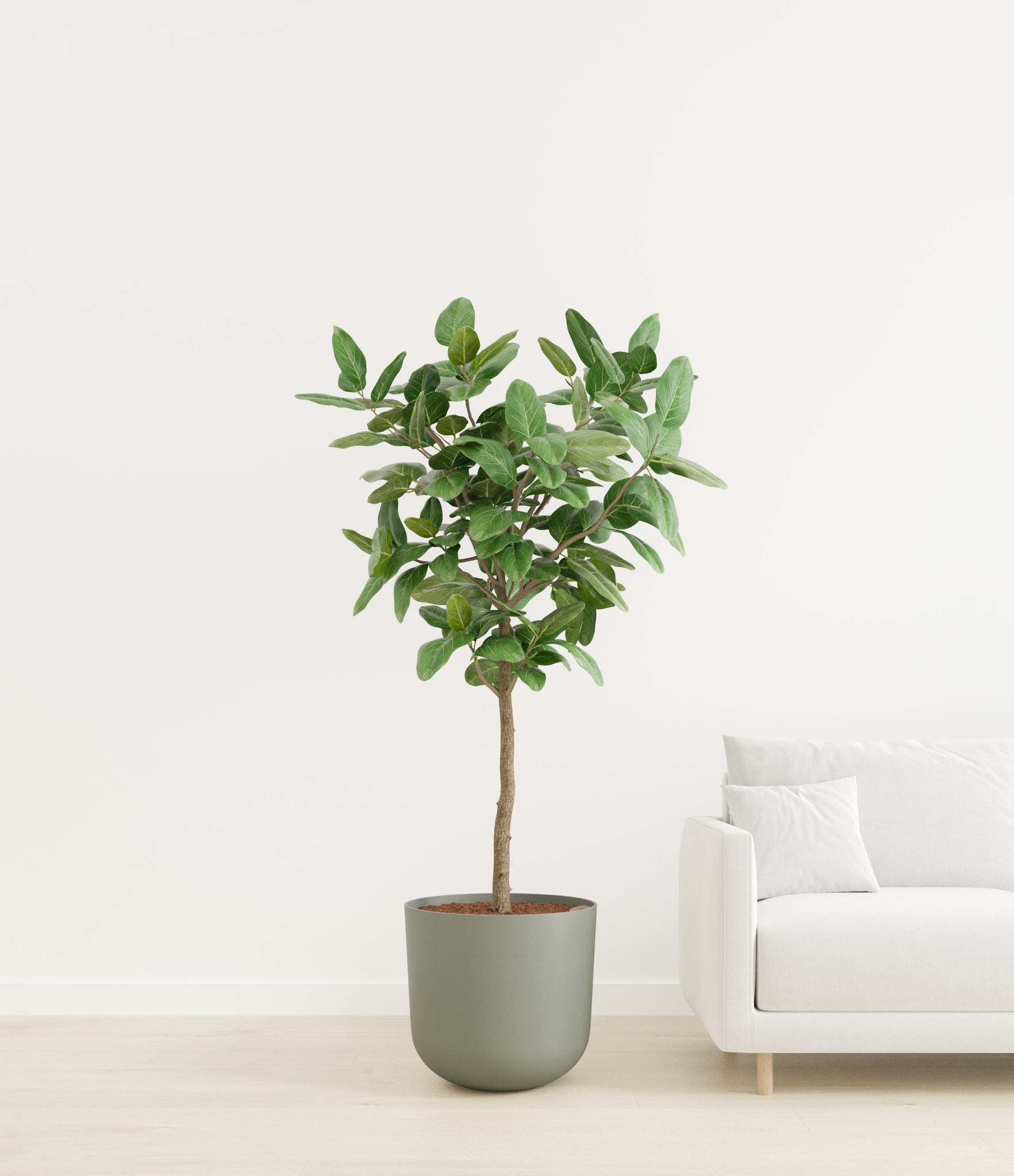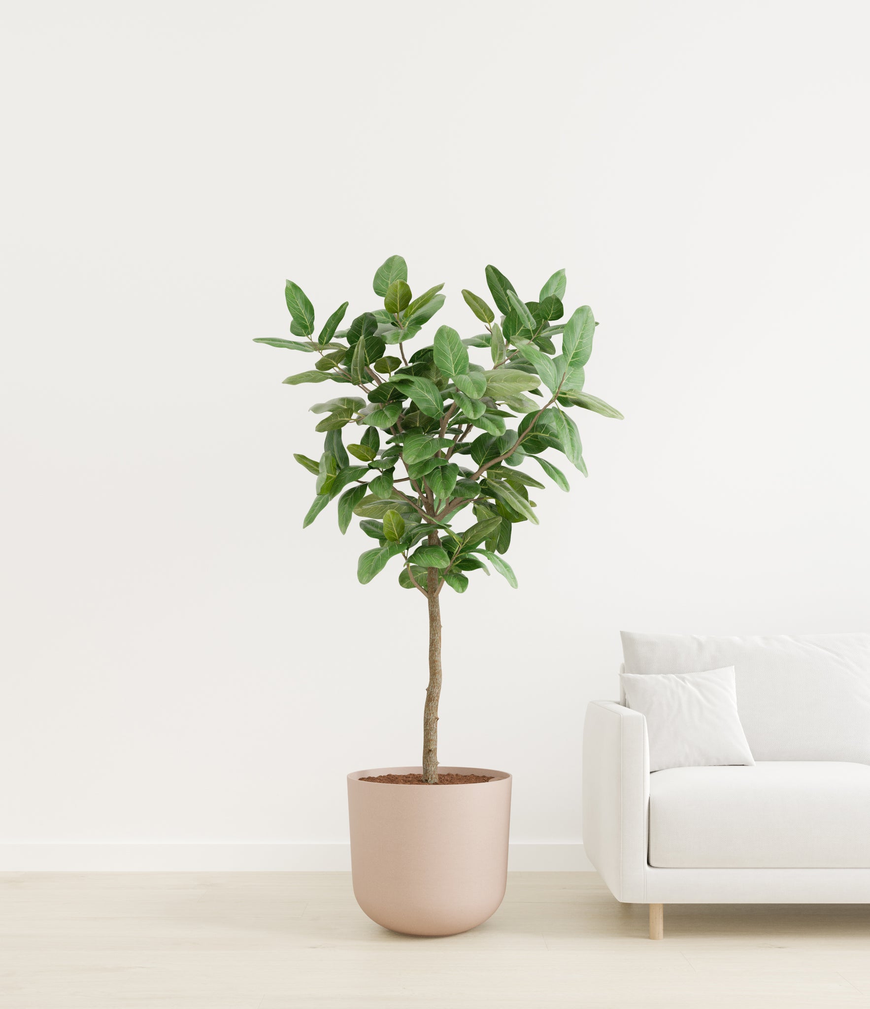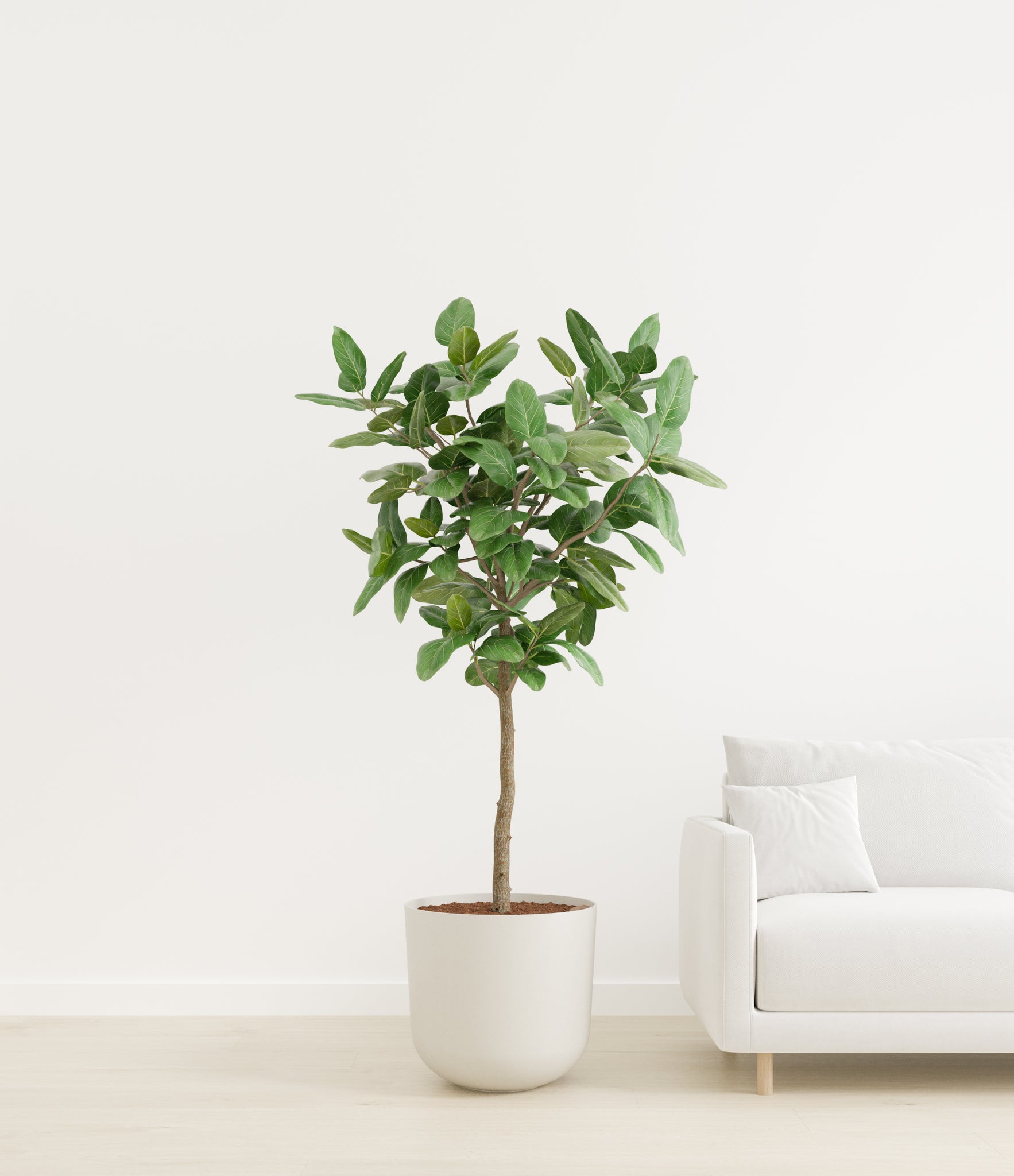 The elegant Ficus Audrey is the national tree of India. In its natural habitat, its beautiful canopy can cover tremendous ground and provide great shade in its warm climate, but indoors, it can also just as easily grow straight and tall. And while its light colored trunk and velvet emerald leaves certainly earned it love and respect, this magical plant is best known for its low-maintenance and “forgiving” nature.