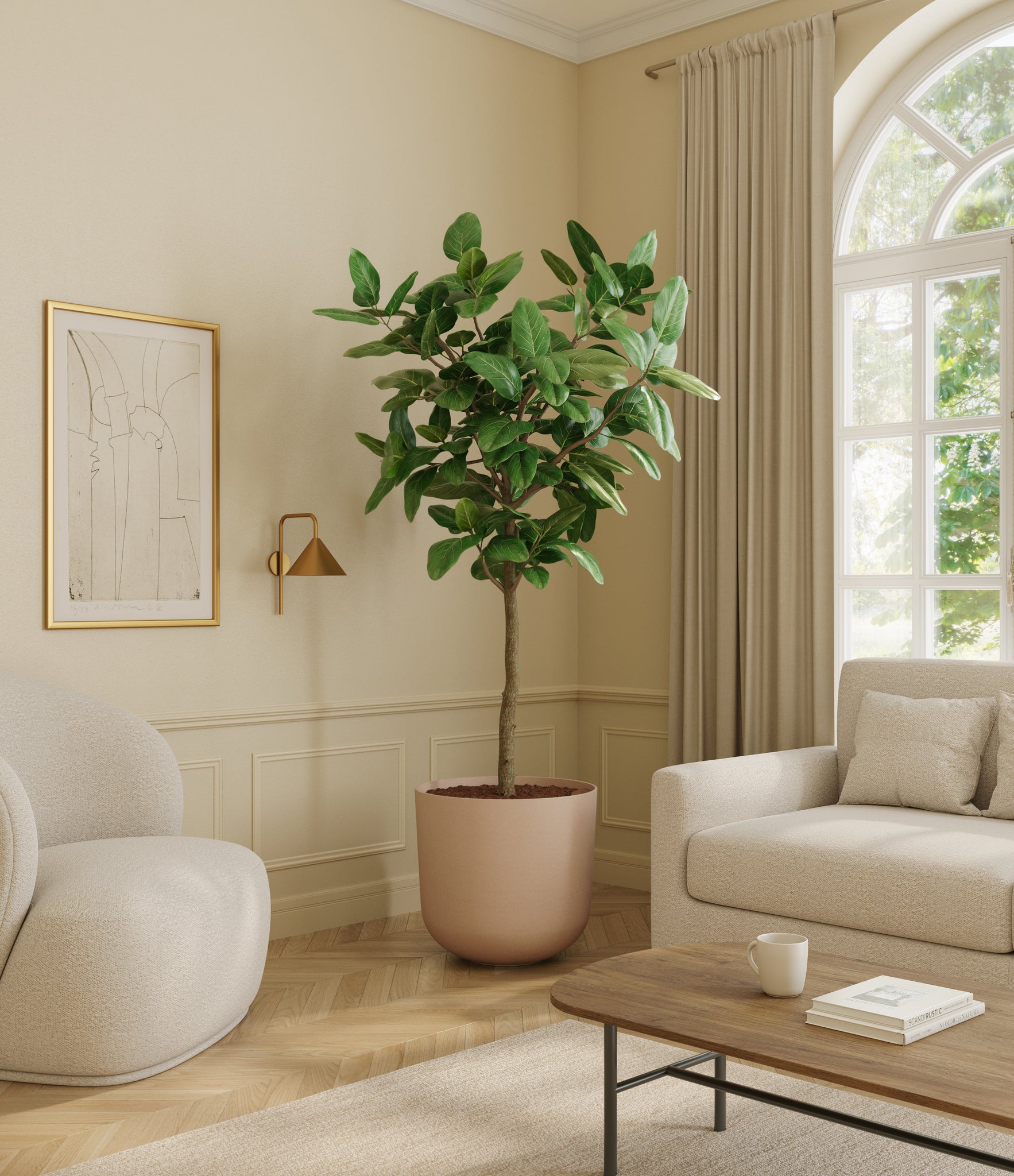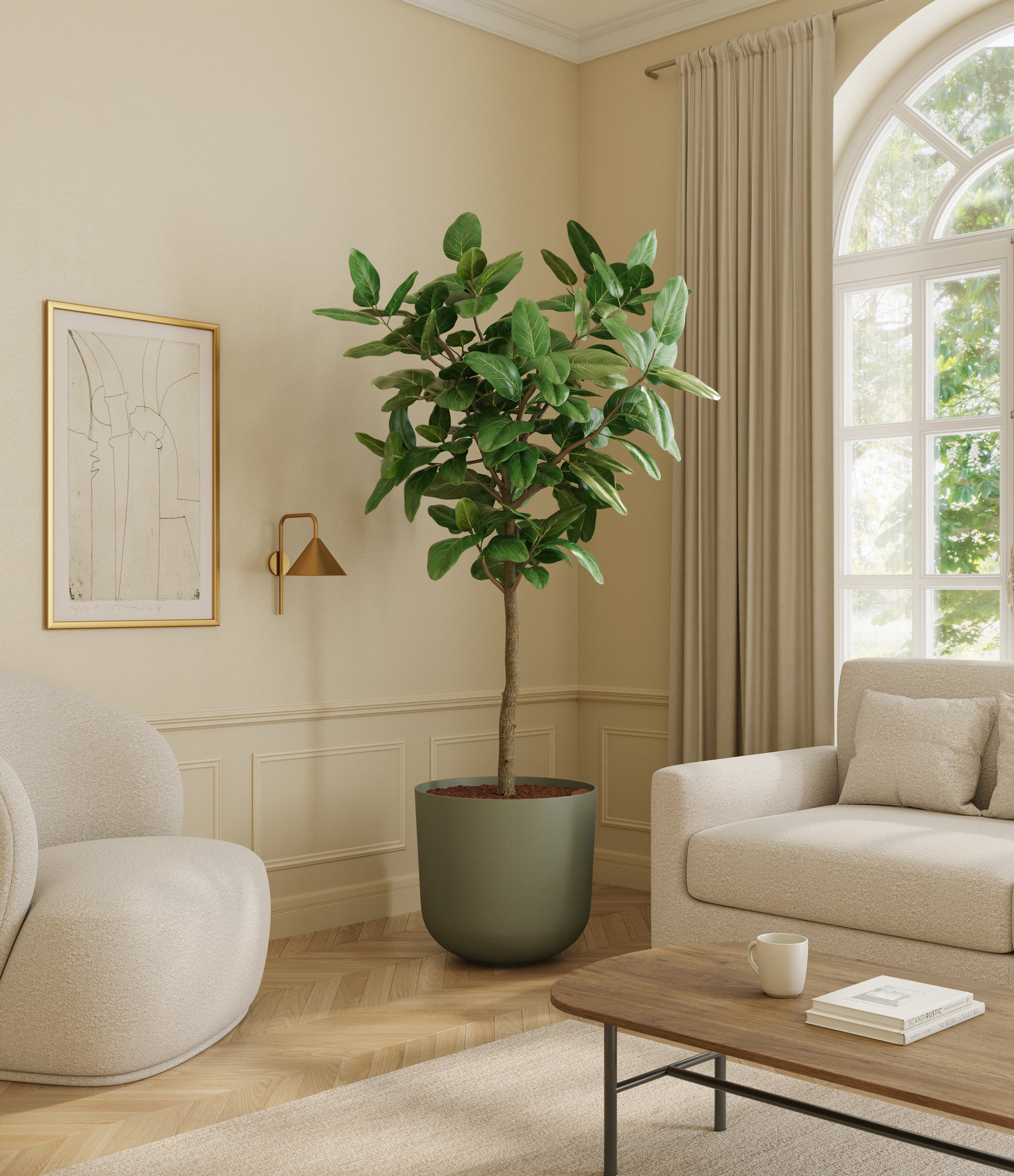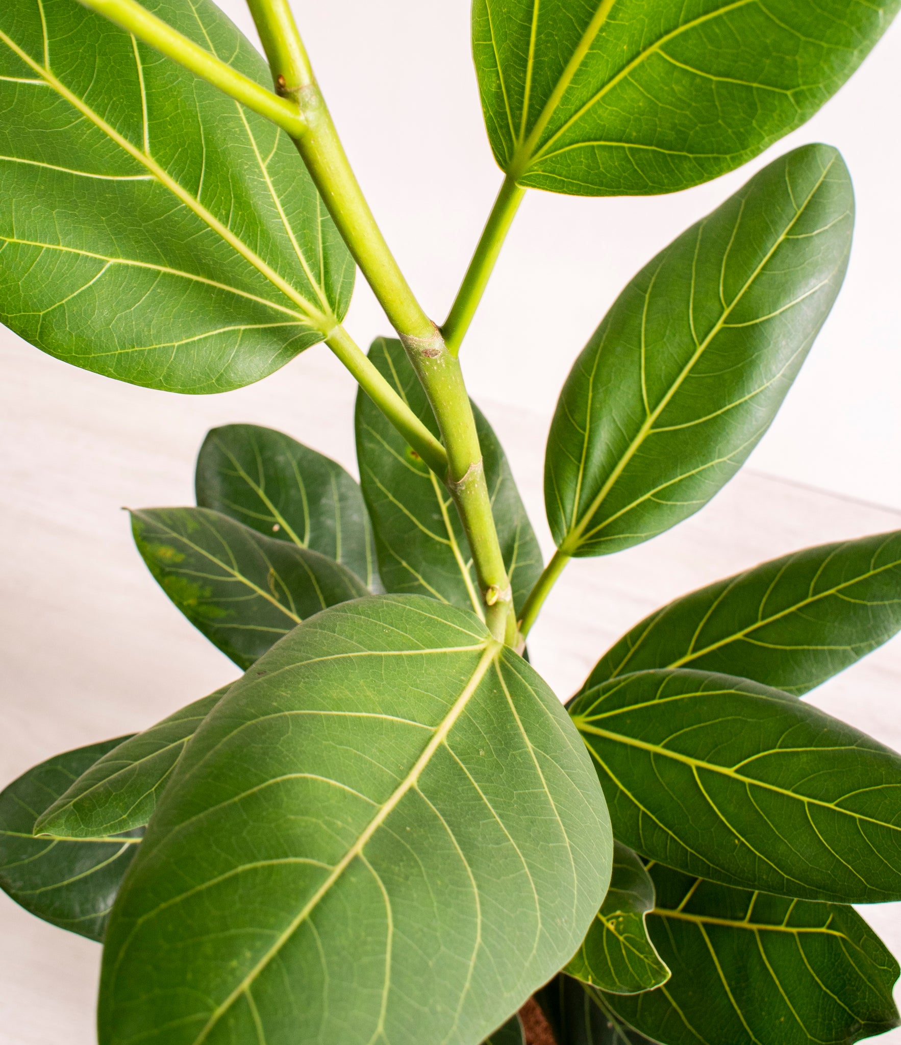 The elegant Ficus Audrey is the national tree of India. In its natural habitat, its beautiful canopy can cover tremendous ground and provide great shade in its warm climate, but indoors, it can also just as easily grow straight and tall. And while its light colored trunk and velvet emerald leaves certainly earned it love and respect, this magical plant is best known for its low-maintenance and “forgiving” nature.