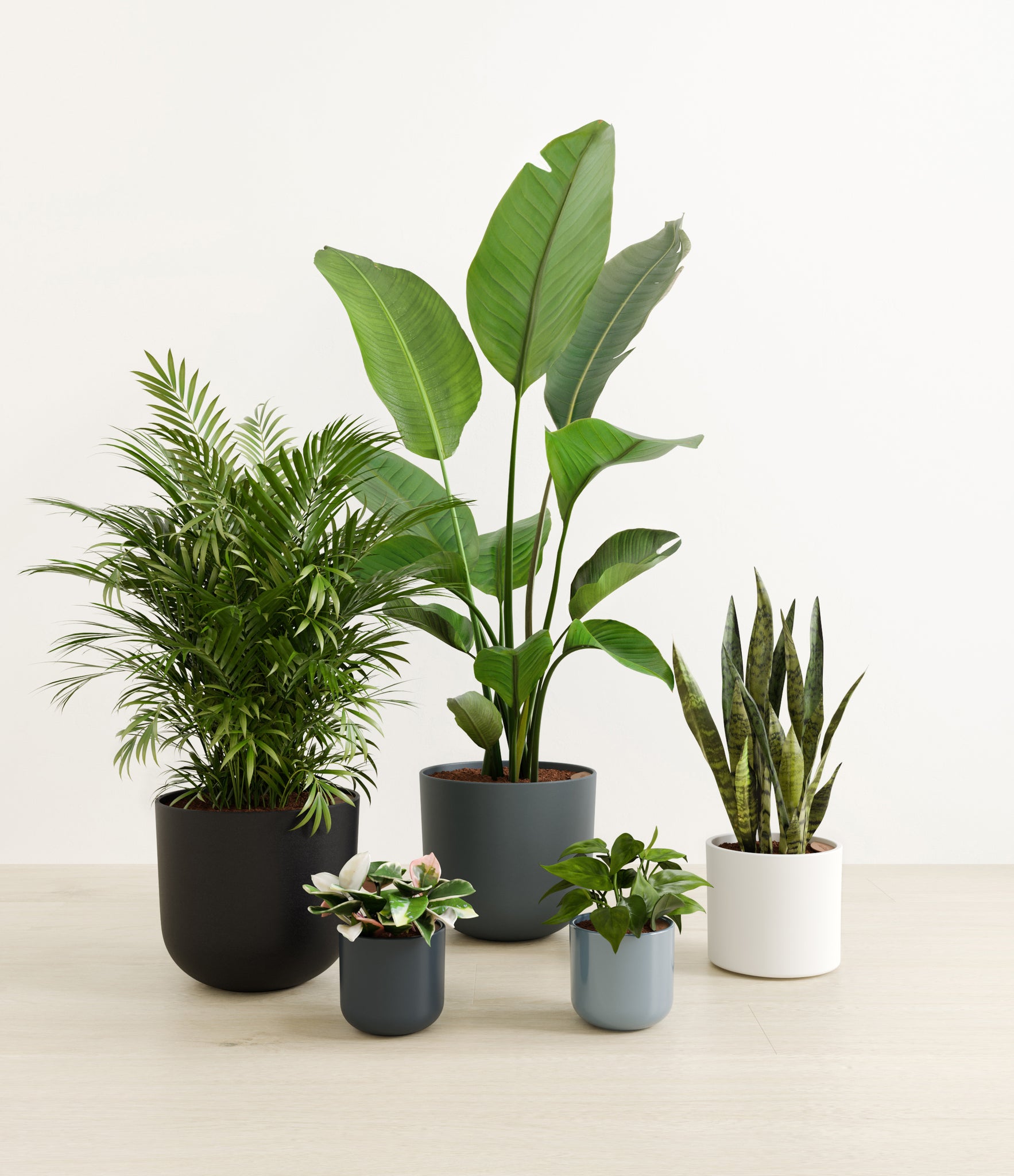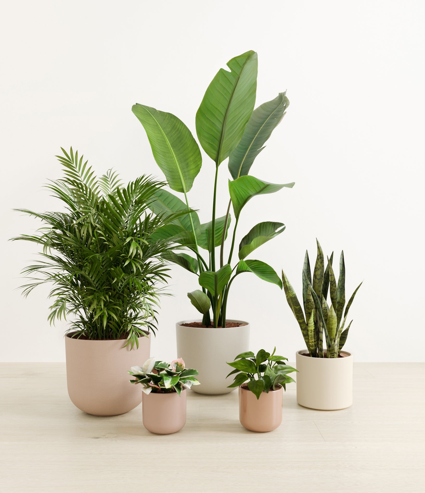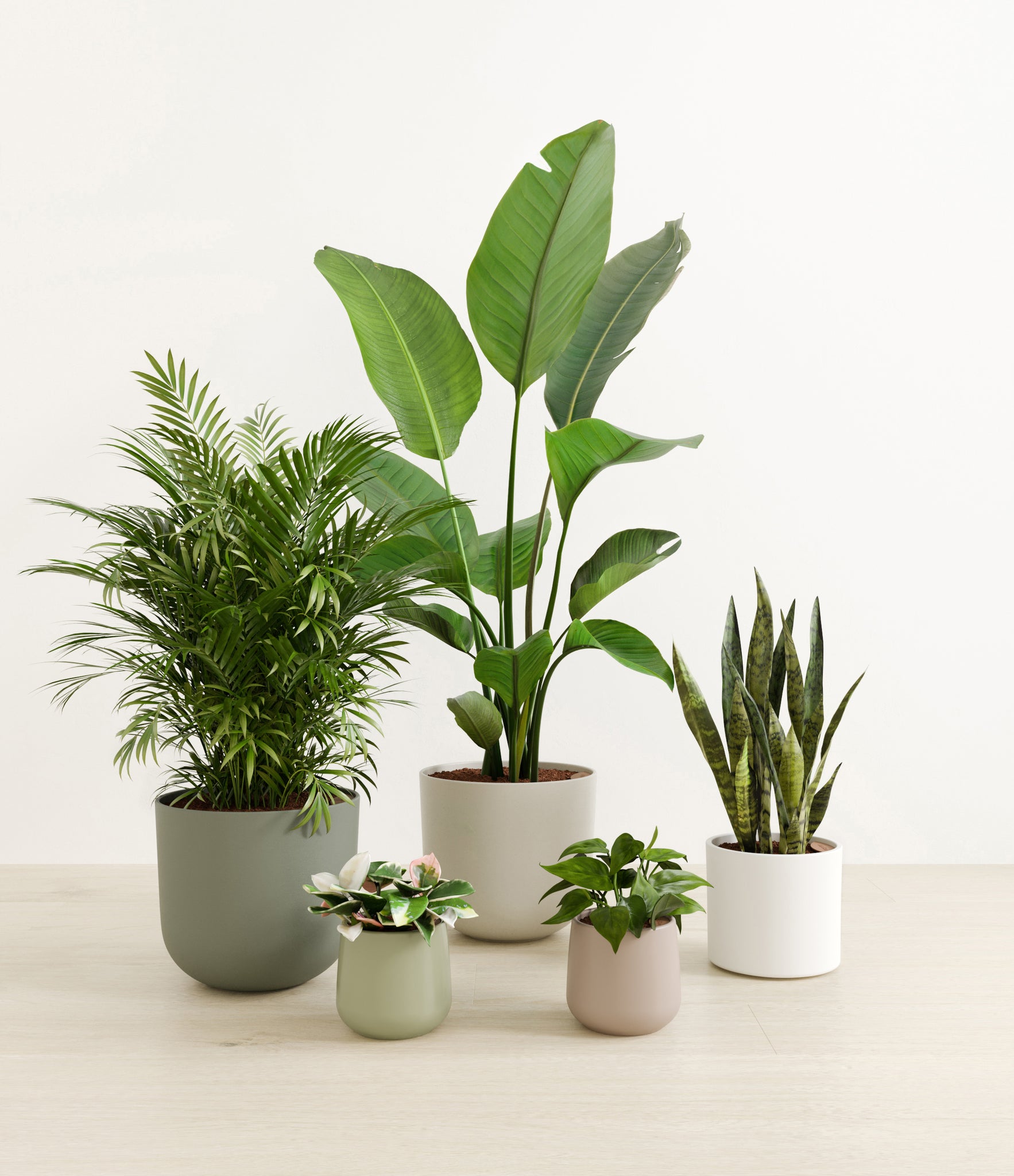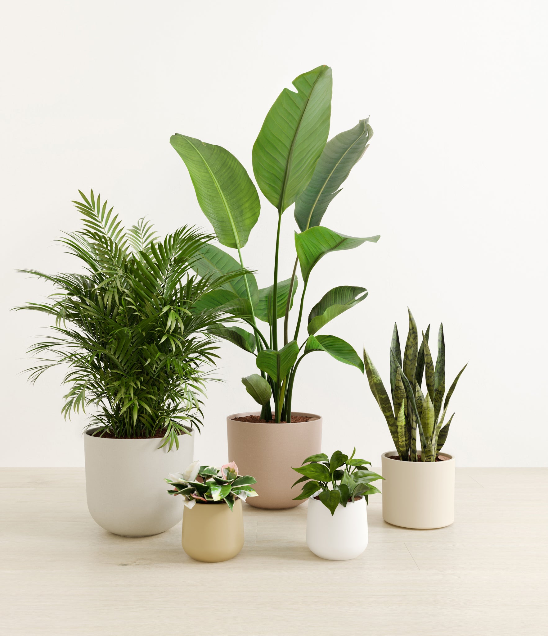 In this collection, you'll receive a carefully curated set of five unique houseplants that instantly make any space more lively and festive. The assortment includes a small Hoya Tri-Color, wearing variegations of pink and white on waxy, forest green leaves; a small Heartleaf Philodendron - one of the hardiest and most beautiful plants – with glossy, vibrant heart-shaped foliage; a medium Green Snake Plant with mesmerizing swatches of silver and sage; a large Parlor Palm, known as the traditional centerpiece of the most impressive room in the house; and a huge White Bird of Paradise that playfully hangs like birds in flight.