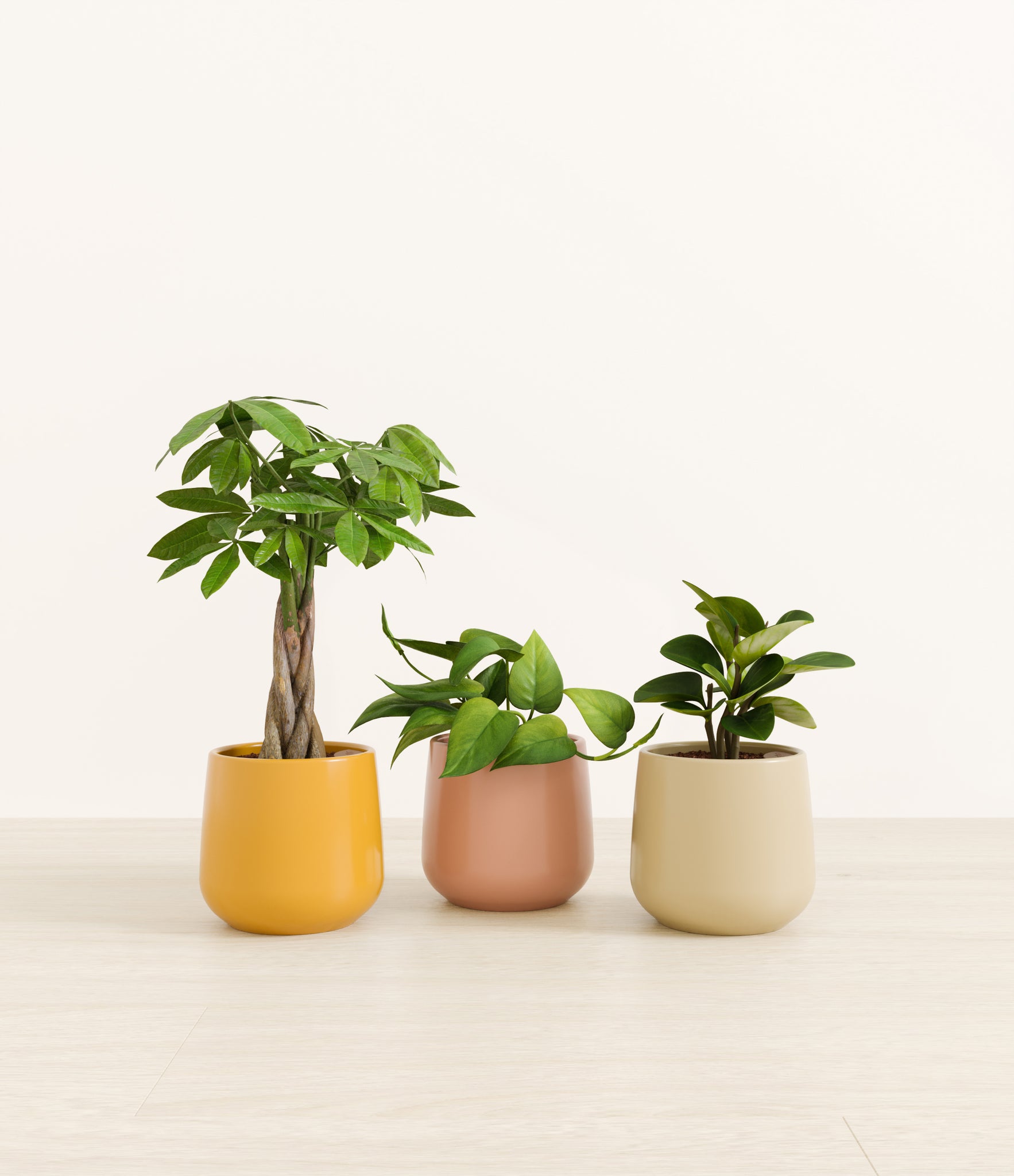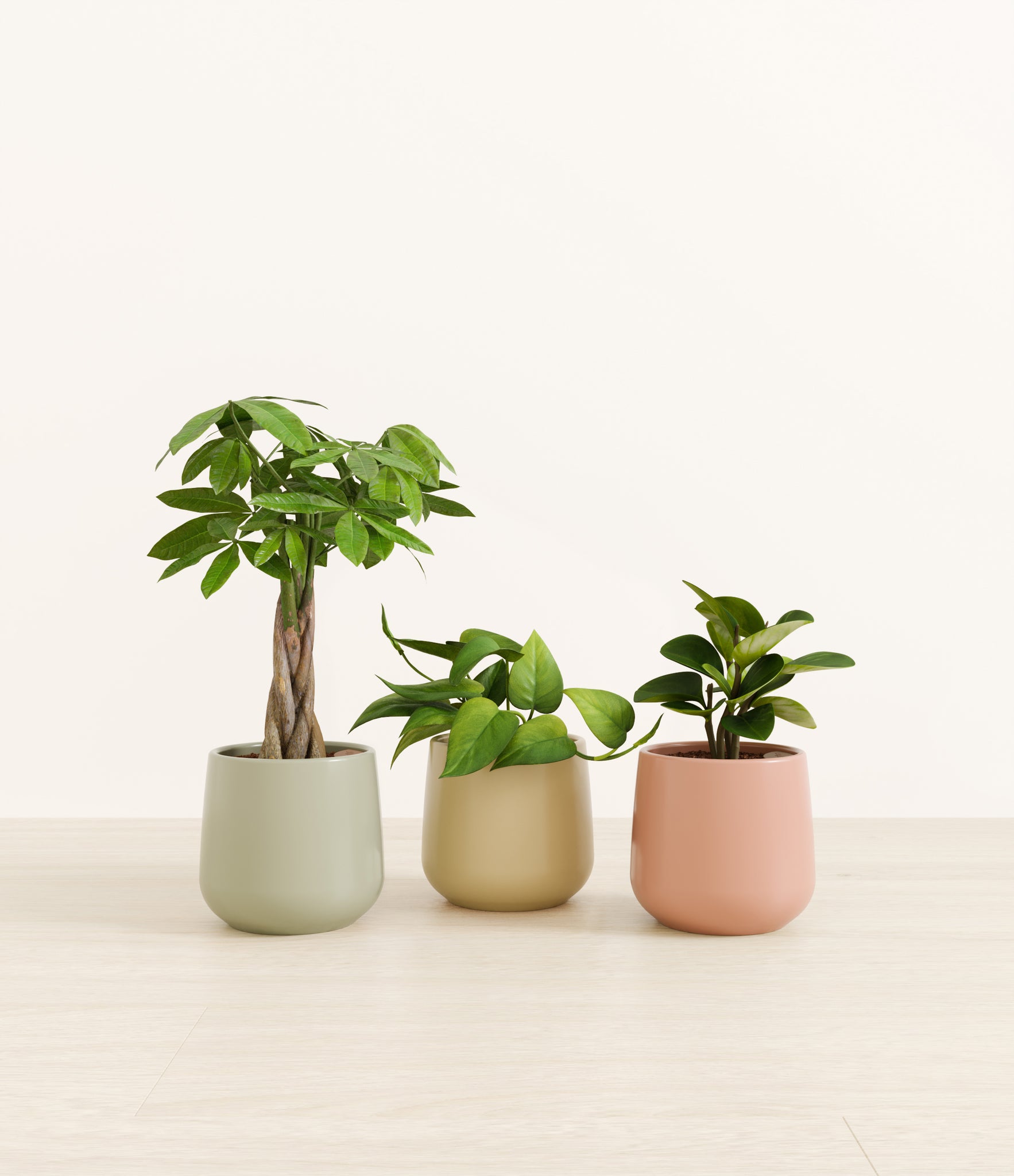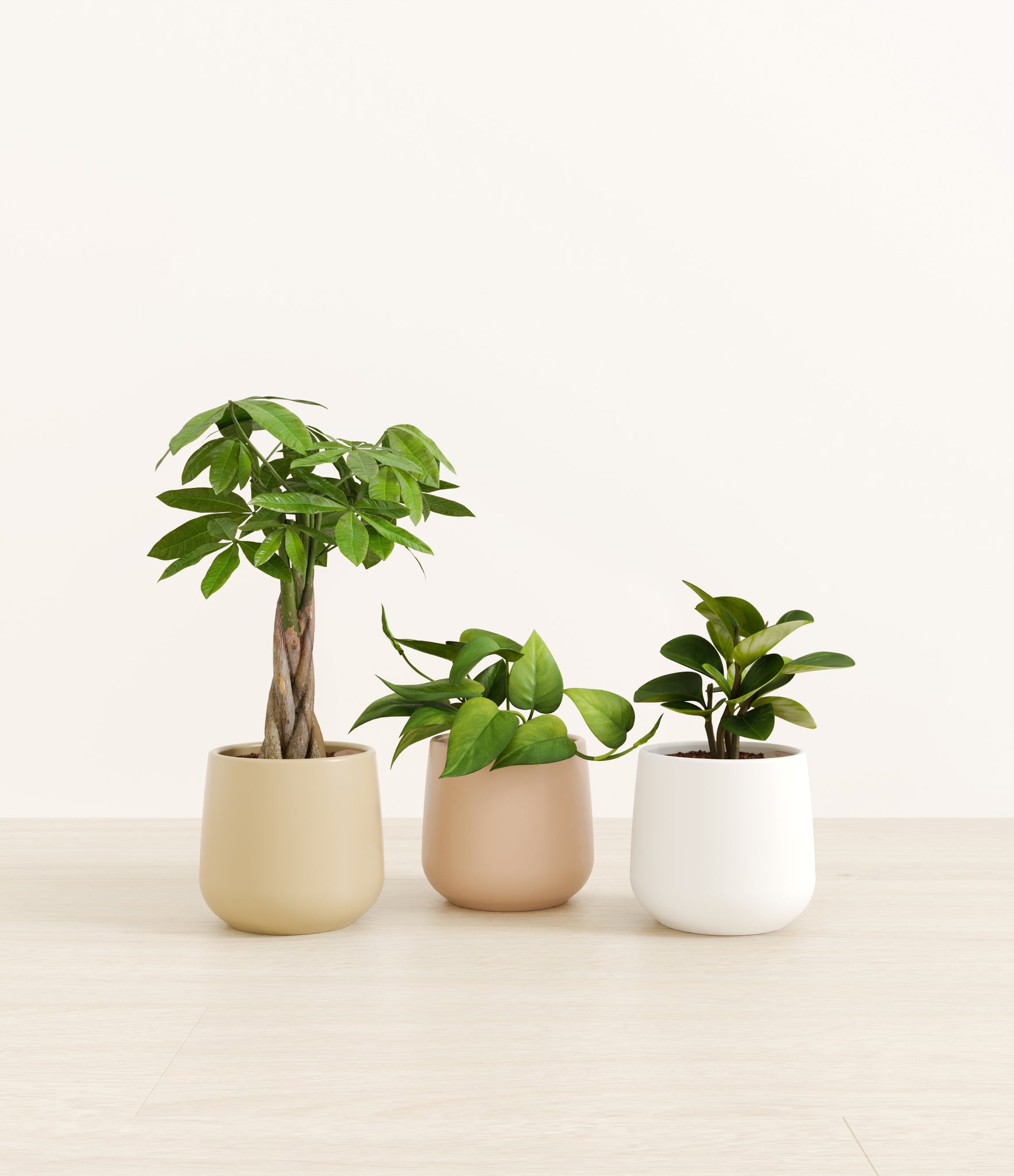 In this warm, inviting trio, you’ll receive three small houseplants that bring balance, texture, and vitality to any space. The set includes a small Money Tree, cherished for its braided trunk and lush green leaves that symbolize good fortune; a small Jade Pothos, admired for its cascading vines and rich, glossy foliage; and a small Peperomia, a compact beauty with textured leaves that add a soft touch of charm. Together, they create a harmonious display that radiates natural abundance and timeless appeal.