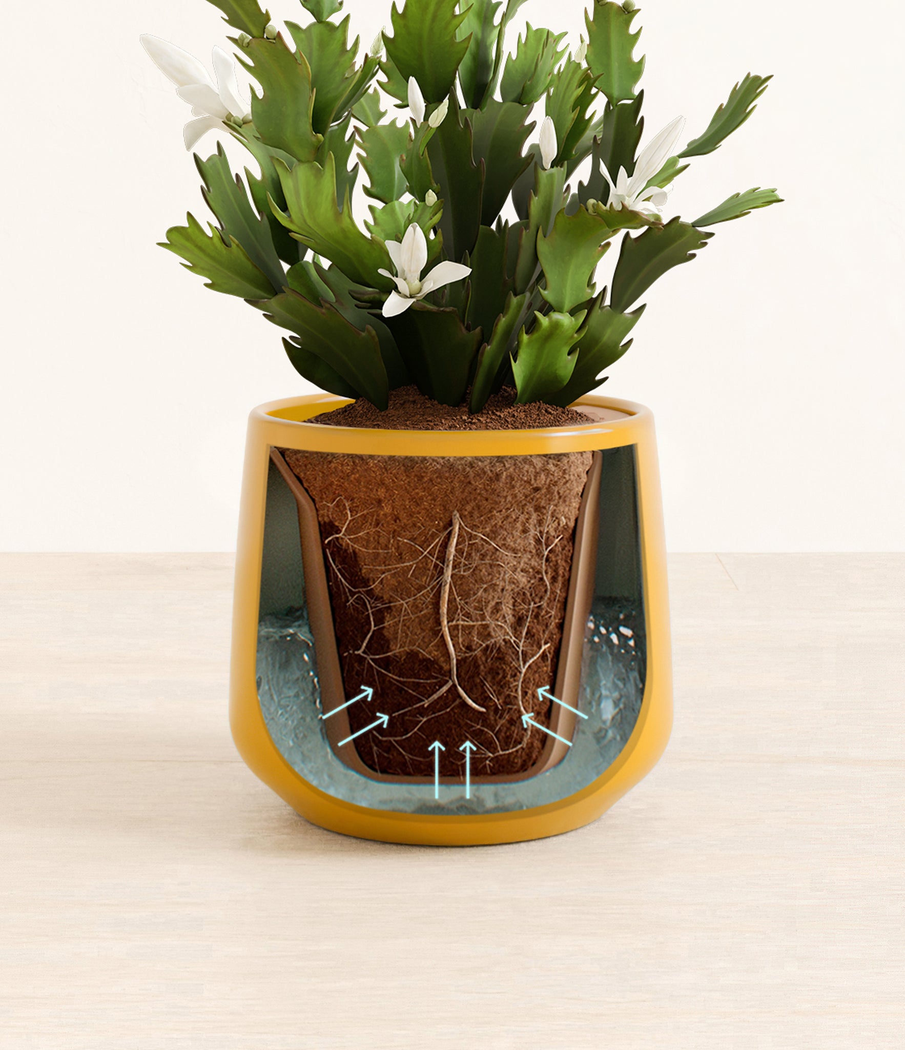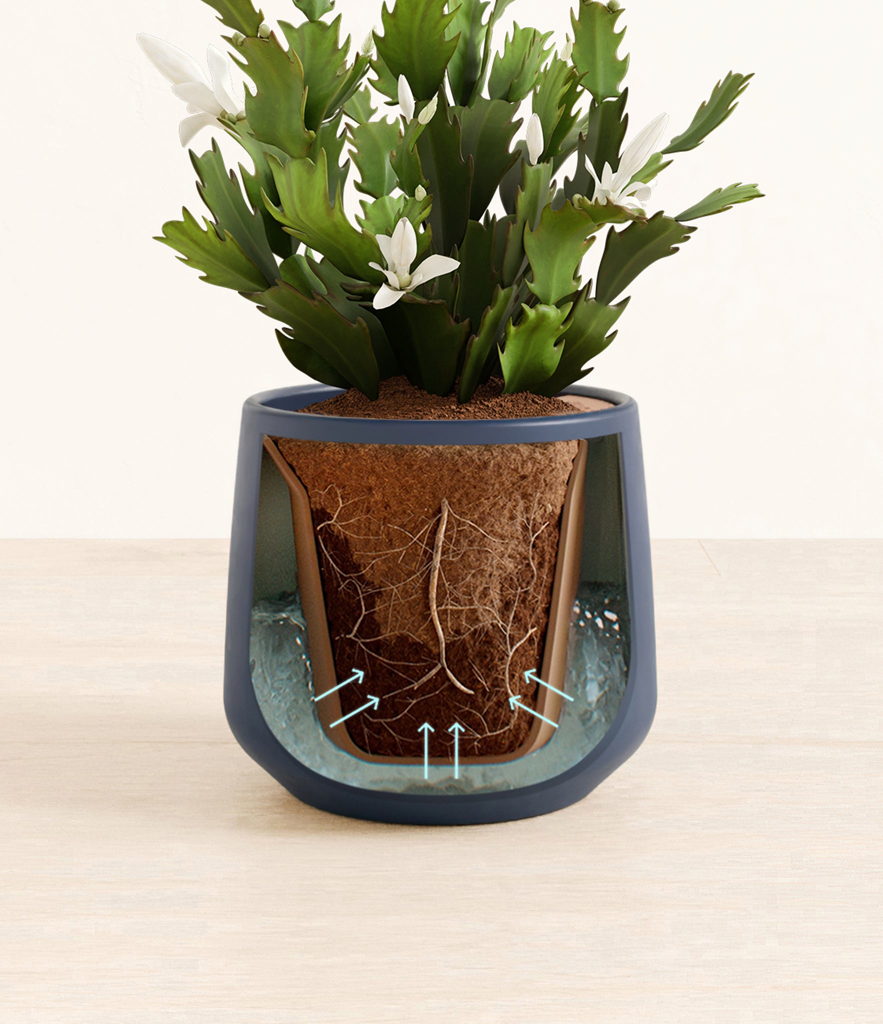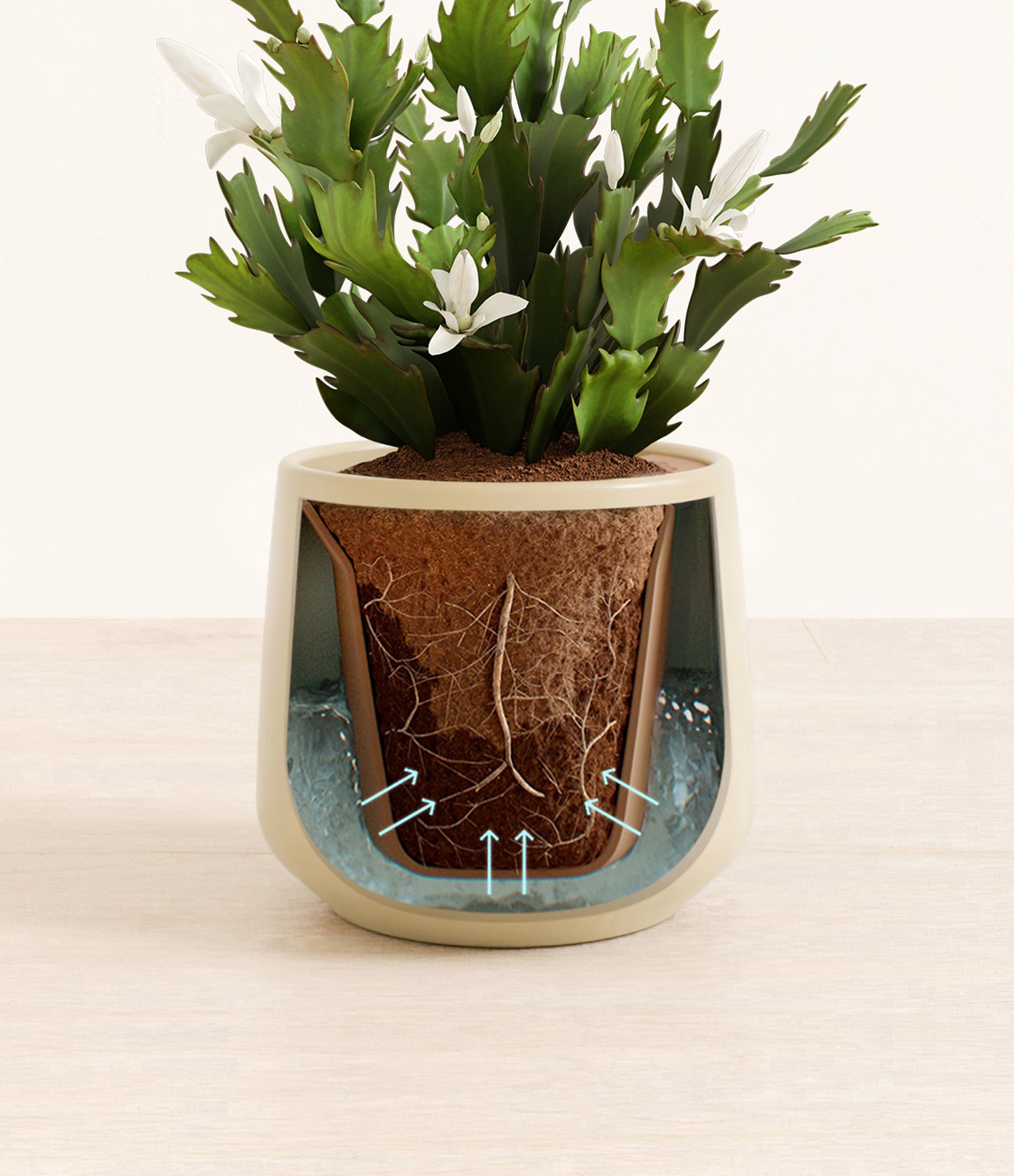 From the lush highlands of Brazil, the Holiday Cactus, also known as Schlumbergera truncata, is a captivating herald of joy with its vibrant white flowers that bloom in late fall, embodying the festive spirit of the holidays. The blooms may exhibit subtle changes in tone as they mature, offering a dynamic and evolving display of beauty throughout the season. Potted in an easyplant self-watering pot, this effortlessly elegant and surprisingly easy-to-care-for plant will offer a burst of life as the year winds down, making it not just a plant but a cherished part of your holiday tradition.