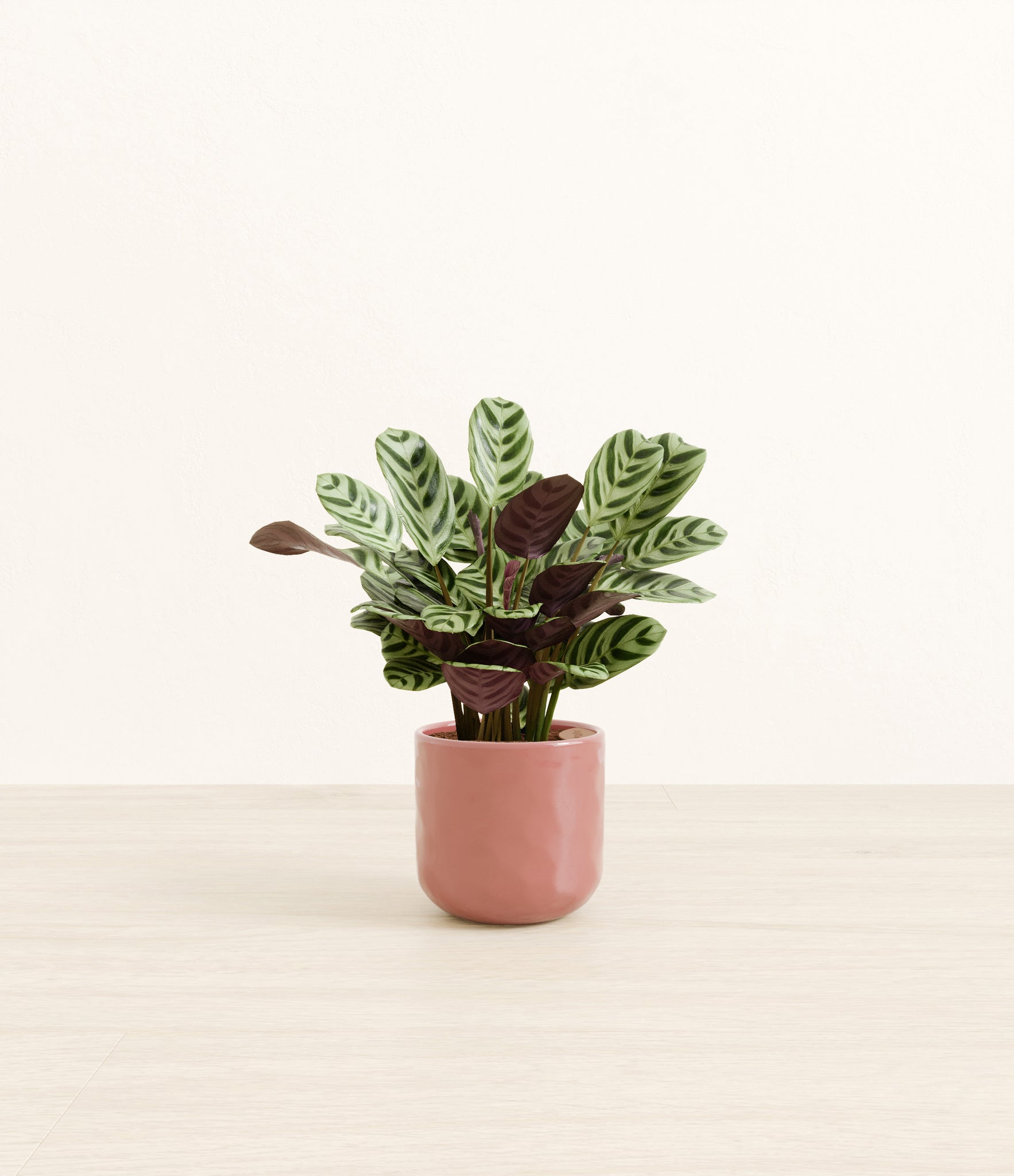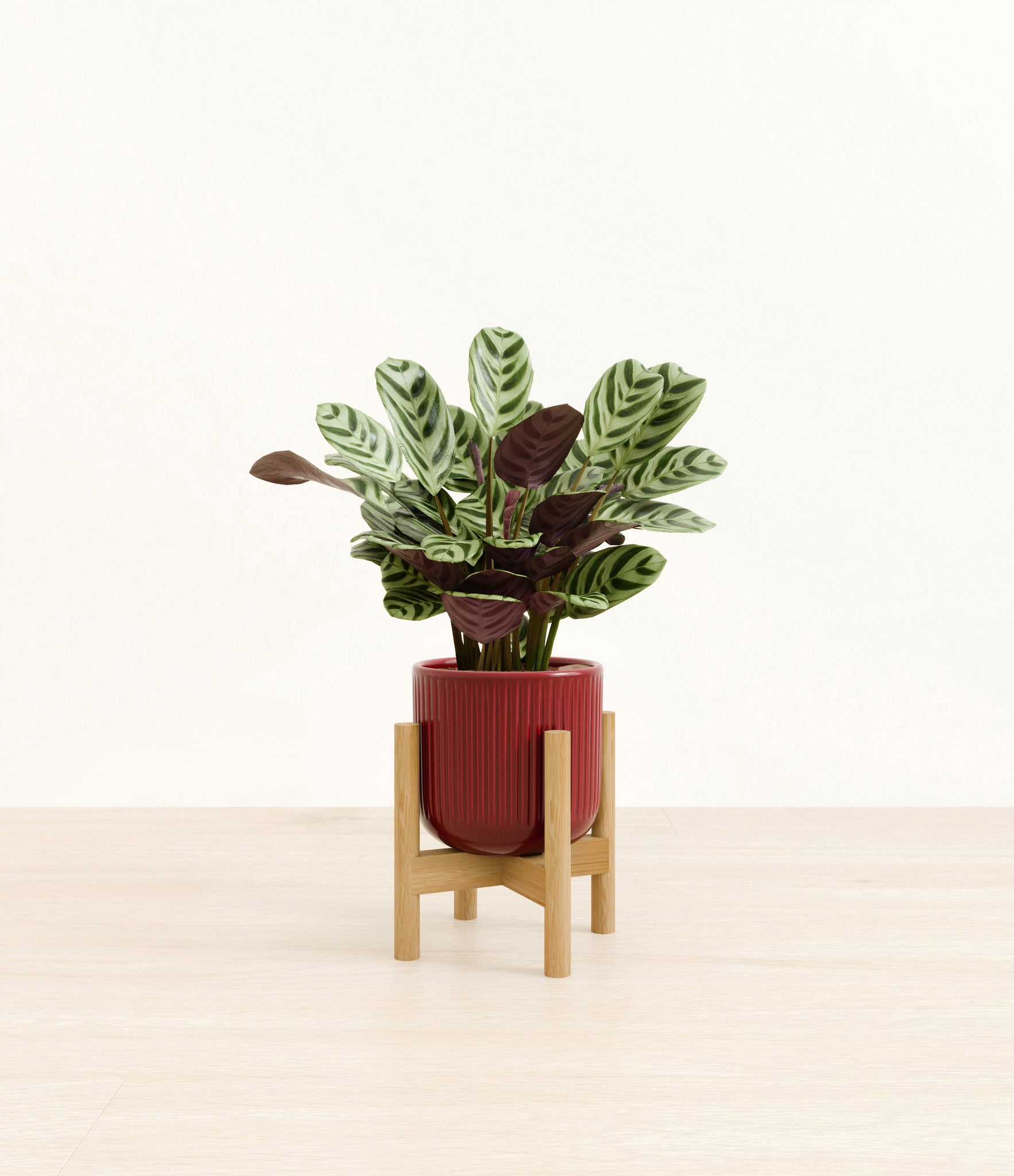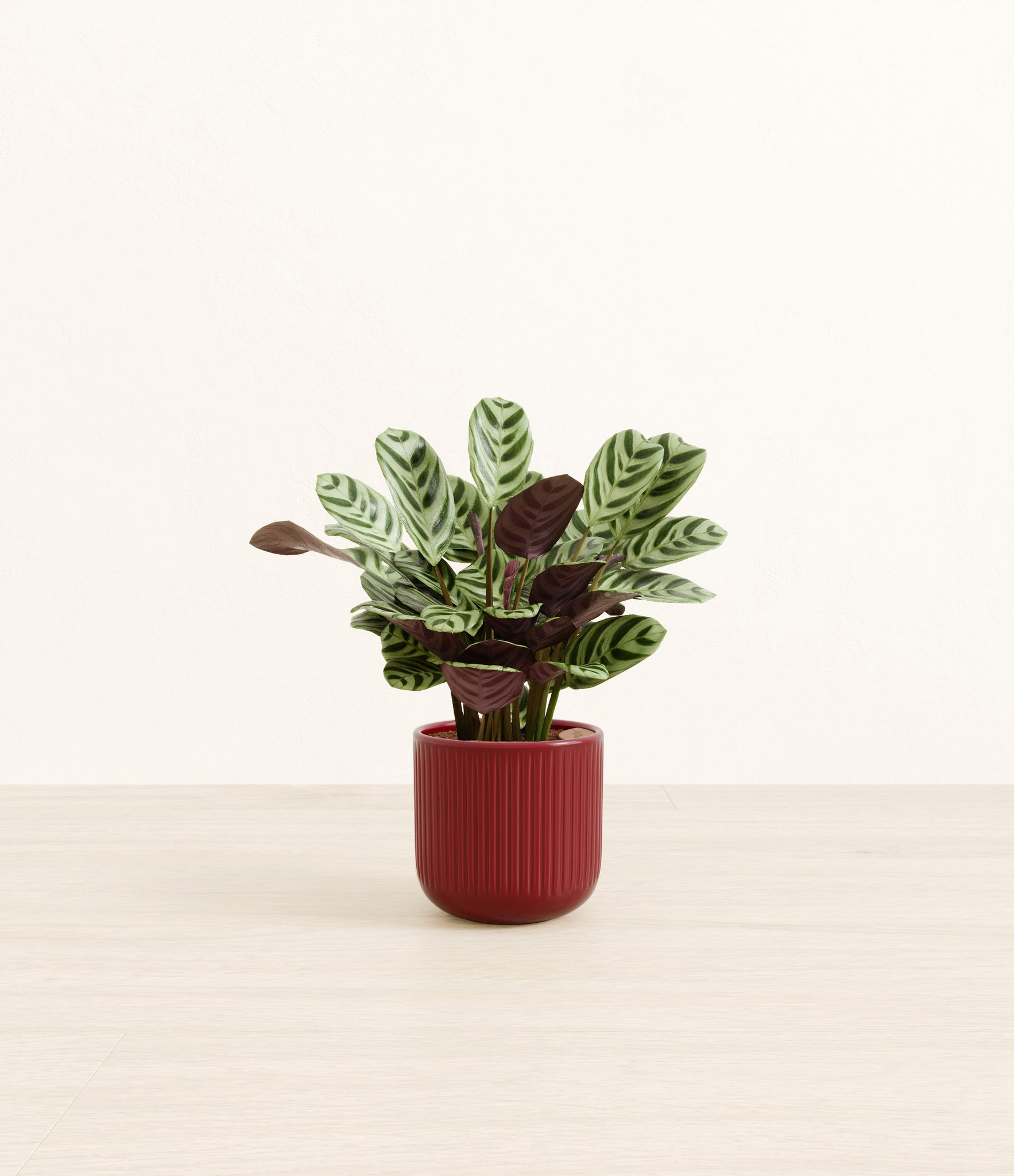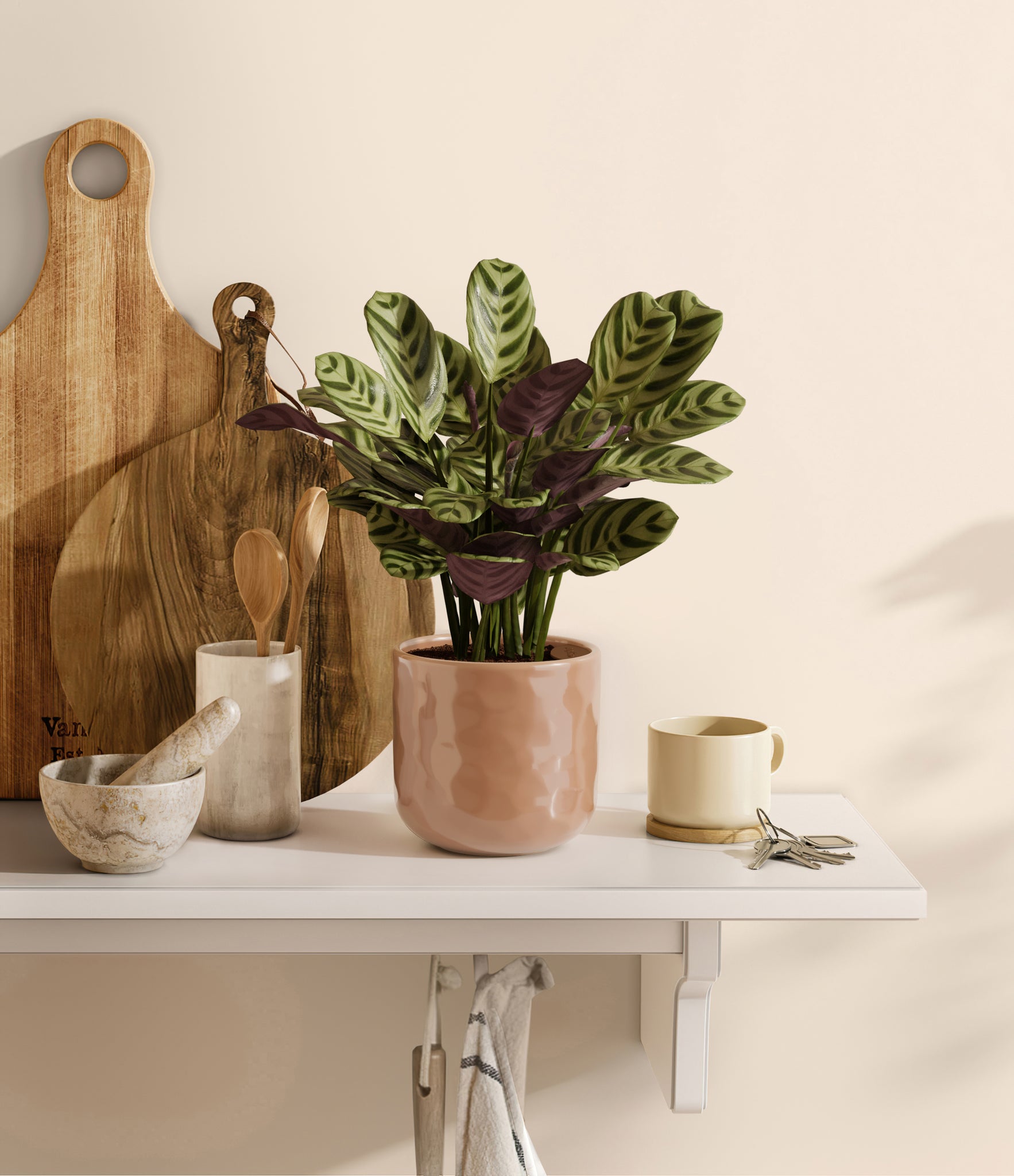 Native to the Amazonian jungles of South America, Calathea Marxii wears large emblem-shaped leaves, with bold strokes of forest green atop a deep burgundy underside. It belongs to the Marantaceae family, known as ‘Prayer Plants’, which much like humans and unlike most plants, have a wake-and-sleep cycle according to a circadian rhythm. This means the leaves move upwards during the night and downwards throughout the day in search of the sun.