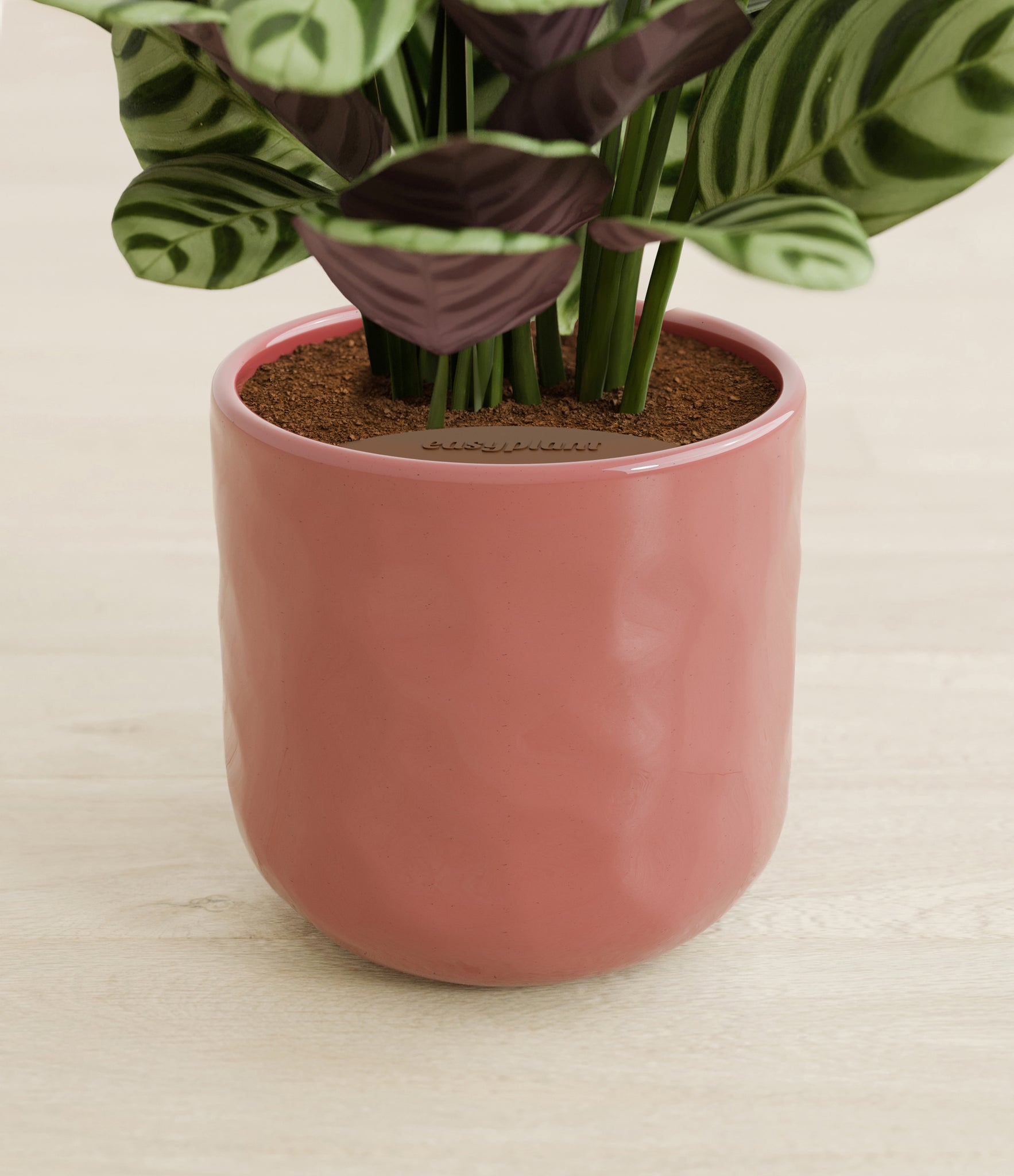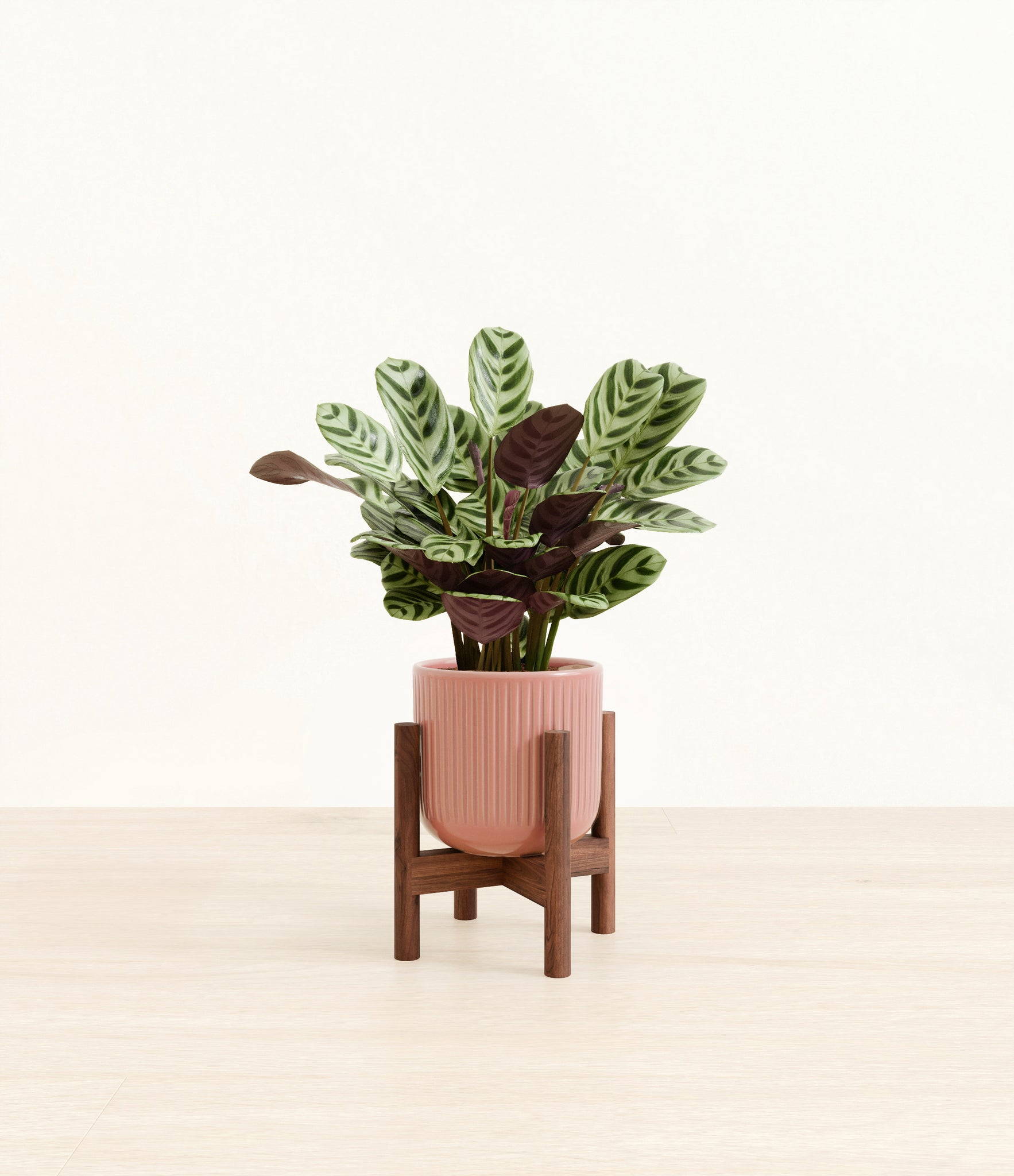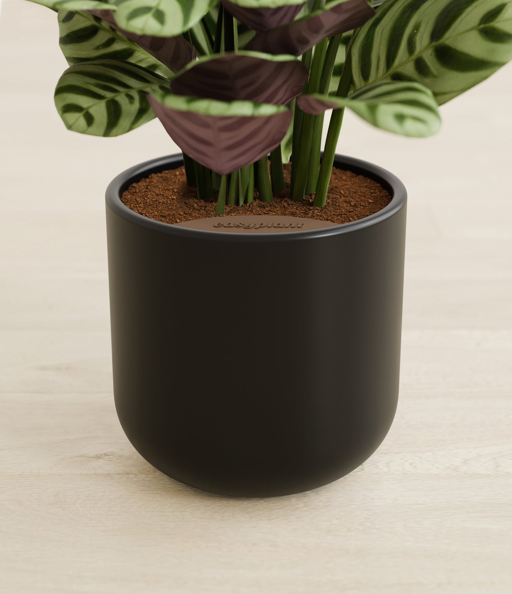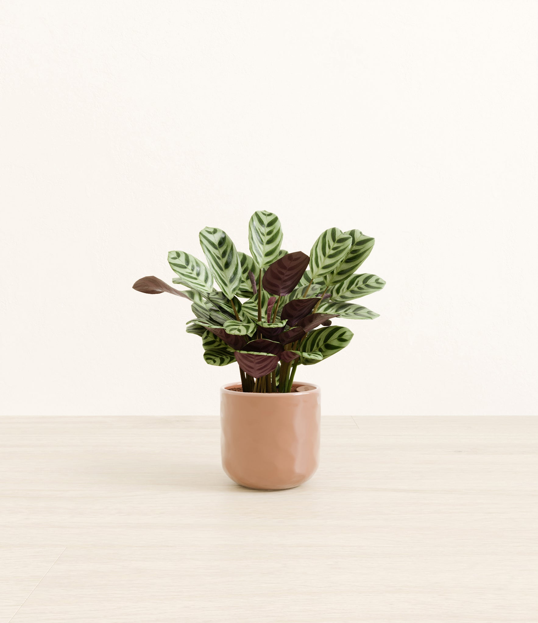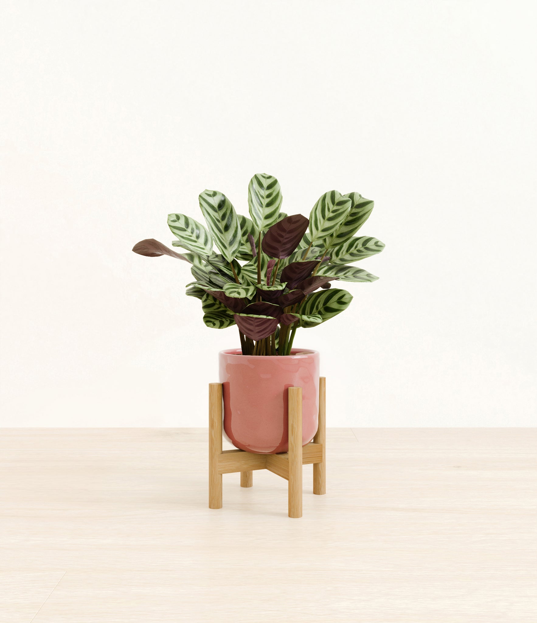Native to the Amazonian jungles of South America, Calathea Marxii wears large emblem-shaped leaves, with bold strokes of forest green atop a deep burgundy underside. It belongs to the Marantaceae family, known as ‘Prayer Plants’, which much like humans and unlike most plants, have a wake-and-sleep cycle according to a circadian rhythm. This means the leaves move upwards during the night and downwards throughout the day in search of the sun.