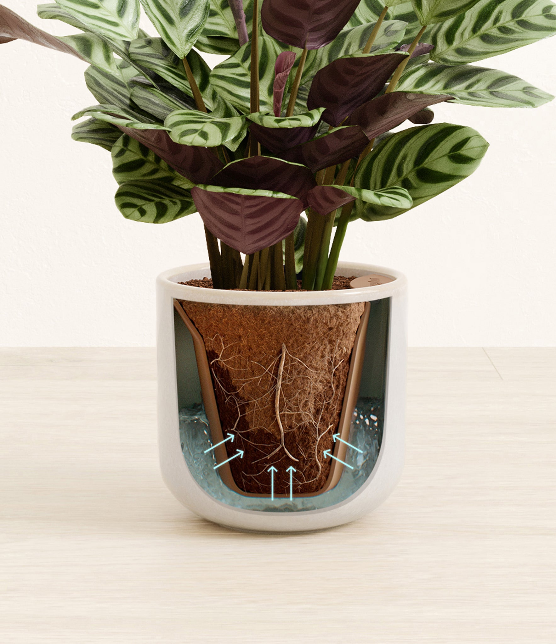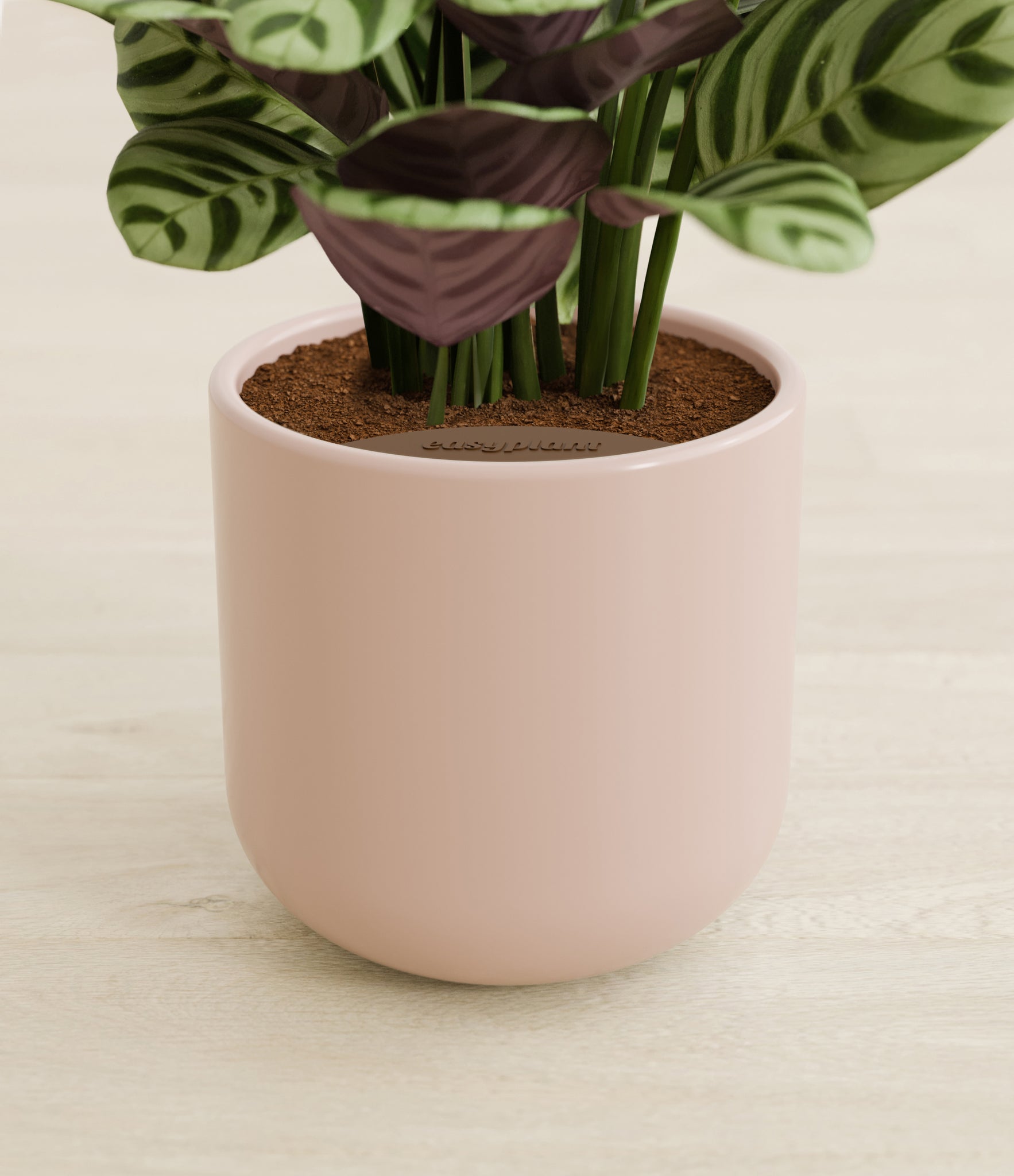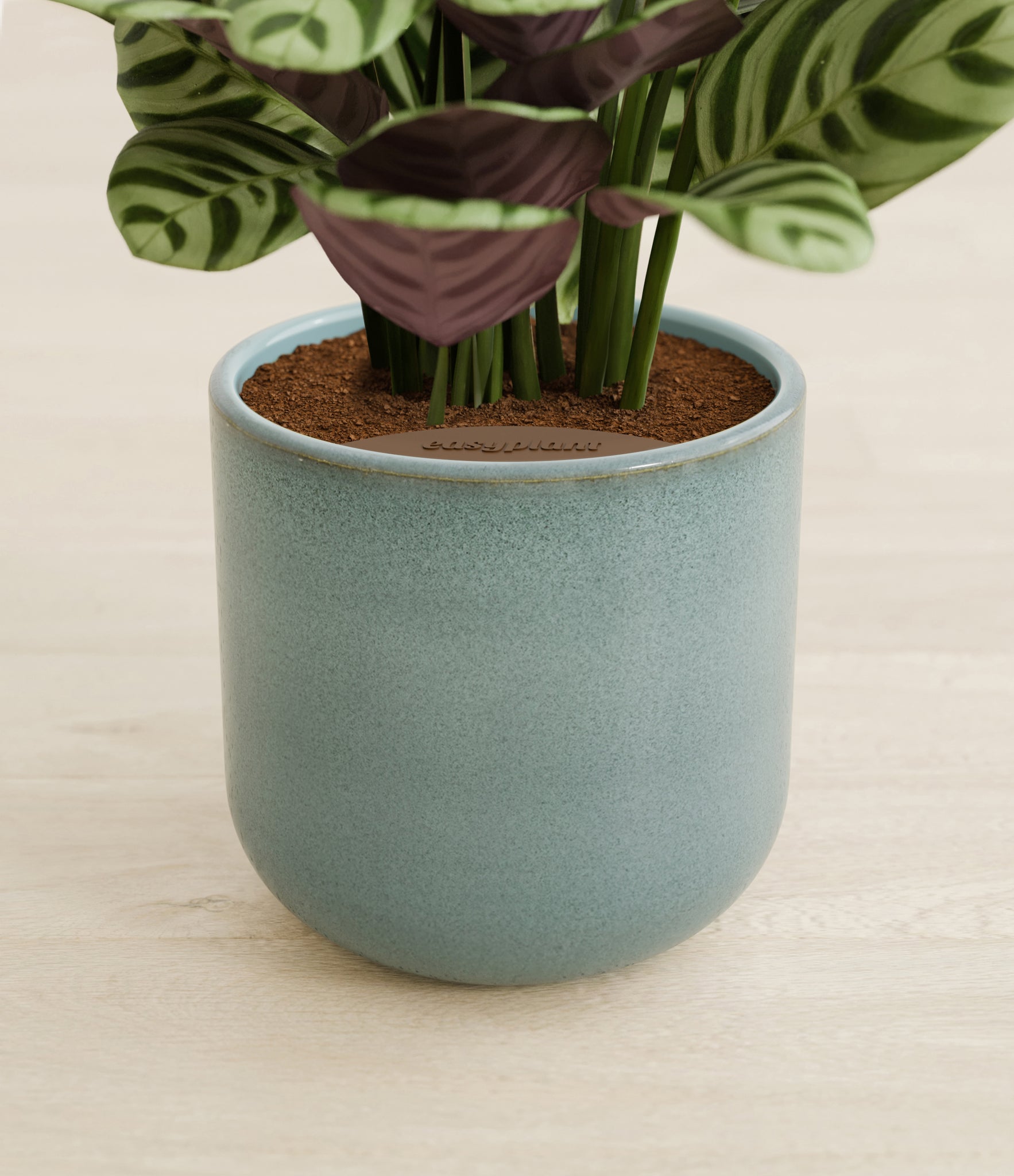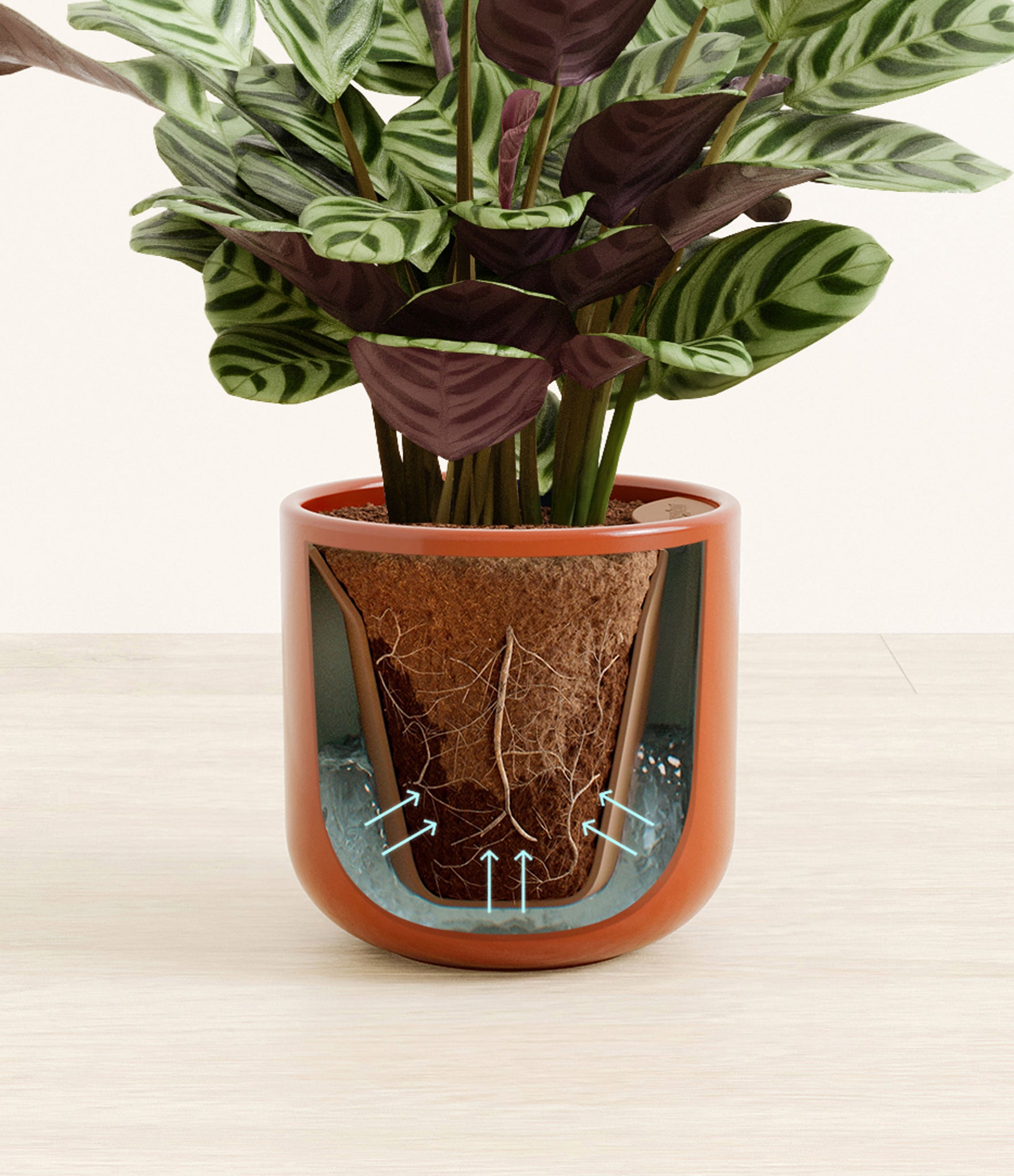Native to the Amazonian jungles of South America, Calathea Marxii wears large emblem-shaped leaves, with bold strokes of forest green atop a deep burgundy underside. It belongs to the Marantaceae family, known as ‘Prayer Plants’, which much like humans and unlike most plants, have a wake-and-sleep cycle according to a circadian rhythm. This means the leaves move upwards during the night and downwards throughout the day in search of the sun.