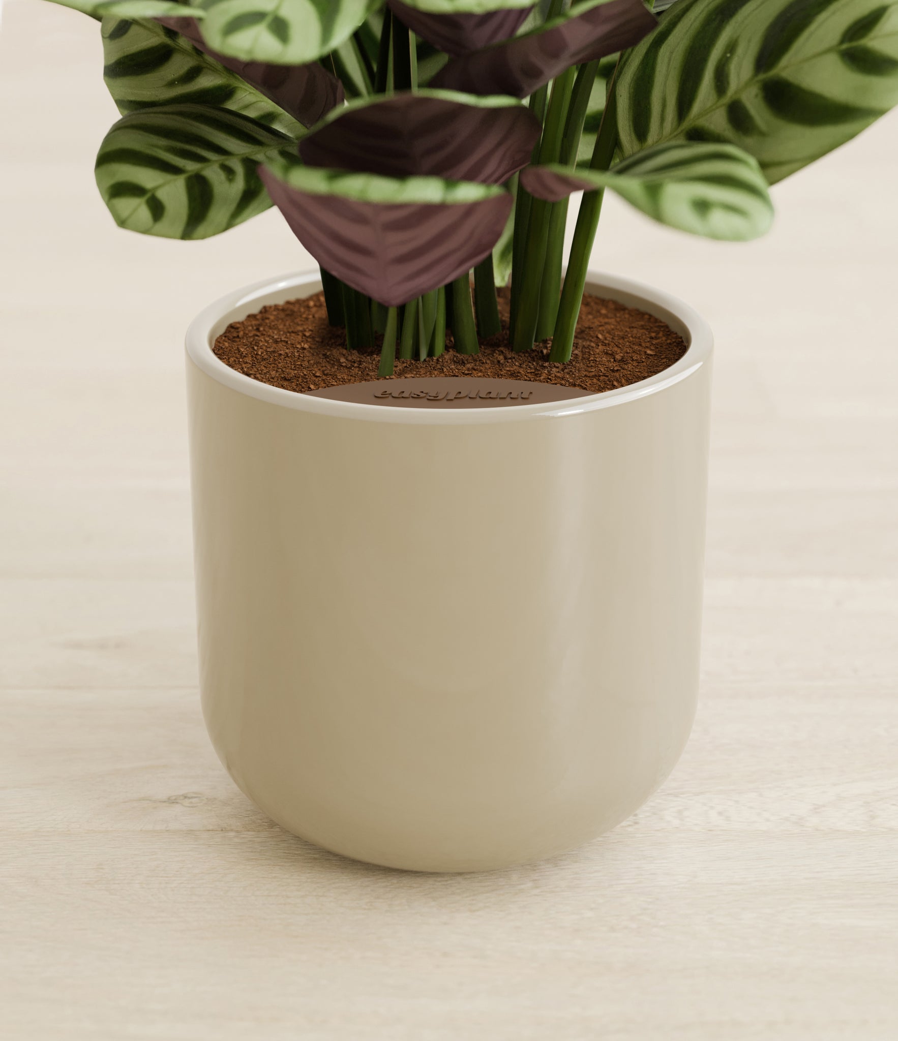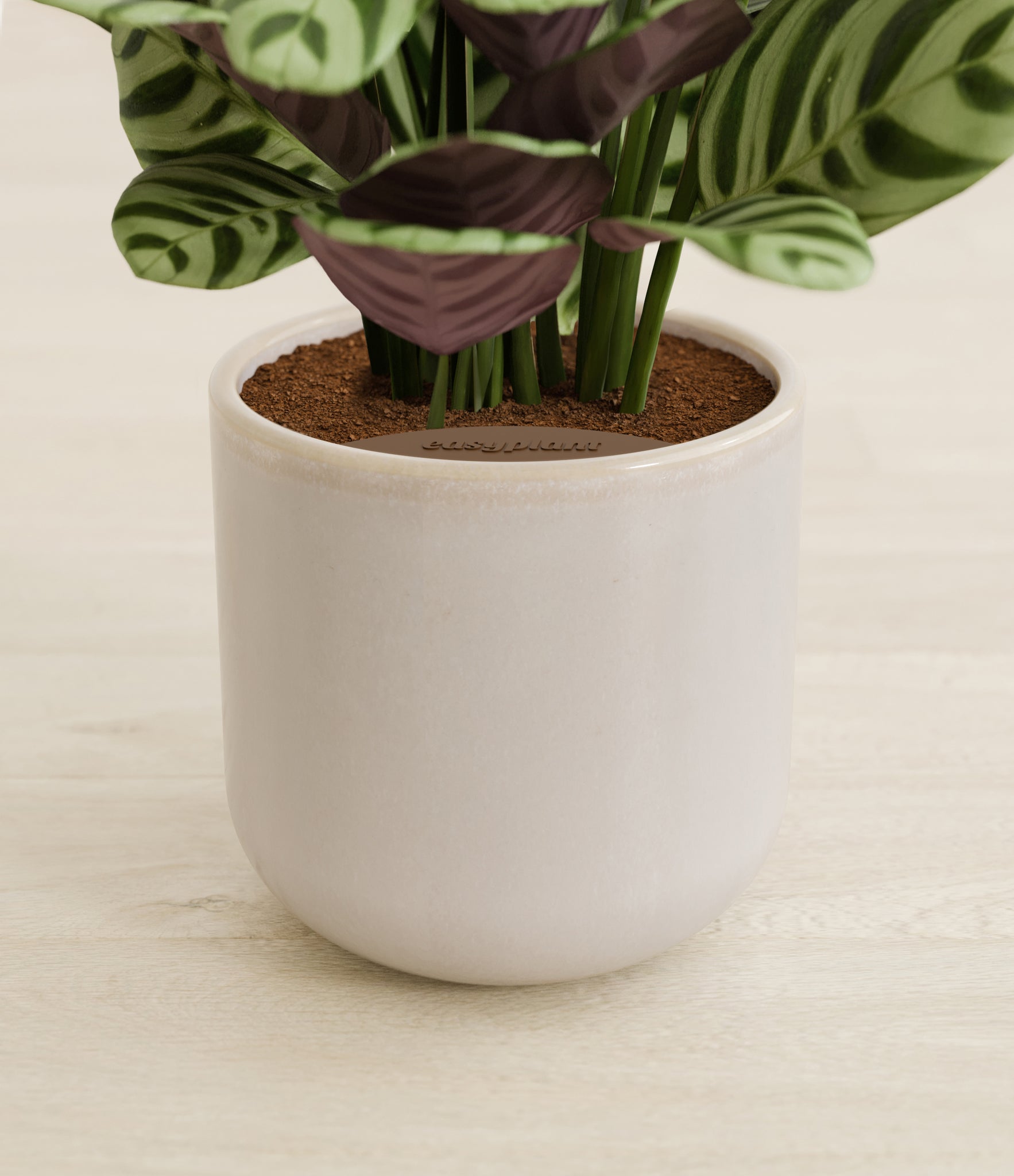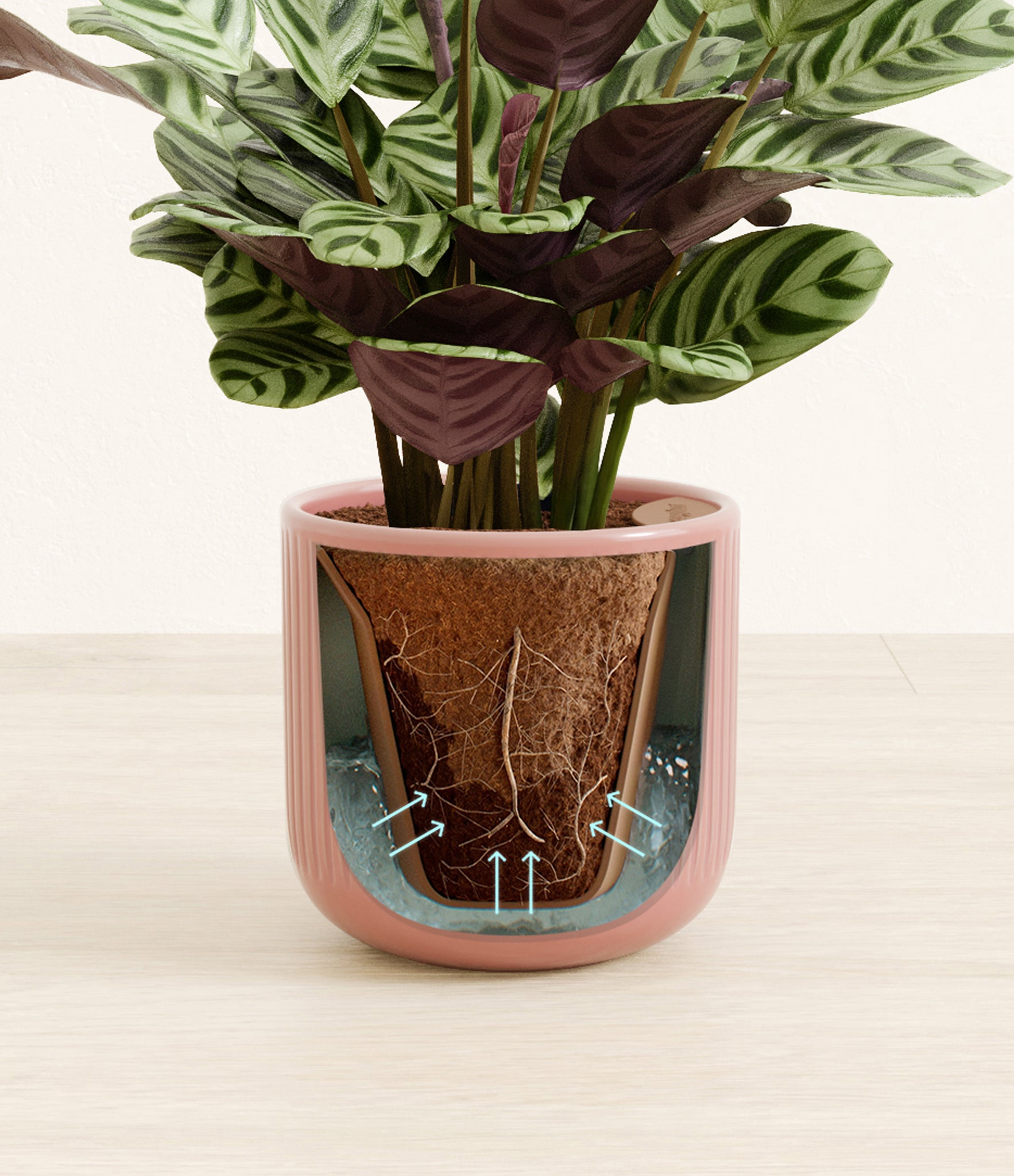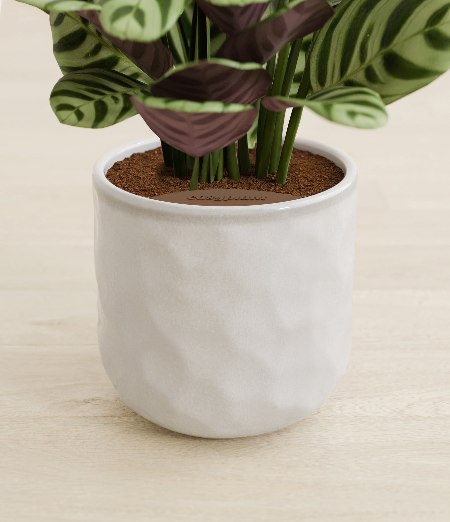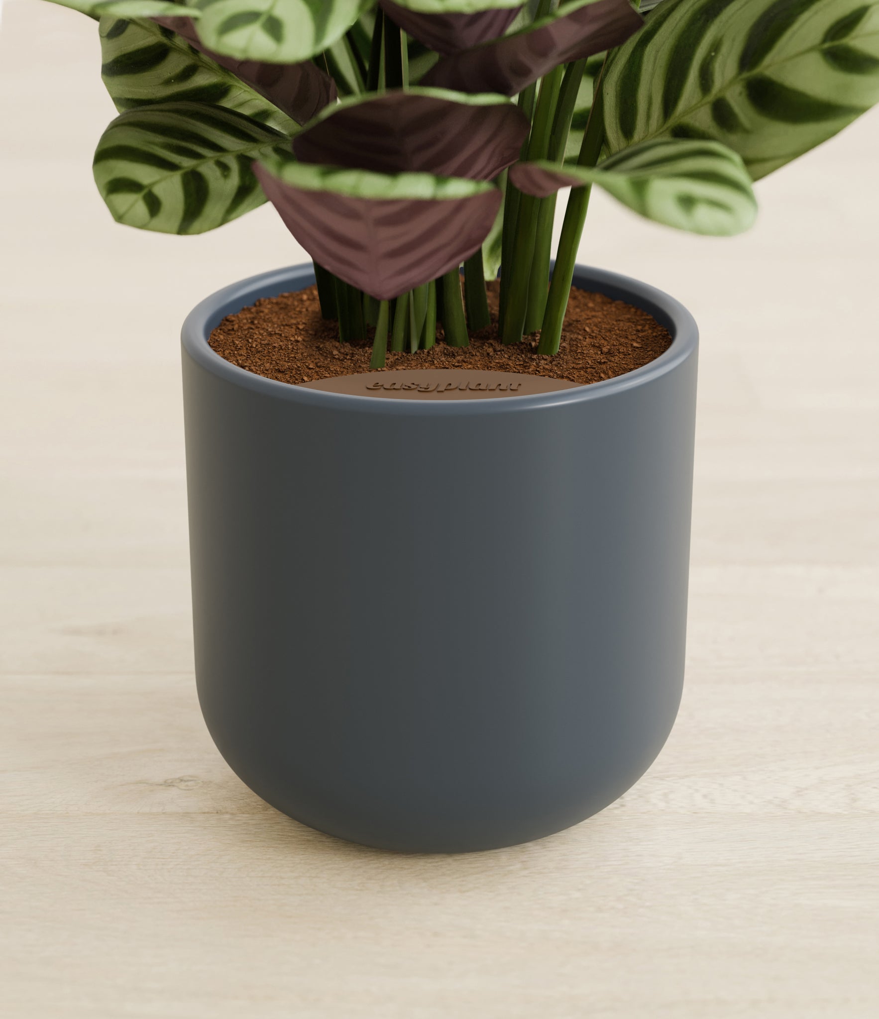 Native to the Amazonian jungles of South America, Calathea Marxii wears large emblem-shaped leaves, with bold strokes of forest green atop a deep burgundy underside. It belongs to the Marantaceae family, known as ‘Prayer Plants’, which much like humans and unlike most plants, have a wake-and-sleep cycle according to a circadian rhythm. This means the leaves move upwards during the night and downwards throughout the day in search of the sun.