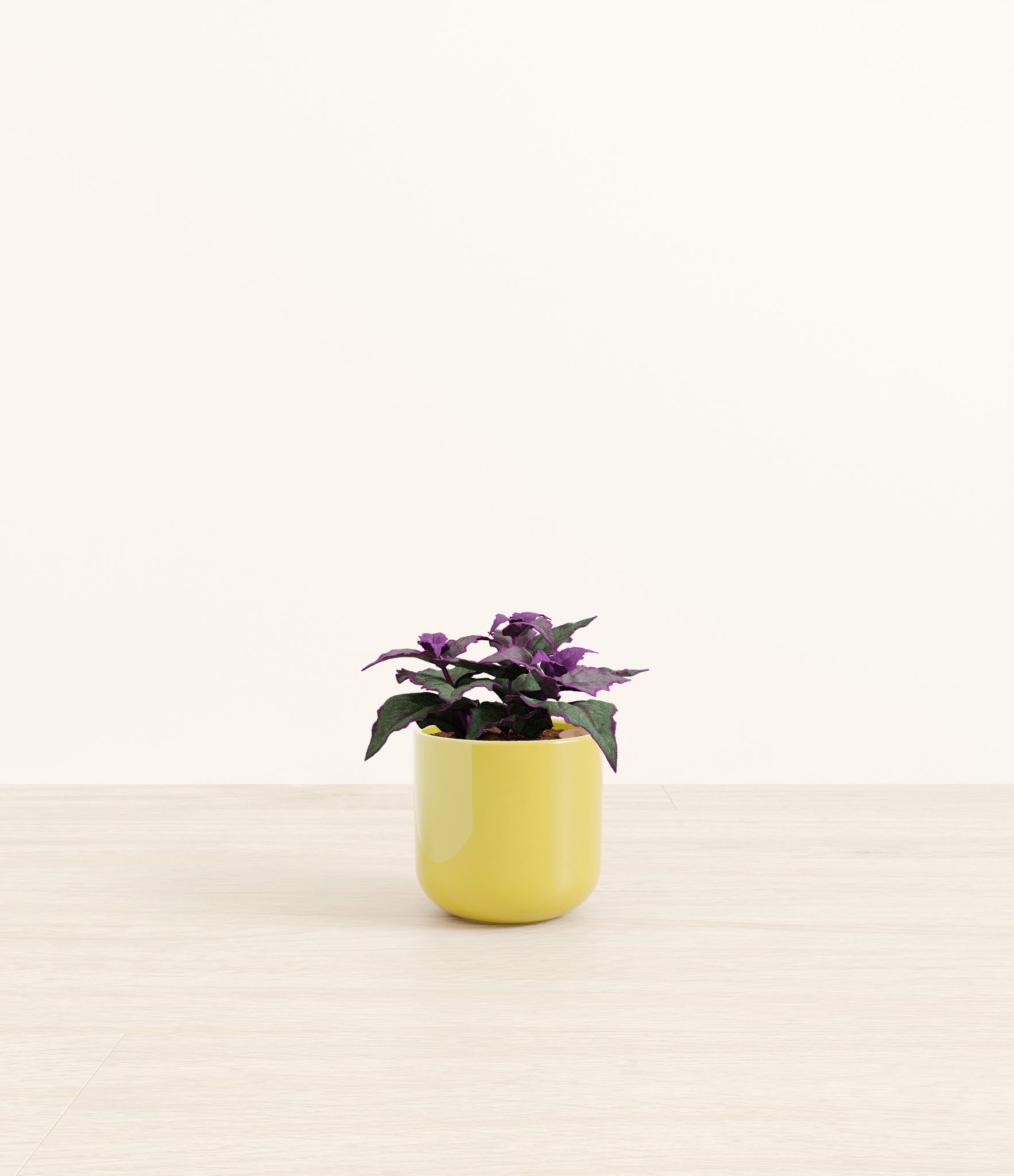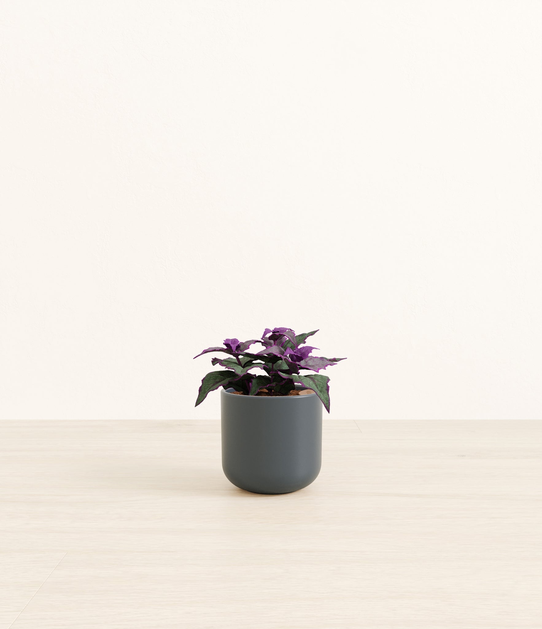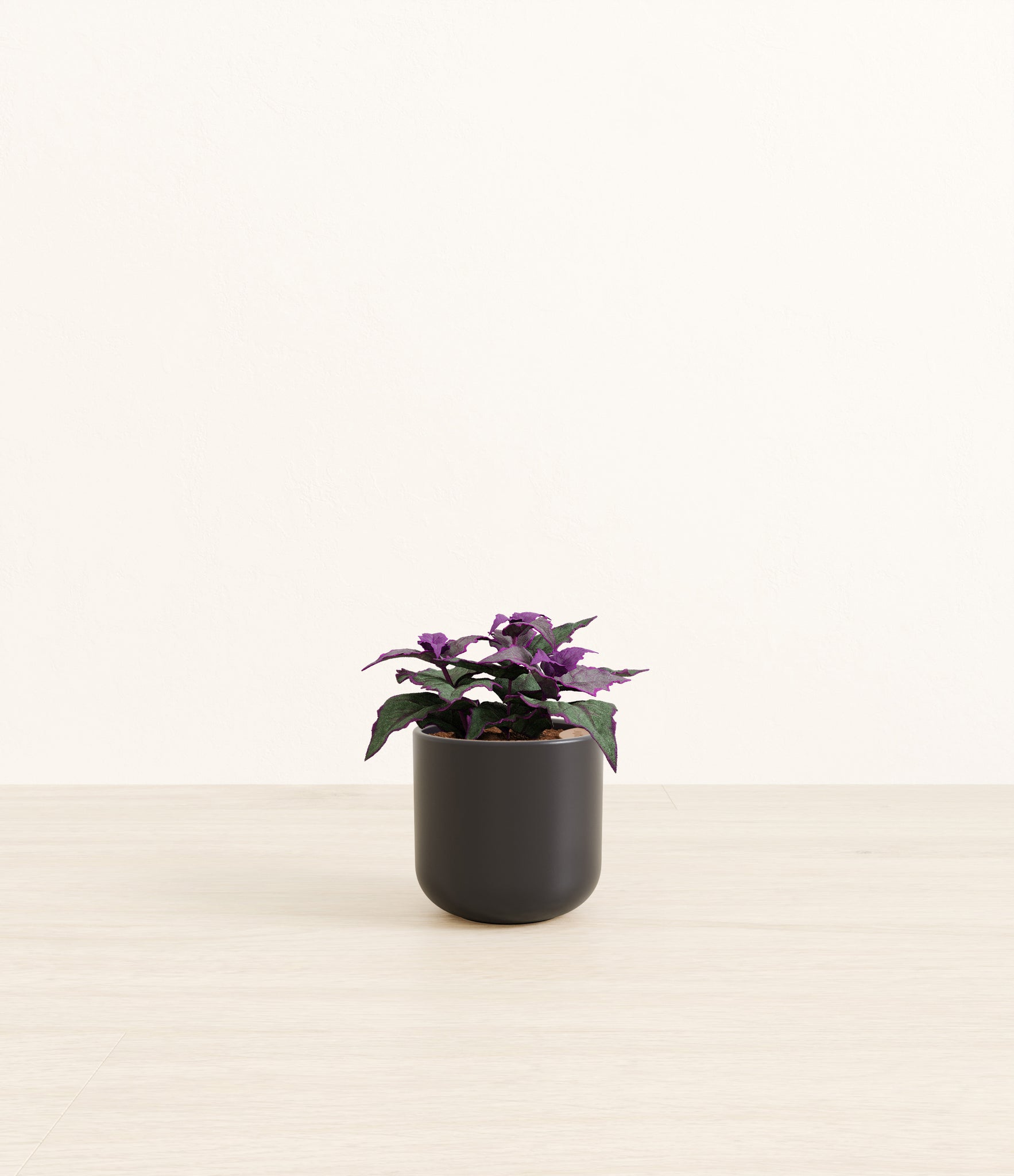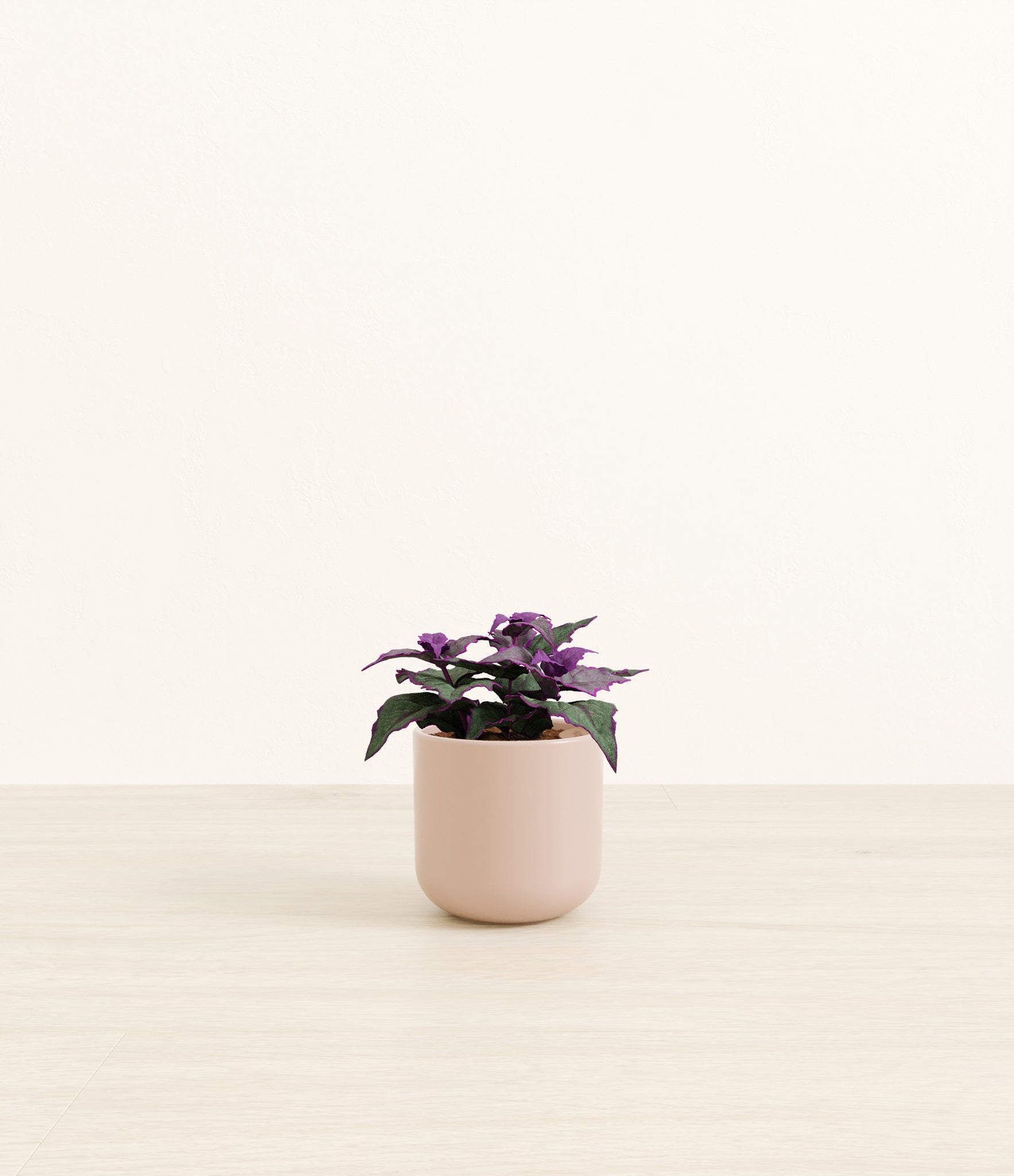 Native to the tropical regions of Java, the Purple Passion Plant, or Gynura aurantiaca, is celebrated for its unique, velvety leaves that shimmer with a deep purple hue. Known for its striking appearance, this plant adds a touch of the exotic to any indoor setting. The leaves are covered in tiny hairs that give them a surreal, iridescent look, making it a visual spectacle. While its deep hues remain a focal point, slight variations in color may occur as the plant matures, offering a continuous display of its passionate purple throughout the year.