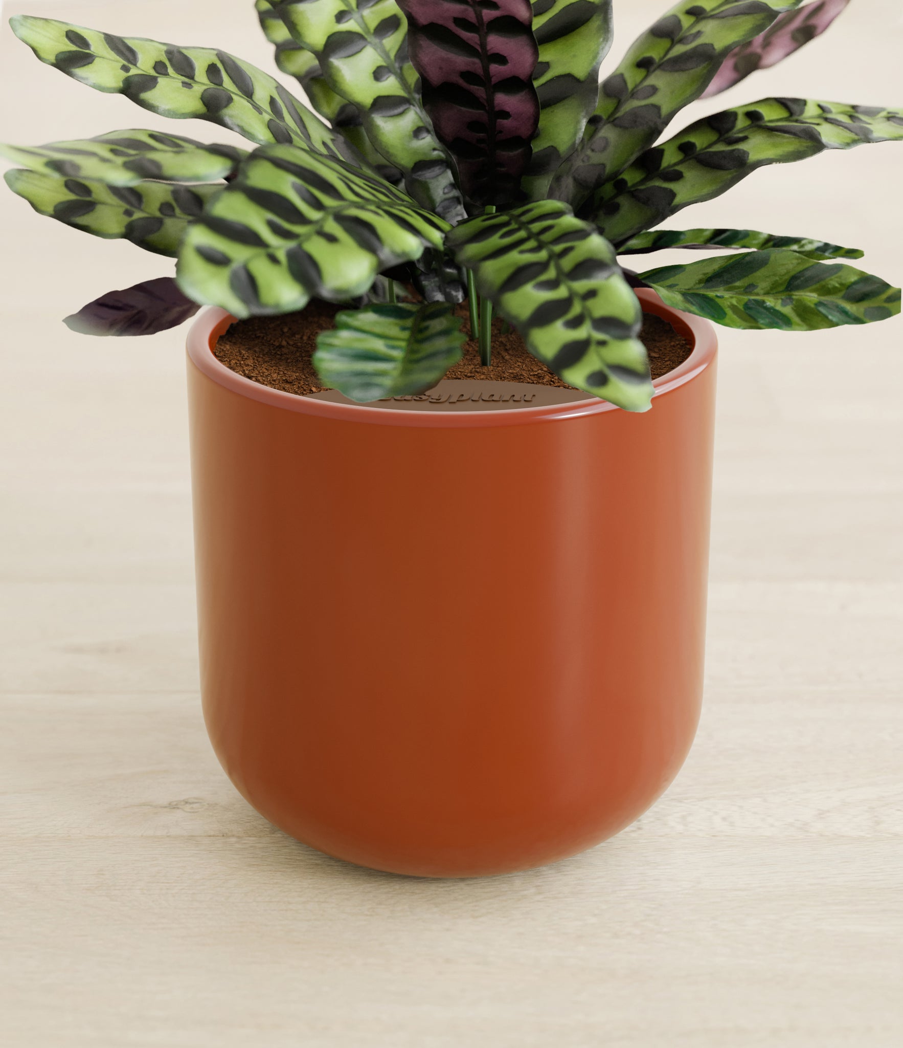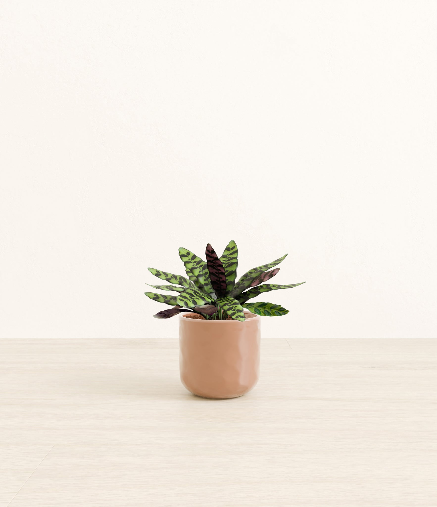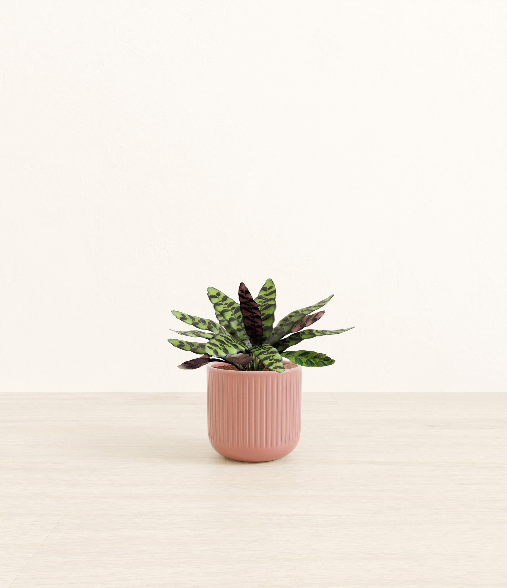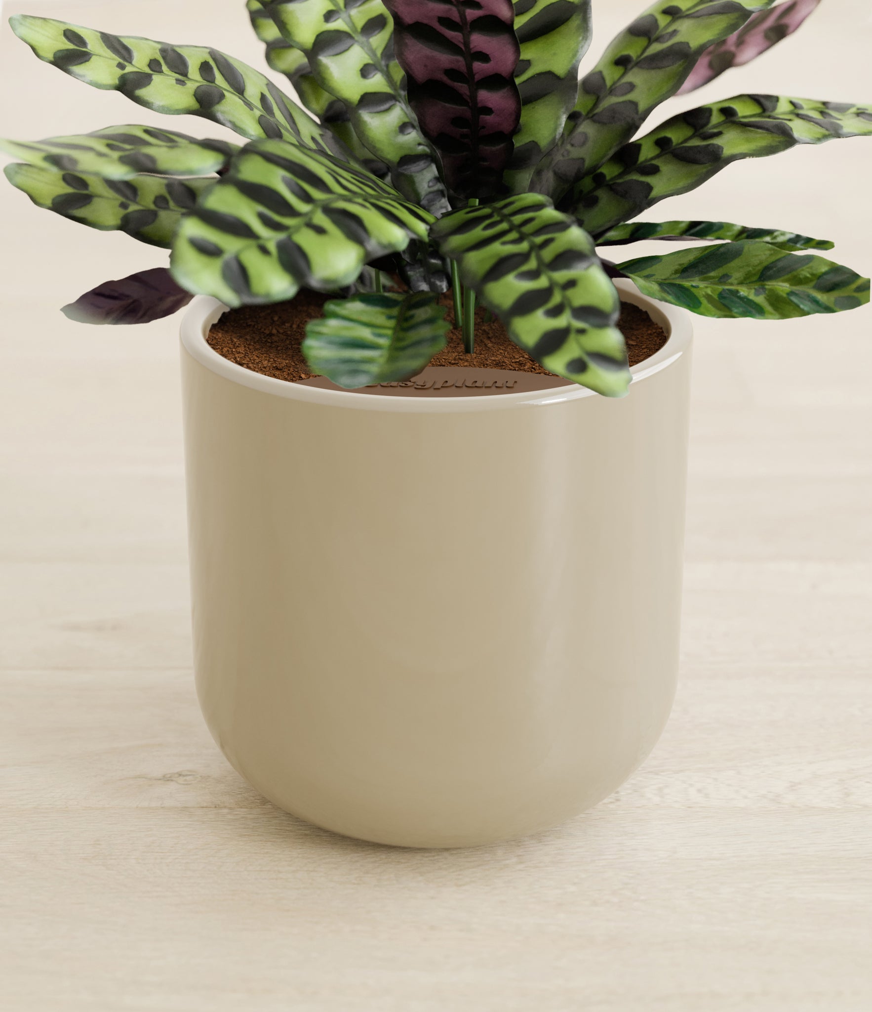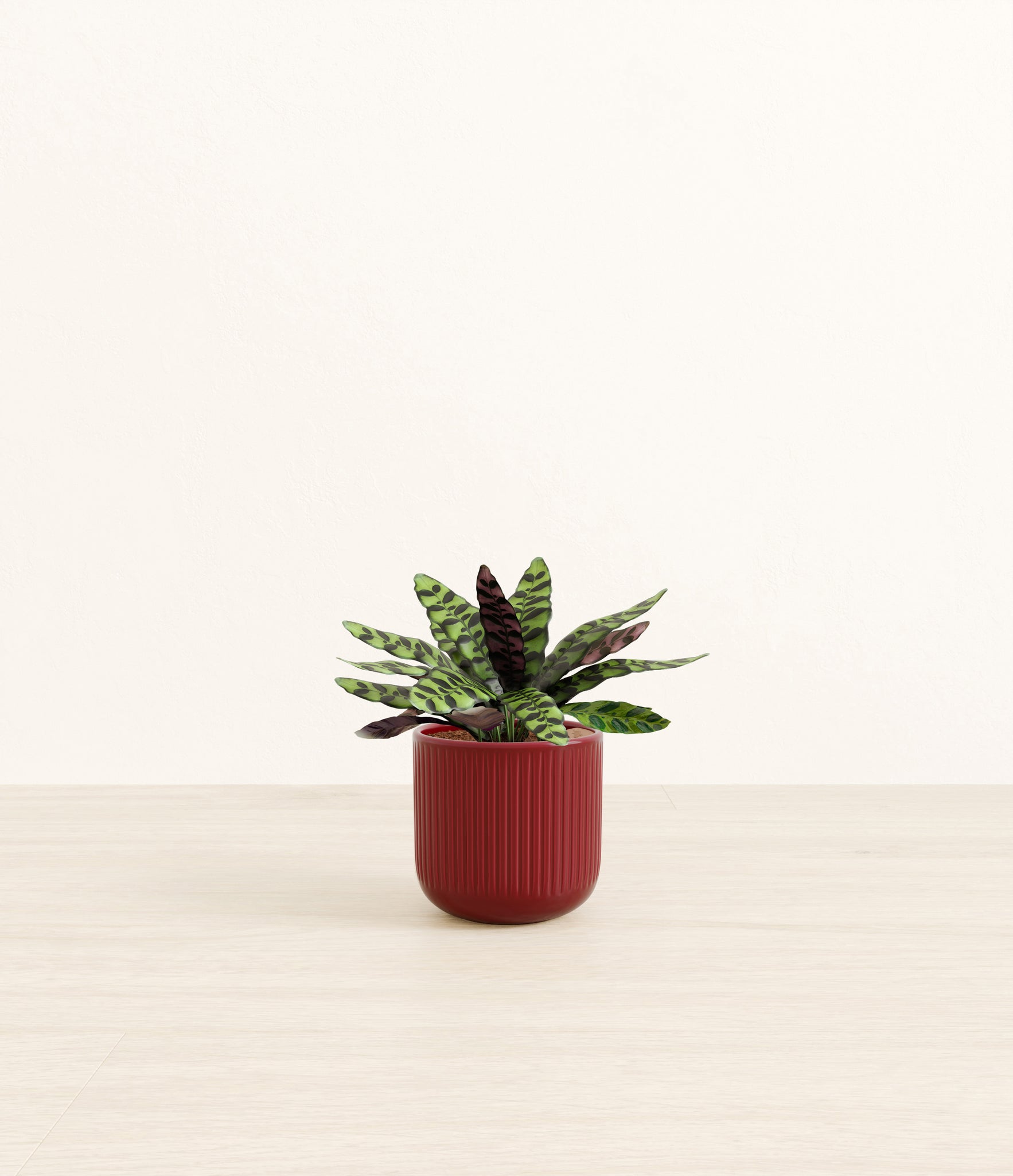 Native to the Amazonian jungles of South America, Rattlesnake Calathea wears an eccentric reptilian pattern on its leaves, with a plum underside and lush green brushstrokes on top. It belongs to the Marantaceae family, known as ‘Prayer Plants’, which much like humans and unlike most plants, have a wake-and-sleep cycle according to a circadian rhythm. This means its leaves move upwards during the night and downwards throughout the day in search of the sun.