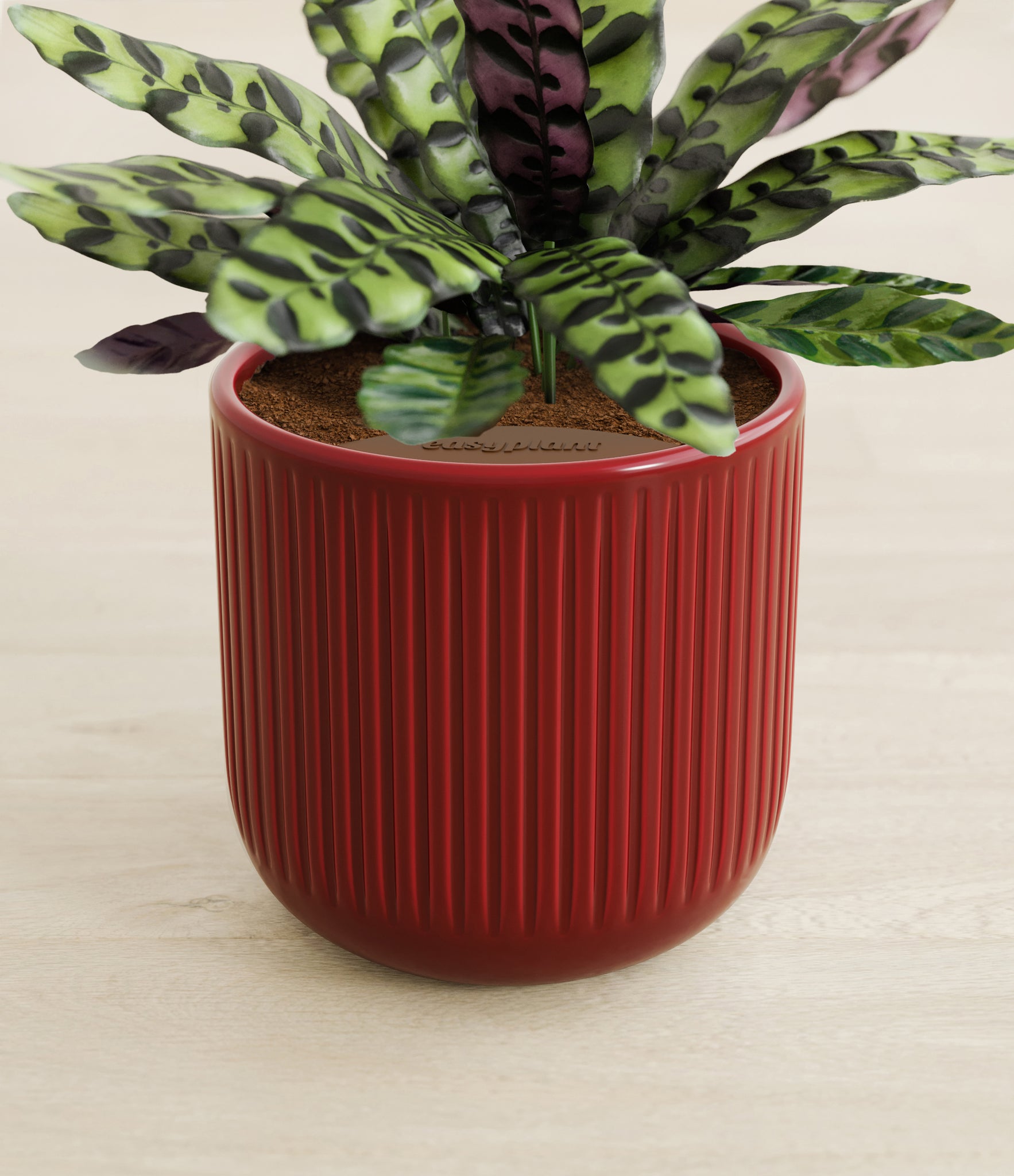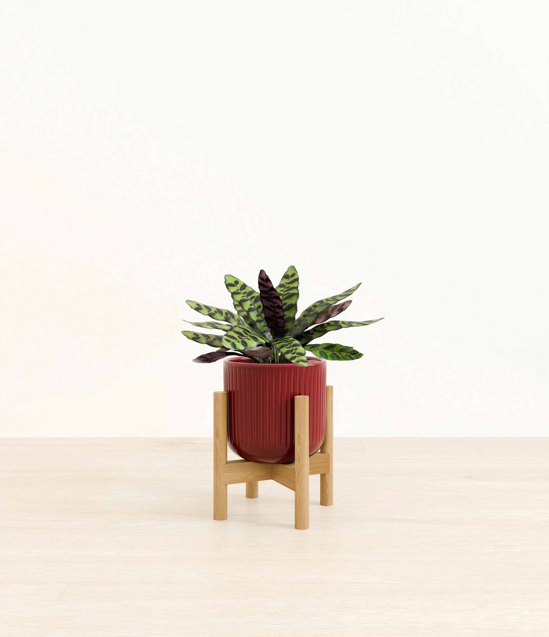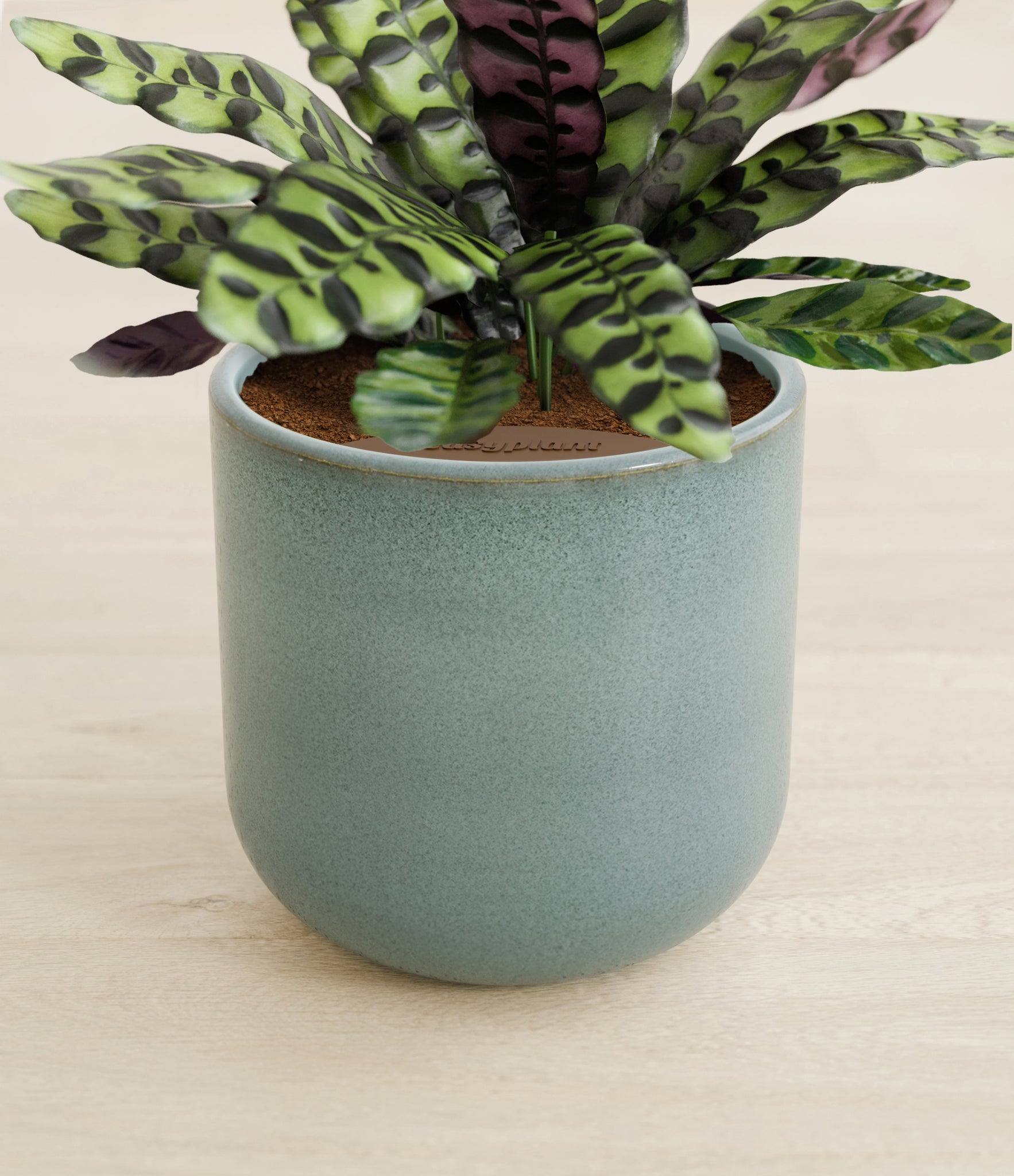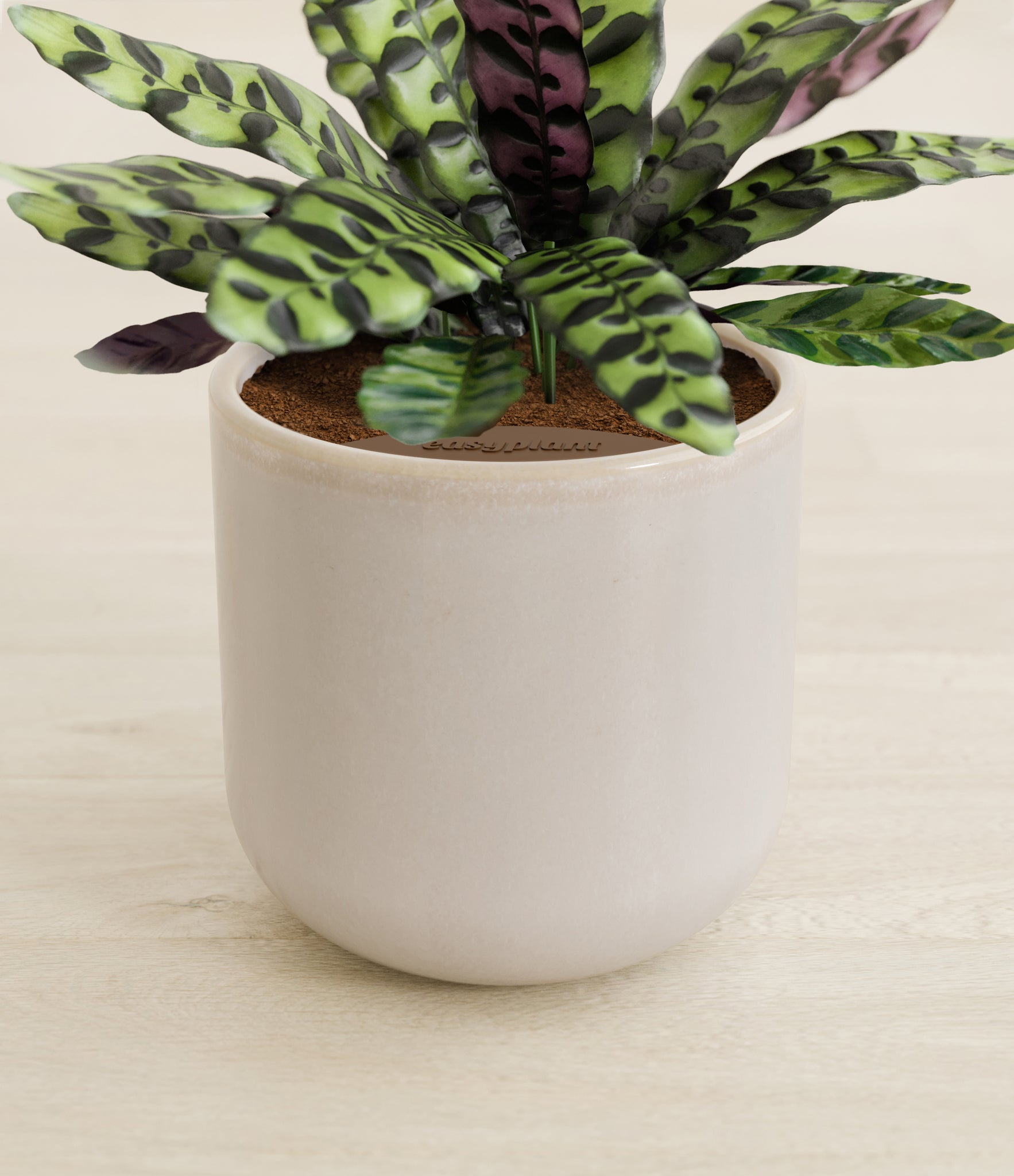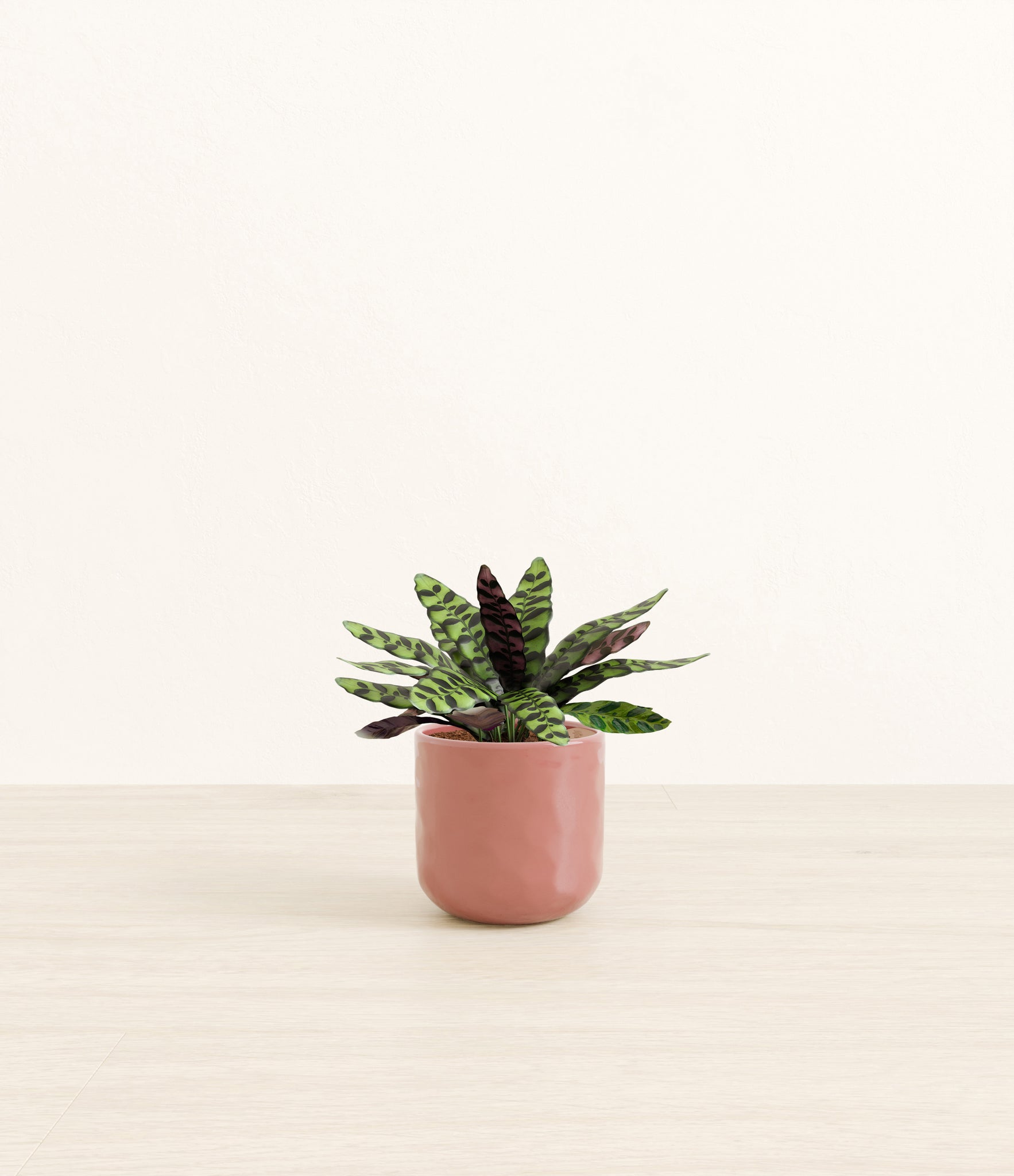 Native to the Amazonian jungles of South America, Rattlesnake Calathea wears an eccentric reptilian pattern on its leaves, with a plum underside and lush green brushstrokes on top. It belongs to the Marantaceae family, known as ‘Prayer Plants’, which much like humans and unlike most plants, have a wake-and-sleep cycle according to a circadian rhythm. This means its leaves move upwards during the night and downwards throughout the day in search of the sun.