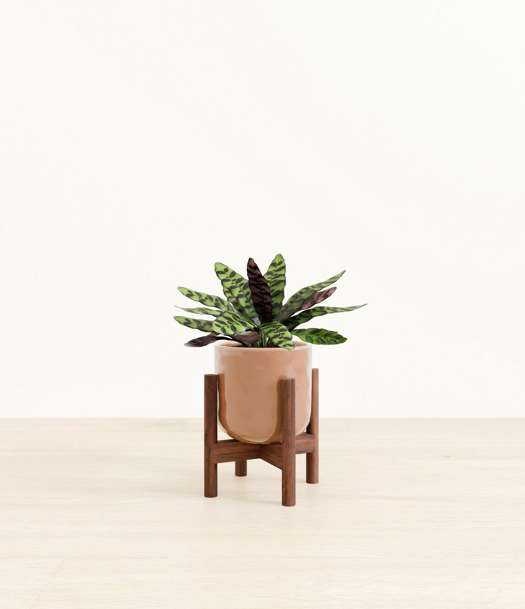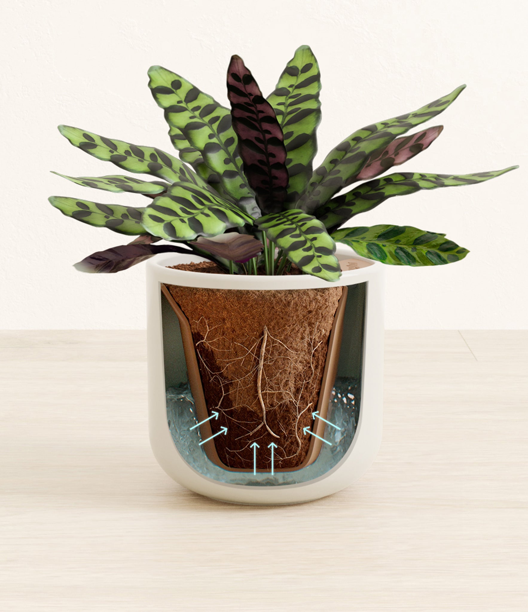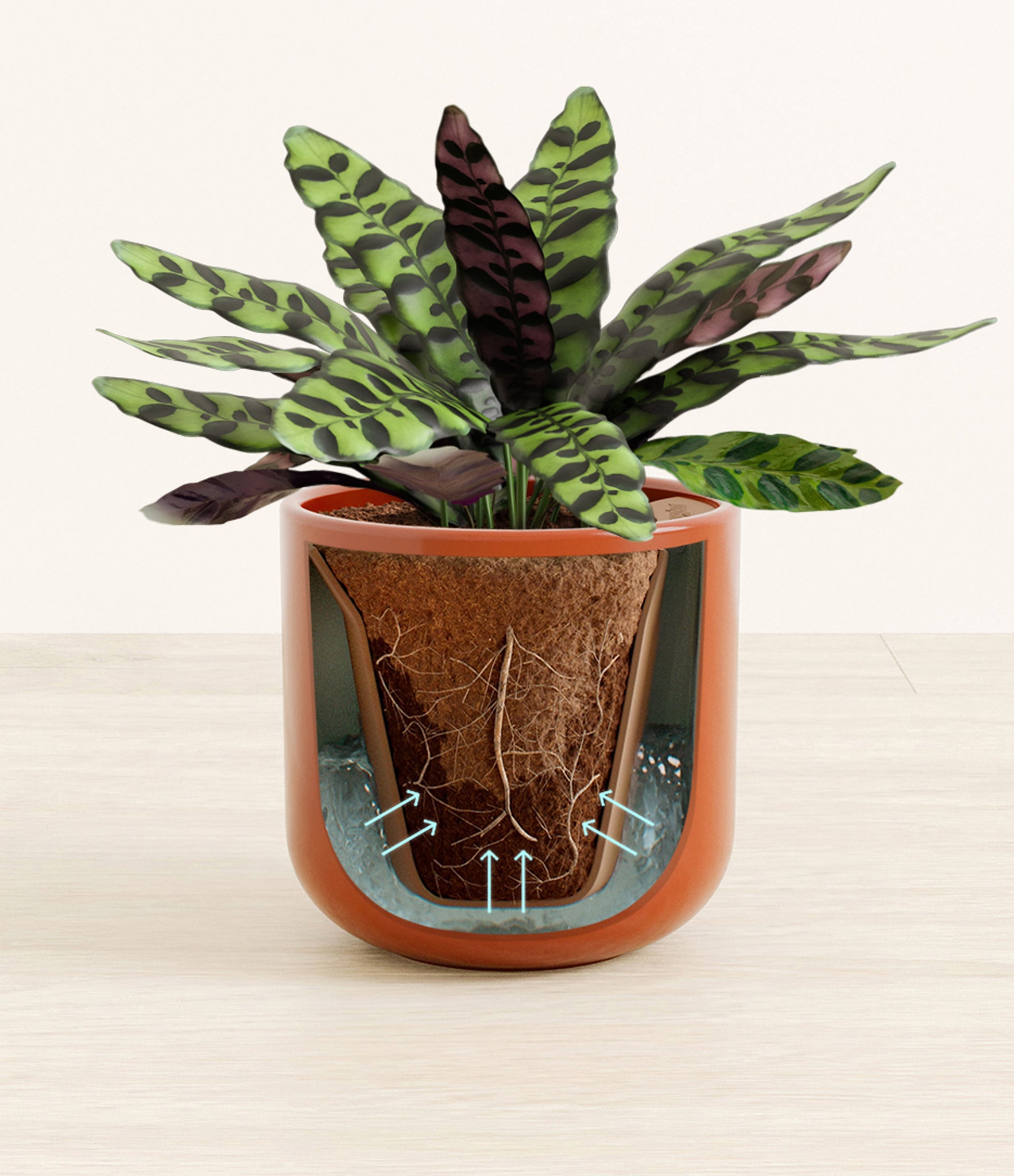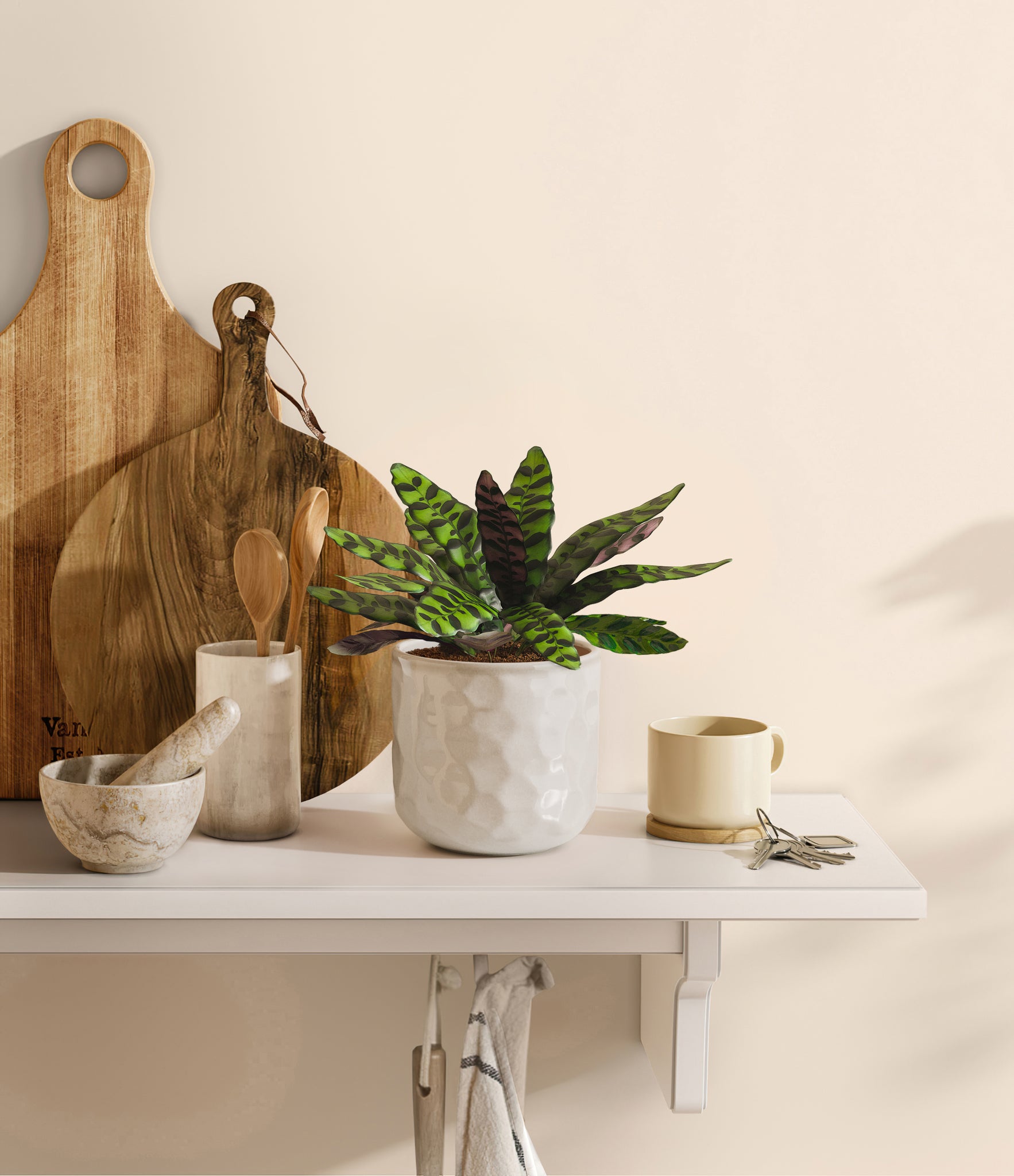 Native to the Amazonian jungles of South America, Rattlesnake Calathea wears an eccentric reptilian pattern on its leaves, with a plum underside and lush green brushstrokes on top. It belongs to the Marantaceae family, known as ‘Prayer Plants’, which much like humans and unlike most plants, have a wake-and-sleep cycle according to a circadian rhythm. This means its leaves move upwards during the night and downwards throughout the day in search of the sun.