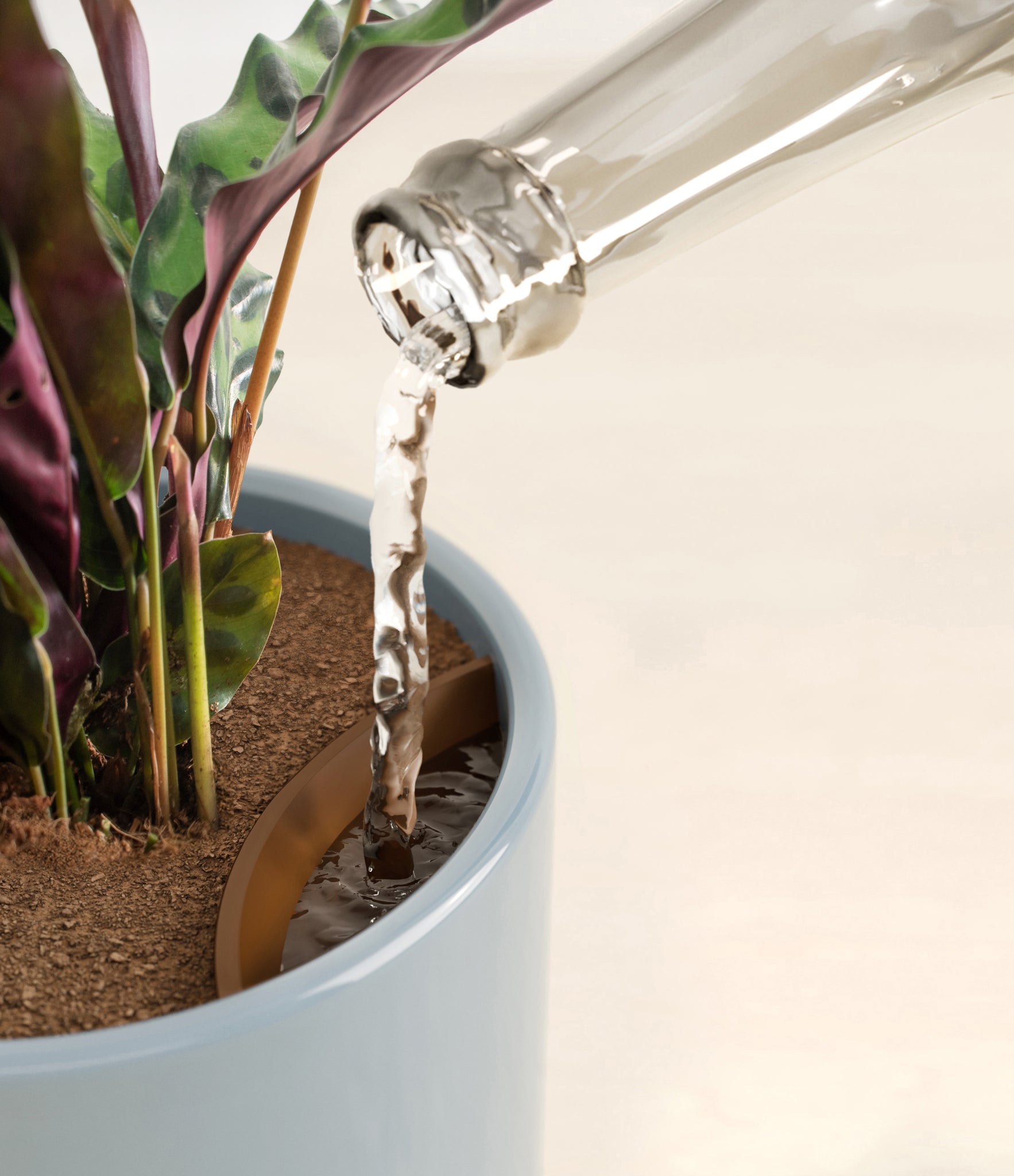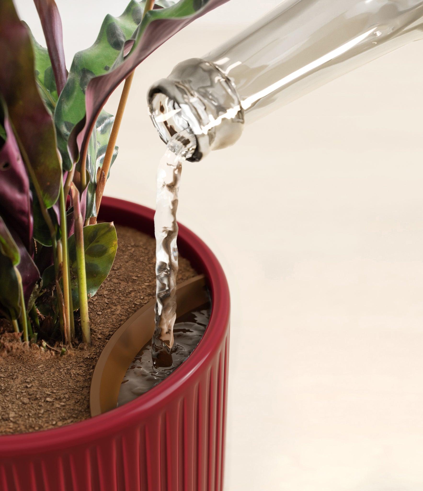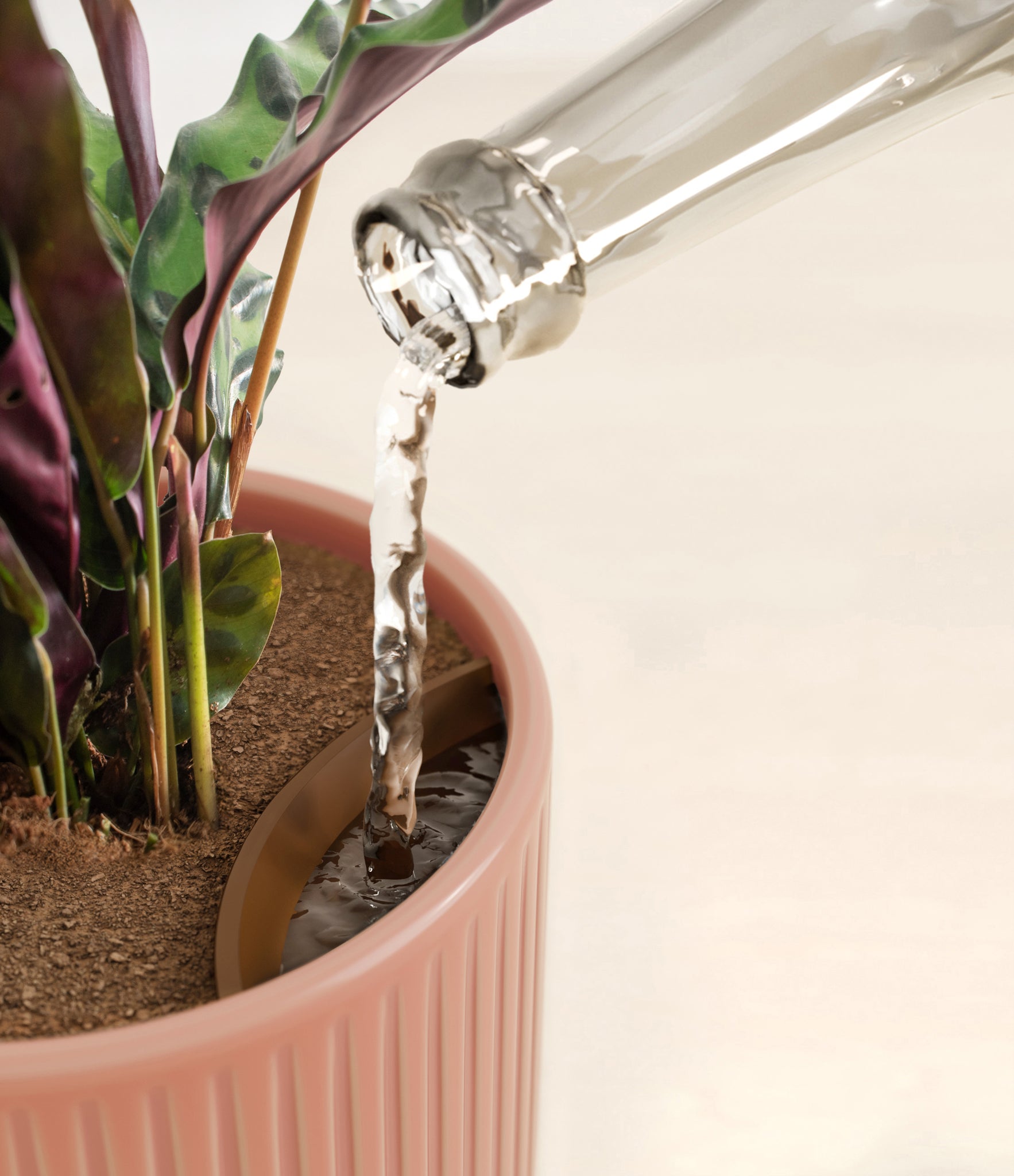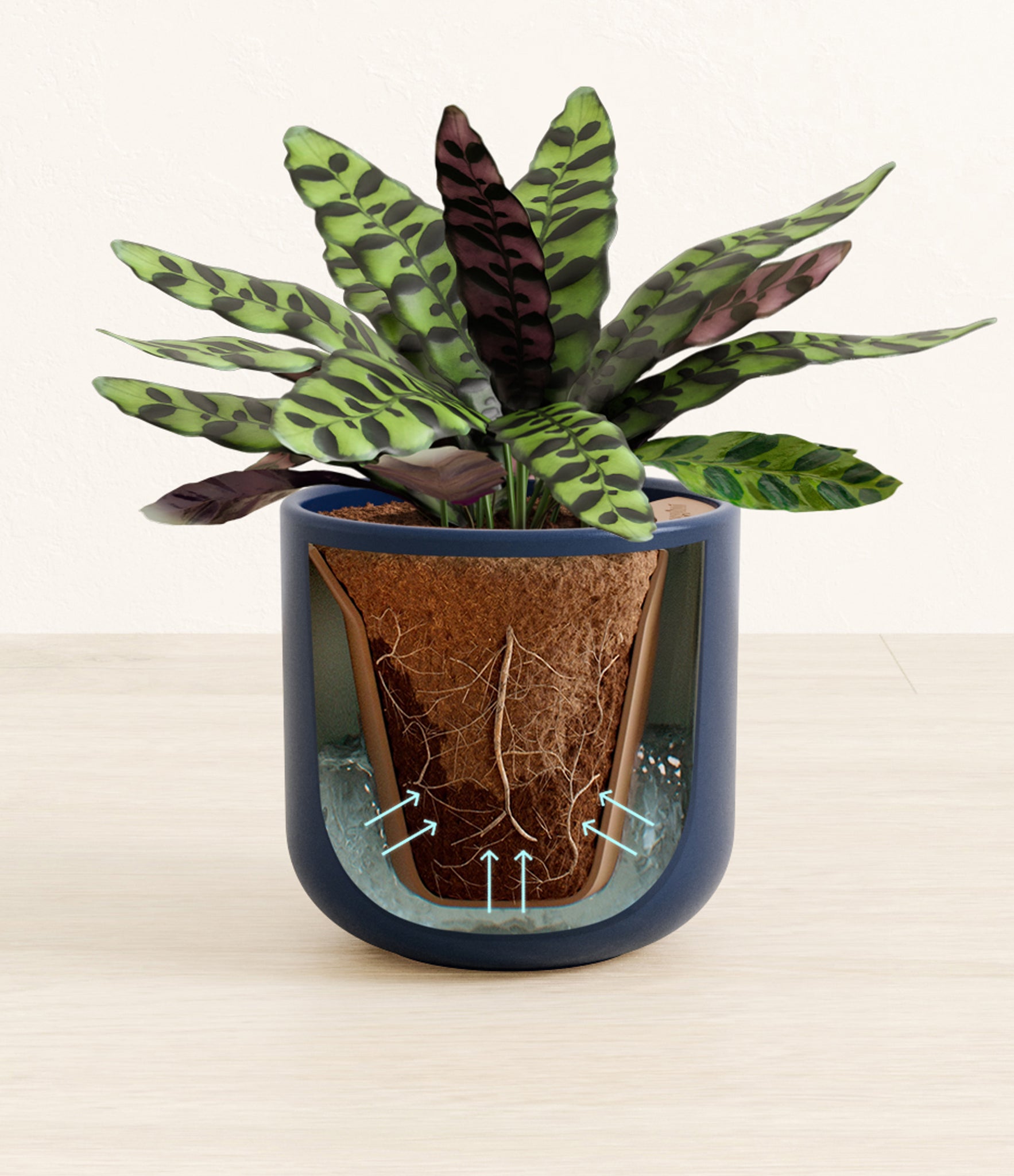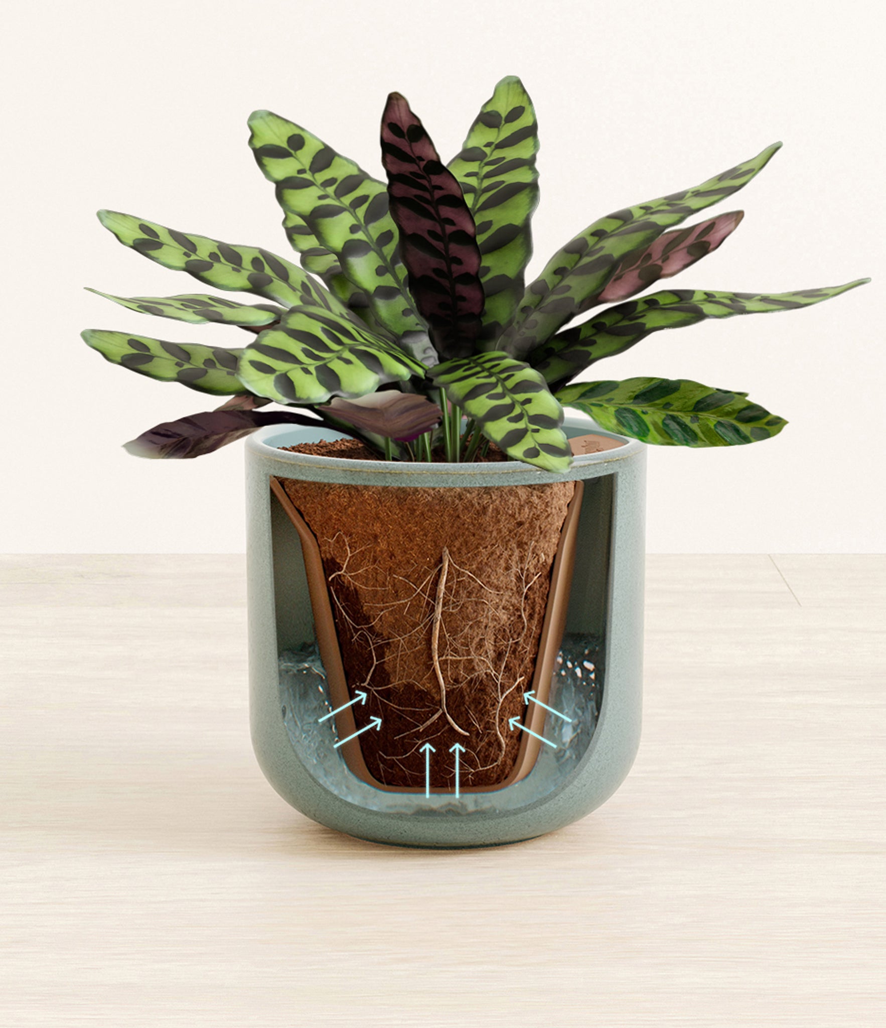 Native to the Amazonian jungles of South America, Rattlesnake Calathea wears an eccentric reptilian pattern on its leaves, with a plum underside and lush green brushstrokes on top. It belongs to the Marantaceae family, known as ‘Prayer Plants’, which much like humans and unlike most plants, have a wake-and-sleep cycle according to a circadian rhythm. This means its leaves move upwards during the night and downwards throughout the day in search of the sun.