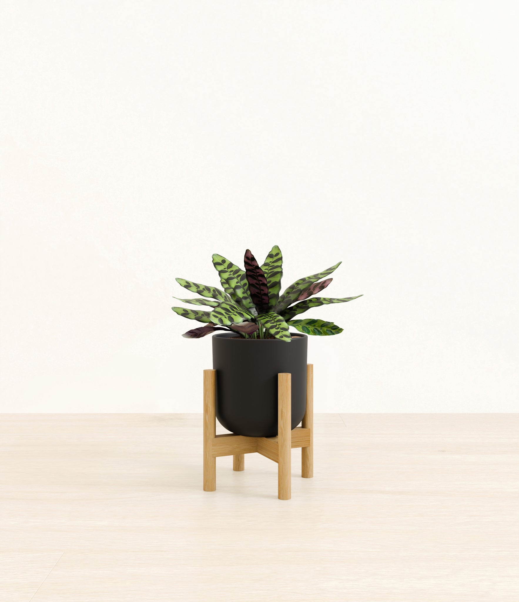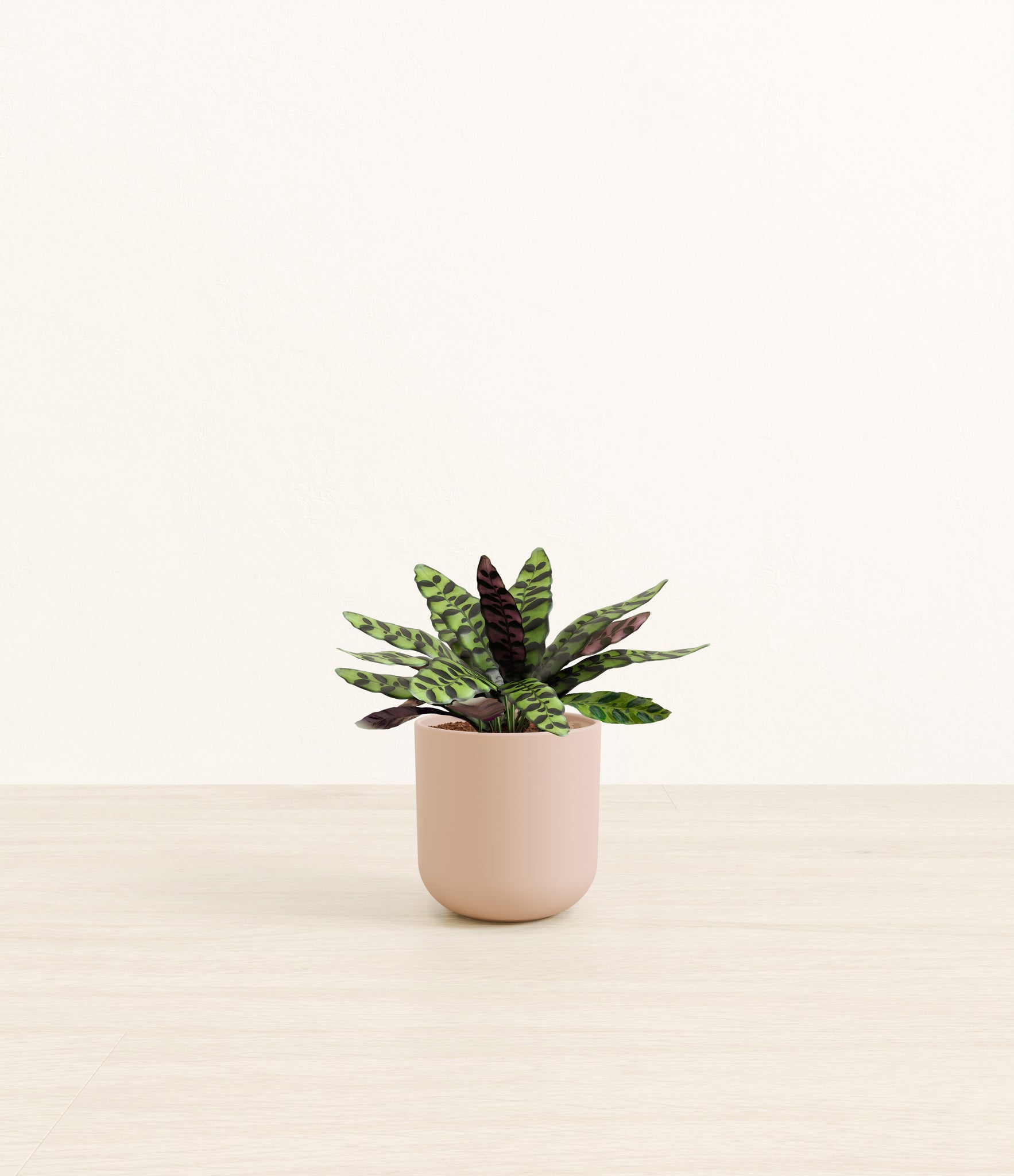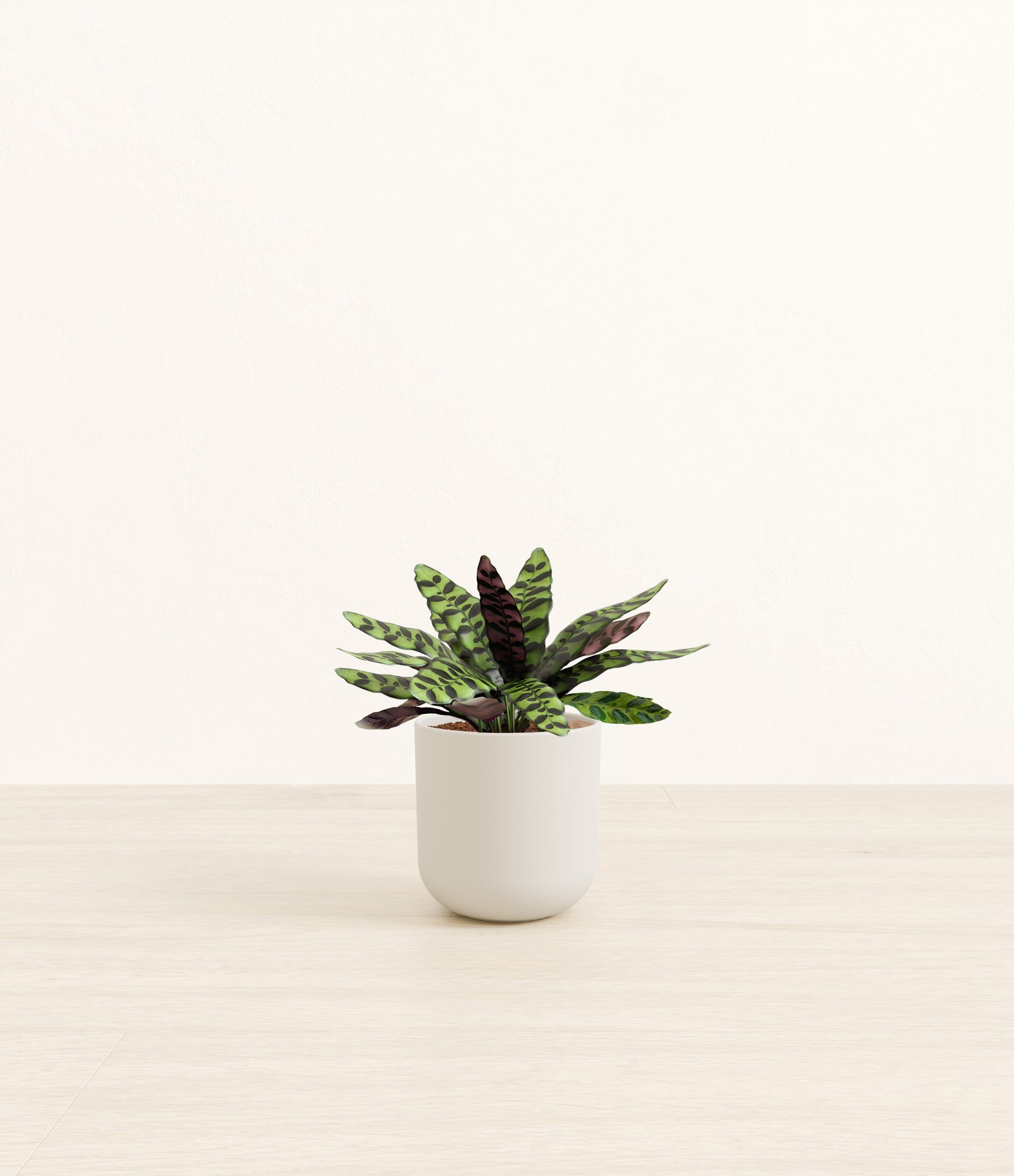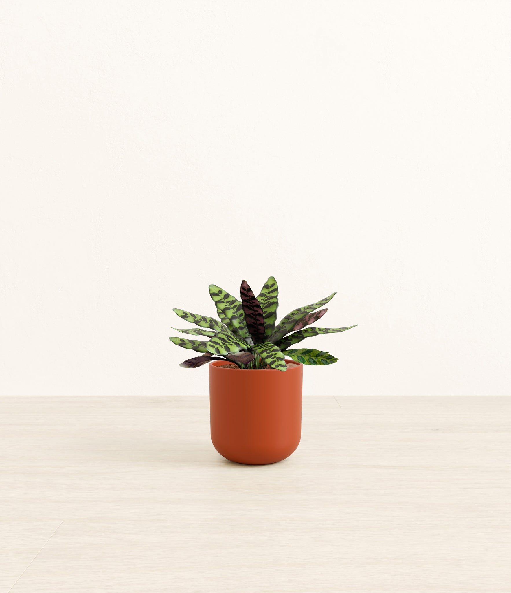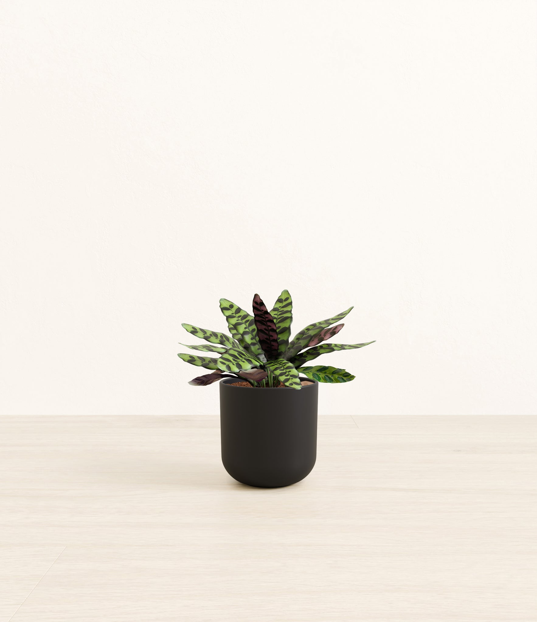 Native to the Amazonian jungles of South America, Rattlesnake Calathea wears an eccentric reptilian pattern on its leaves, with a plum underside and lush green brushstrokes on top. It belongs to the Marantaceae family, known as ‘Prayer Plants’, which much like humans and unlike most plants, have a wake-and-sleep cycle according to a circadian rhythm. This means its leaves move upwards during the night and downwards throughout the day in search of the sun.