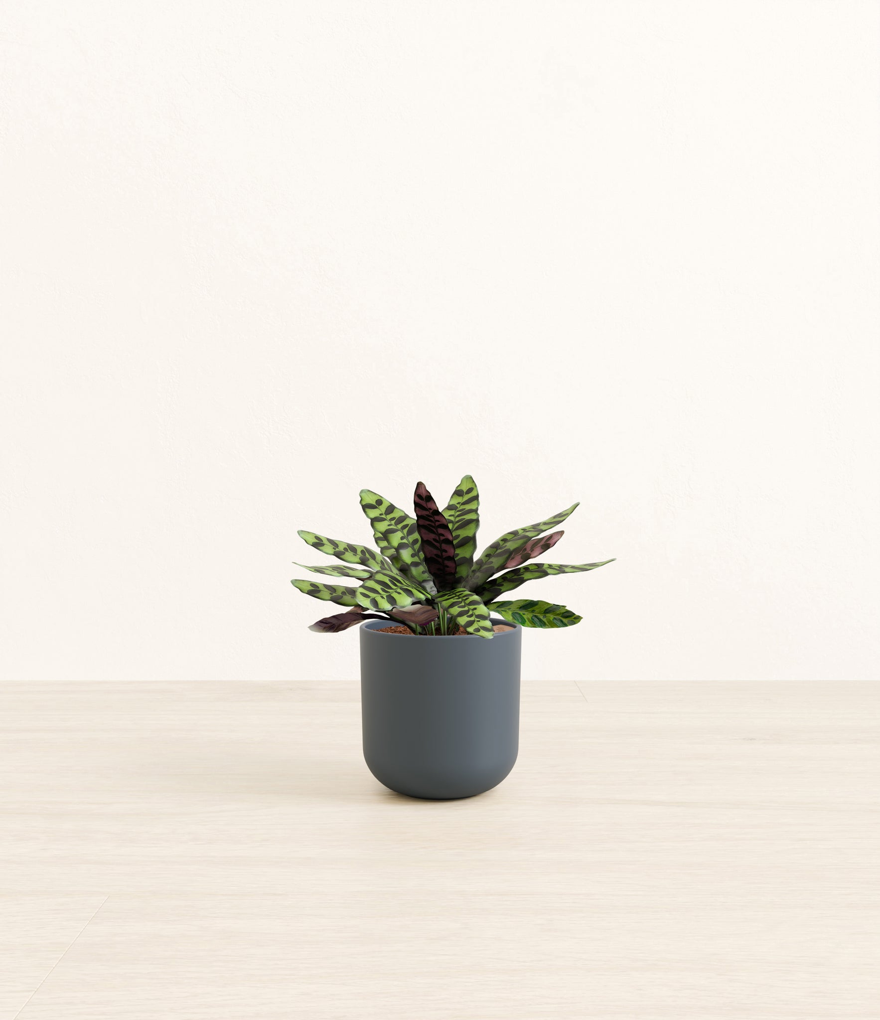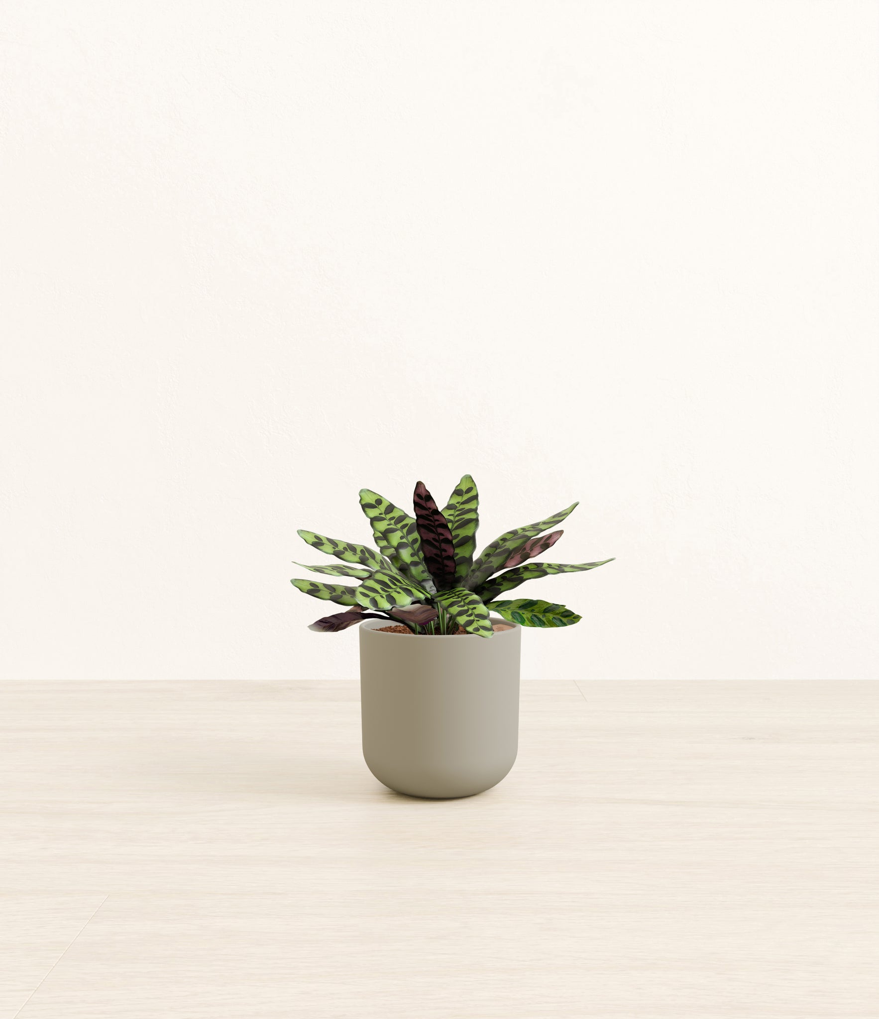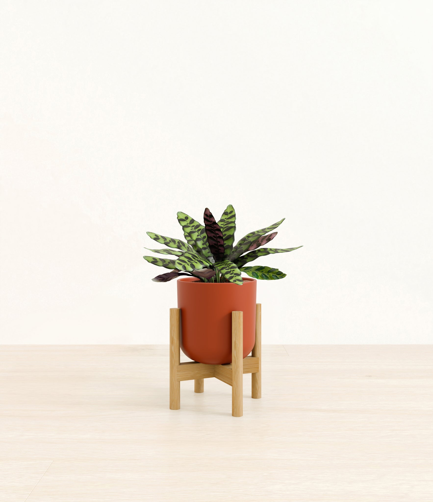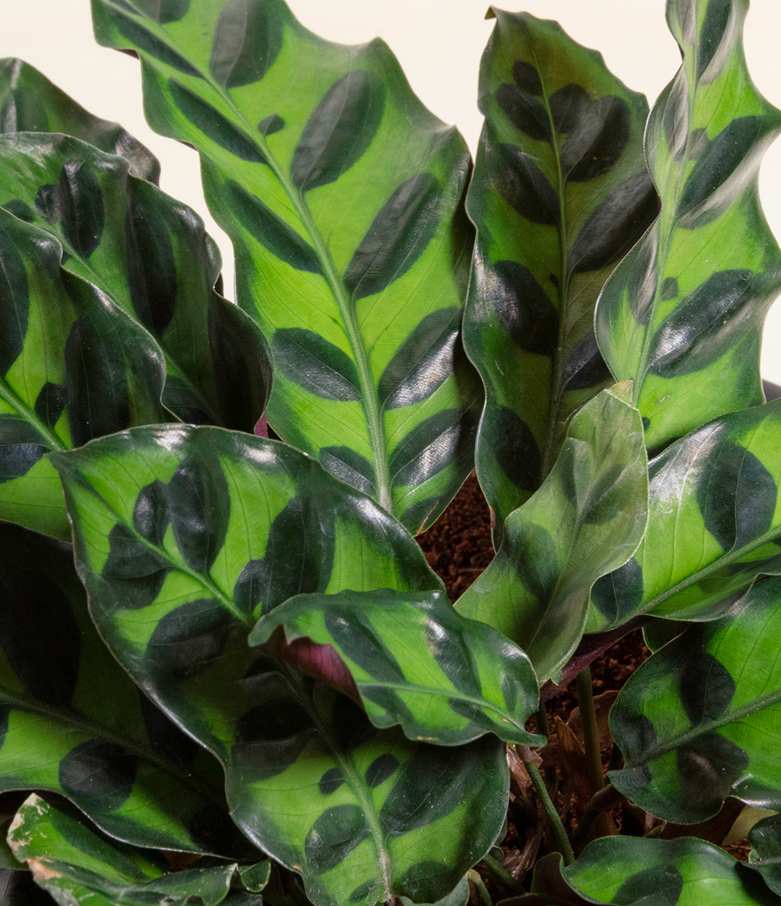 Native to the Amazonian jungles of South America, Rattlesnake Calathea wears an eccentric reptilian pattern on its leaves, with a plum underside and lush green brushstrokes on top. It belongs to the Marantaceae family, known as ‘Prayer Plants’, which much like humans and unlike most plants, have a wake-and-sleep cycle according to a circadian rhythm. This means its leaves move upwards during the night and downwards throughout the day in search of the sun.