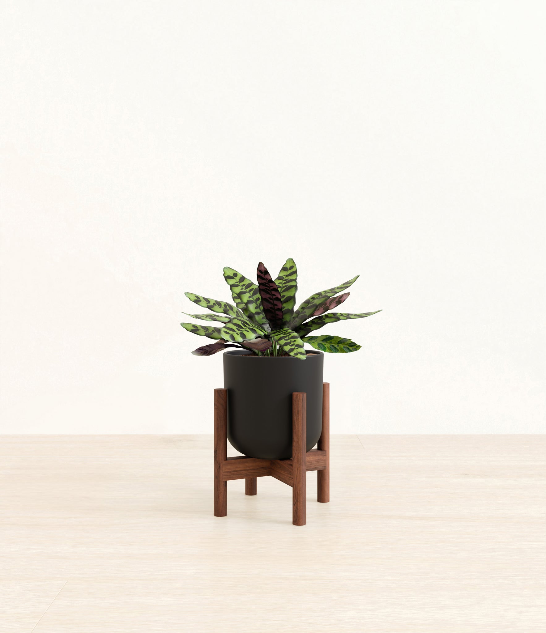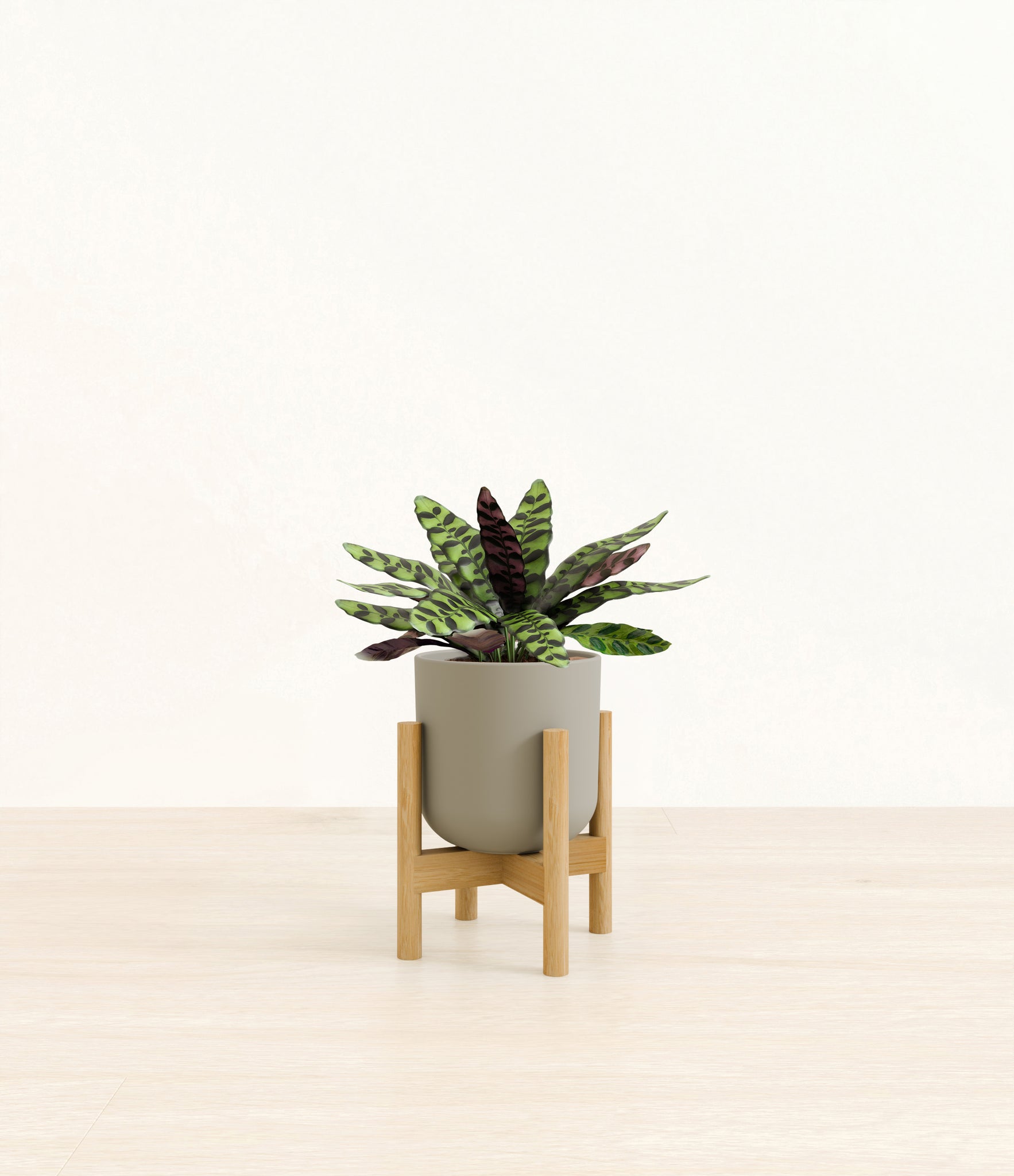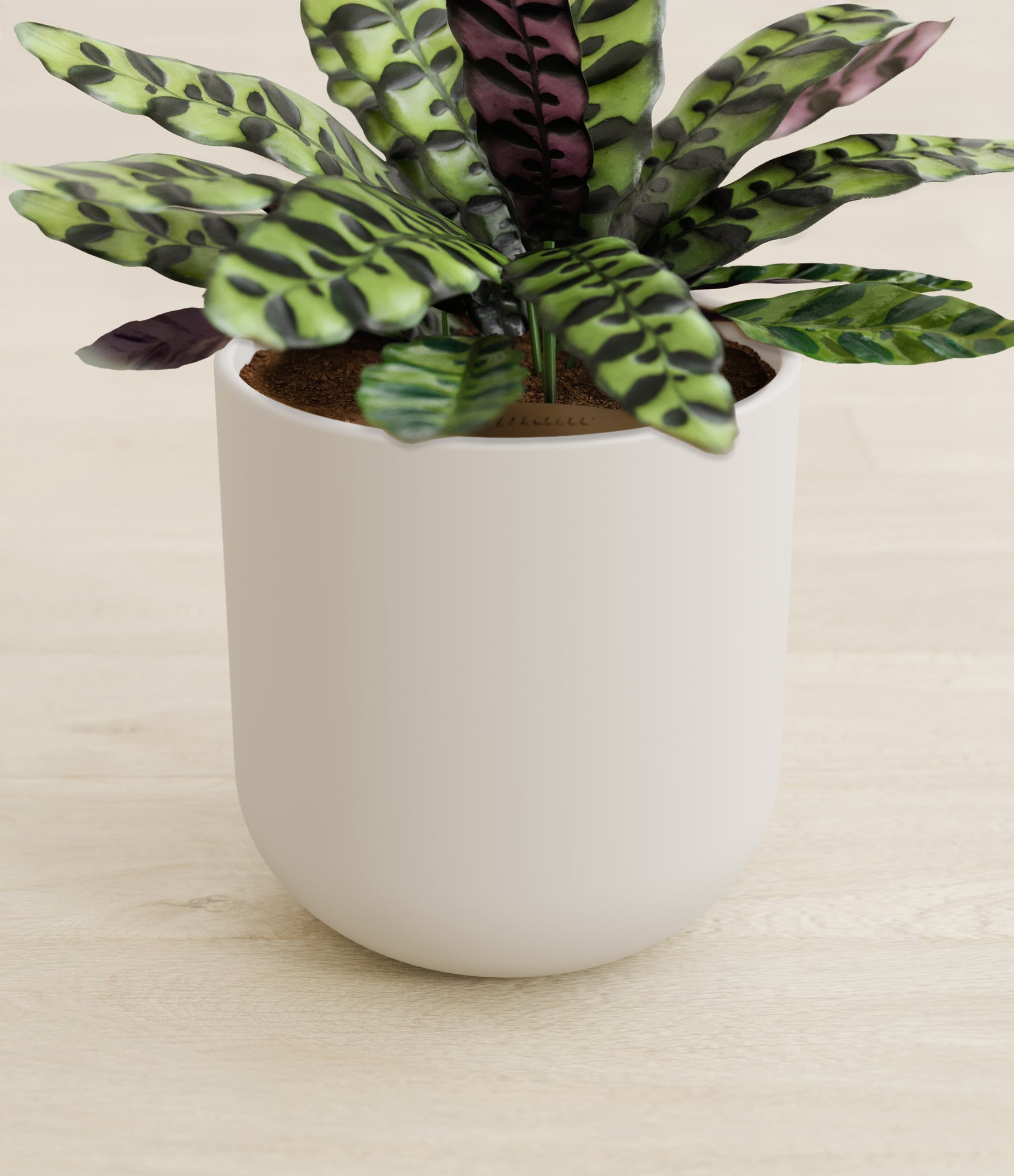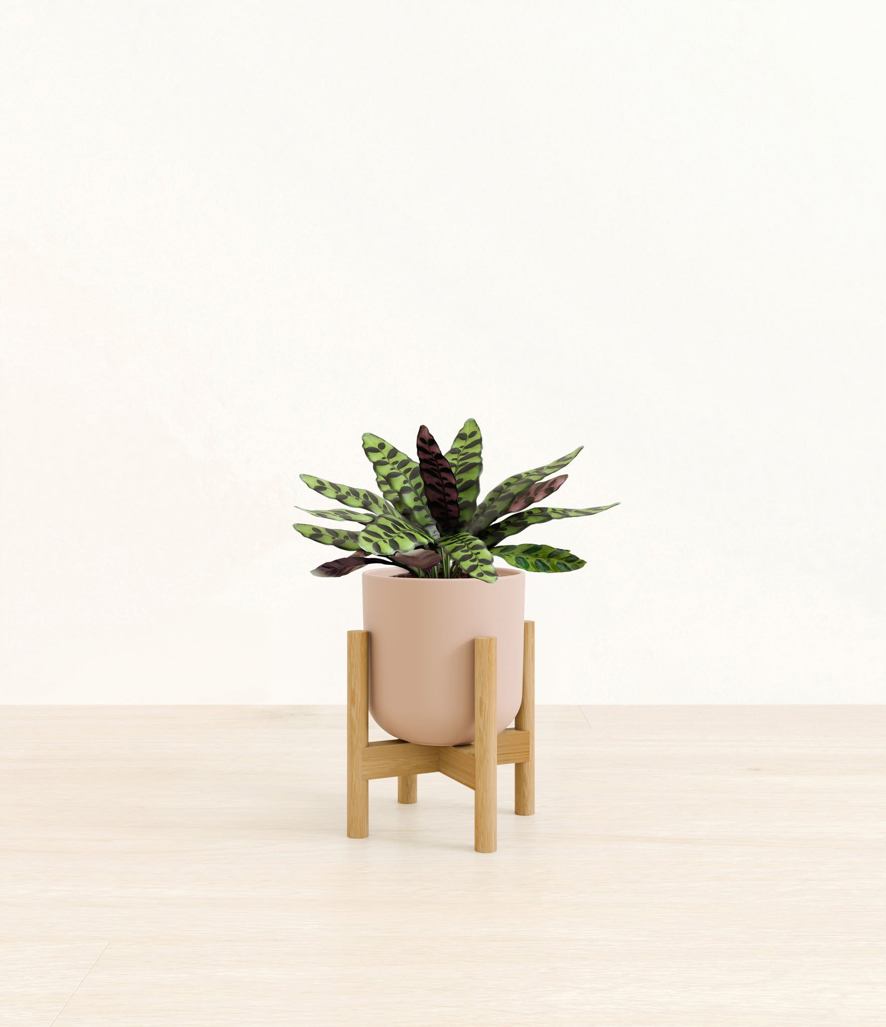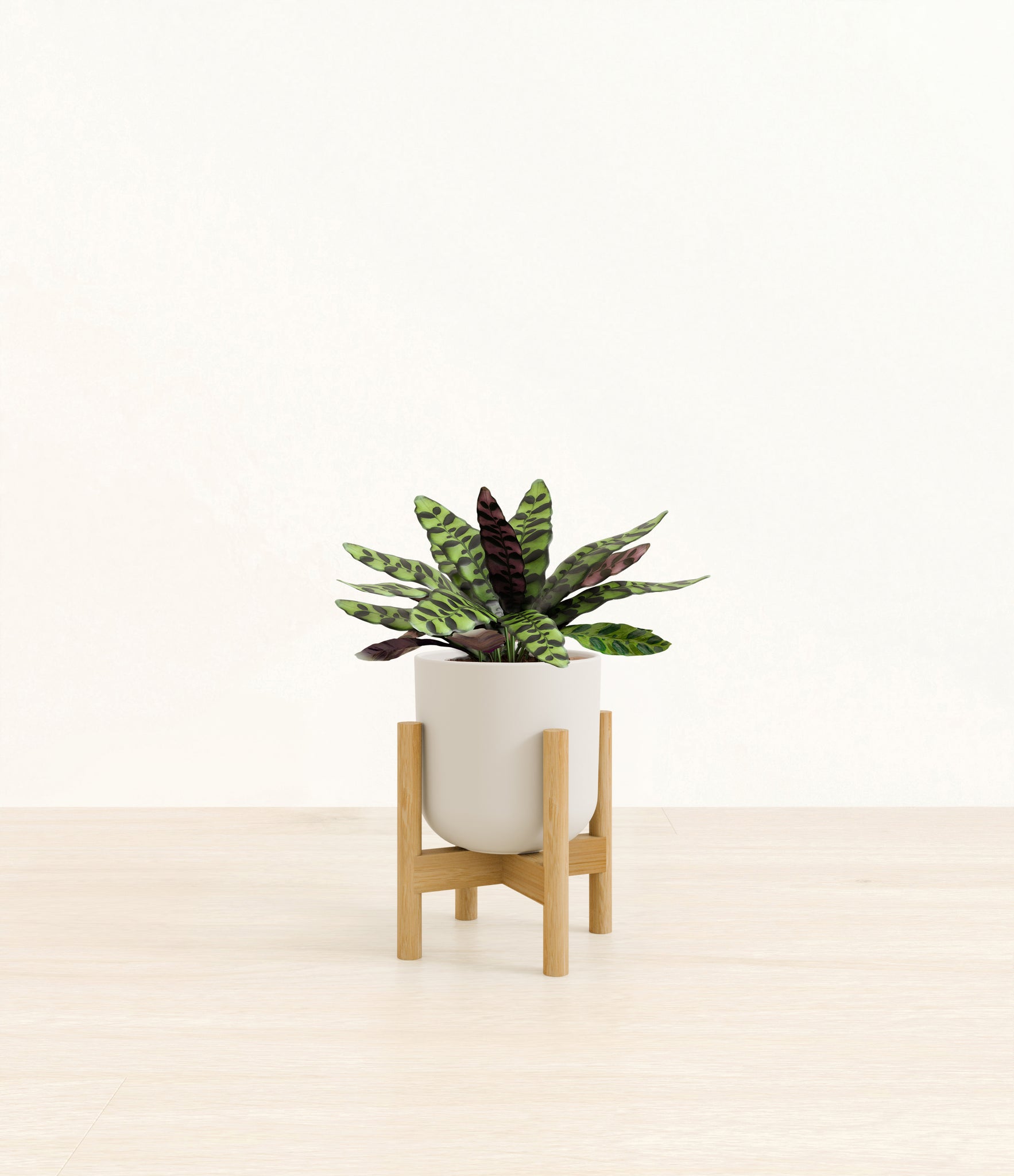 Native to the Amazonian jungles of South America, Rattlesnake Calathea wears an eccentric reptilian pattern on its leaves, with a plum underside and lush green brushstrokes on top. It belongs to the Marantaceae family, known as ‘Prayer Plants’, which much like humans and unlike most plants, have a wake-and-sleep cycle according to a circadian rhythm. This means its leaves move upwards during the night and downwards throughout the day in search of the sun.
