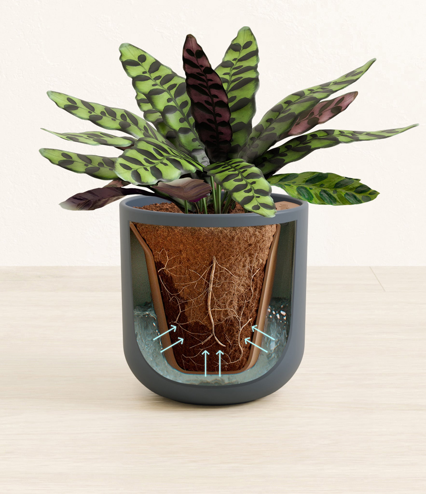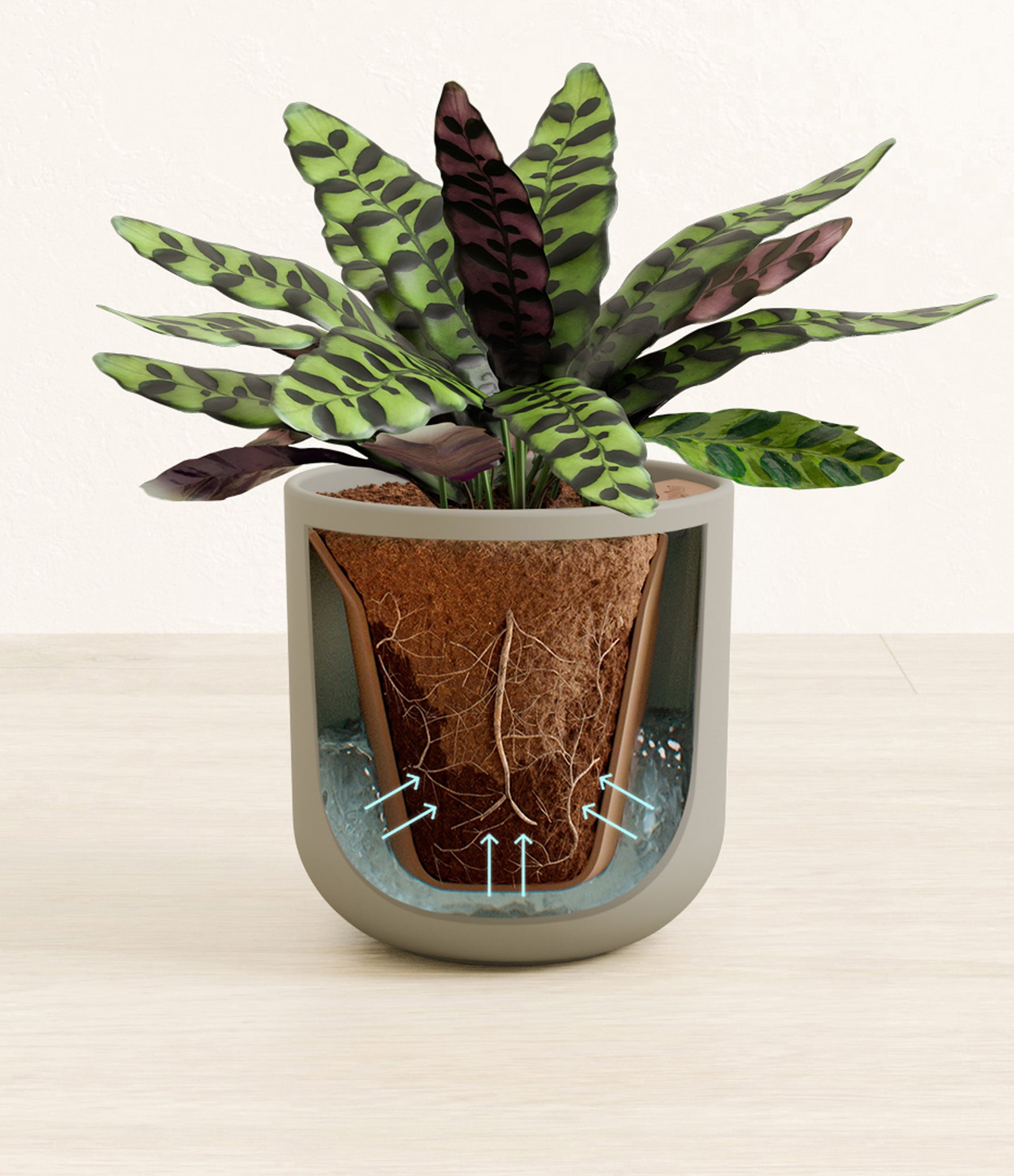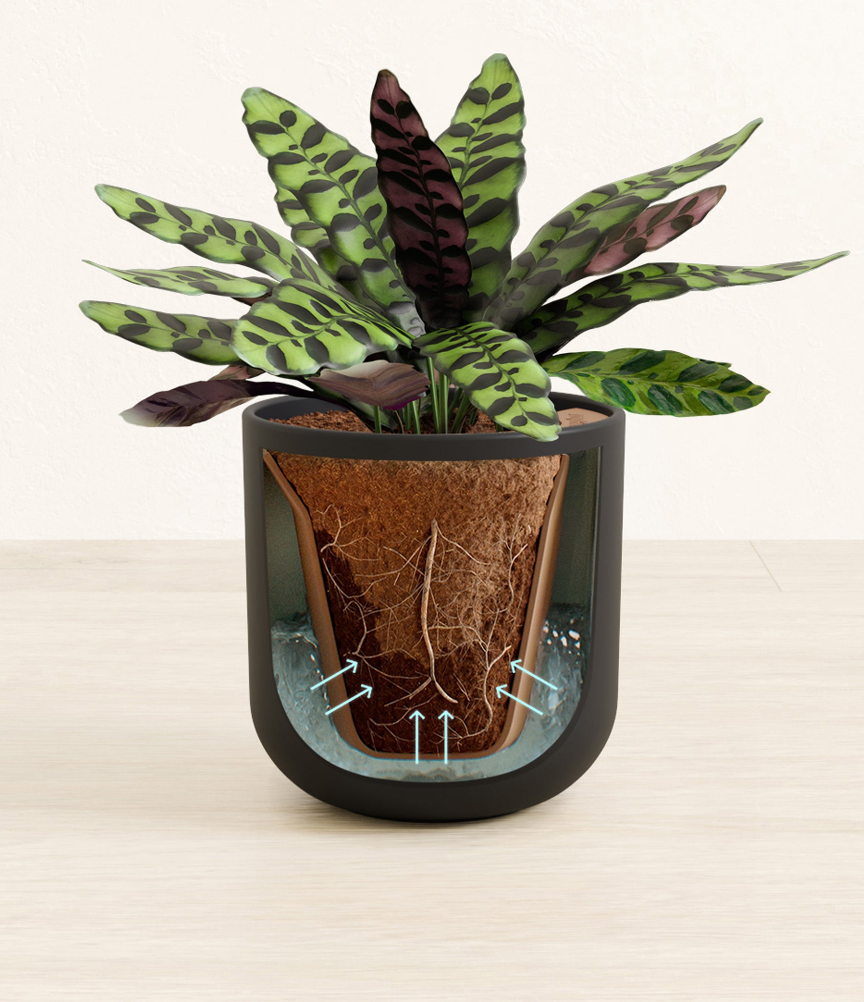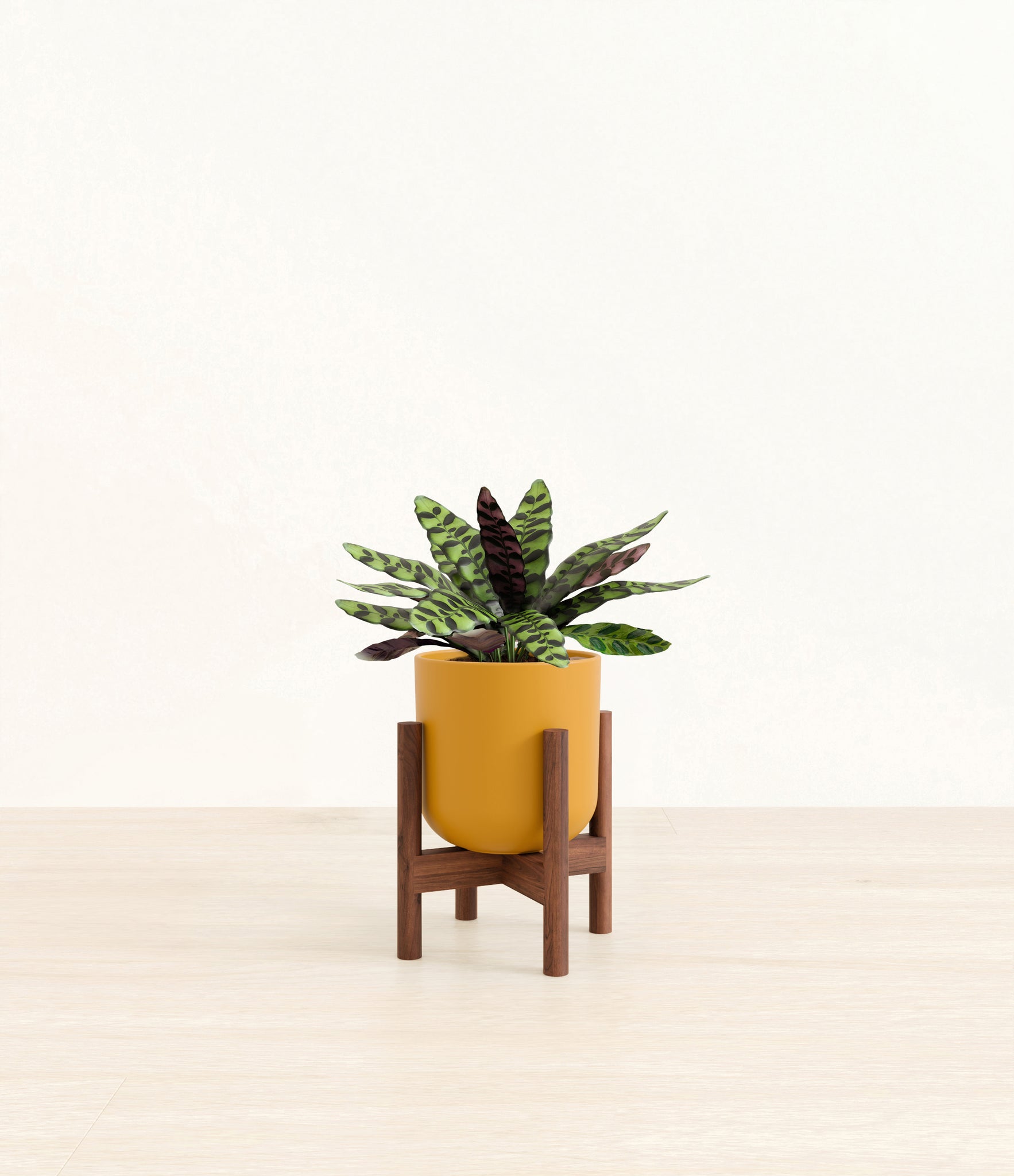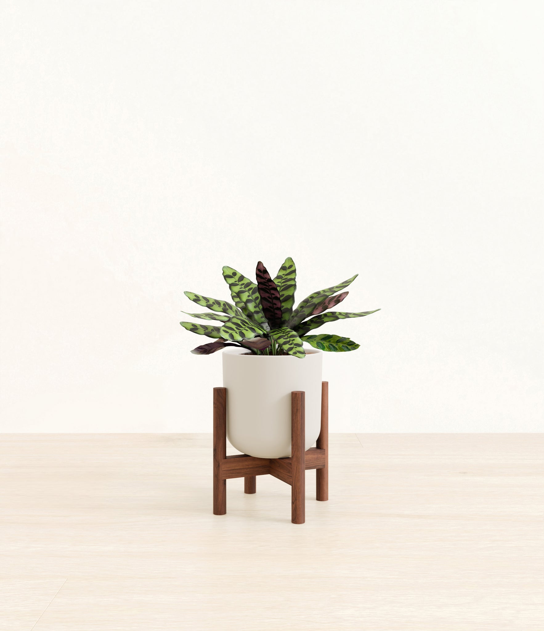 Native to the Amazonian jungles of South America, Rattlesnake Calathea wears an eccentric reptilian pattern on its leaves, with a plum underside and lush green brushstrokes on top. It belongs to the Marantaceae family, known as ‘Prayer Plants’, which much like humans and unlike most plants, have a wake-and-sleep cycle according to a circadian rhythm. This means its leaves move upwards during the night and downwards throughout the day in search of the sun.
