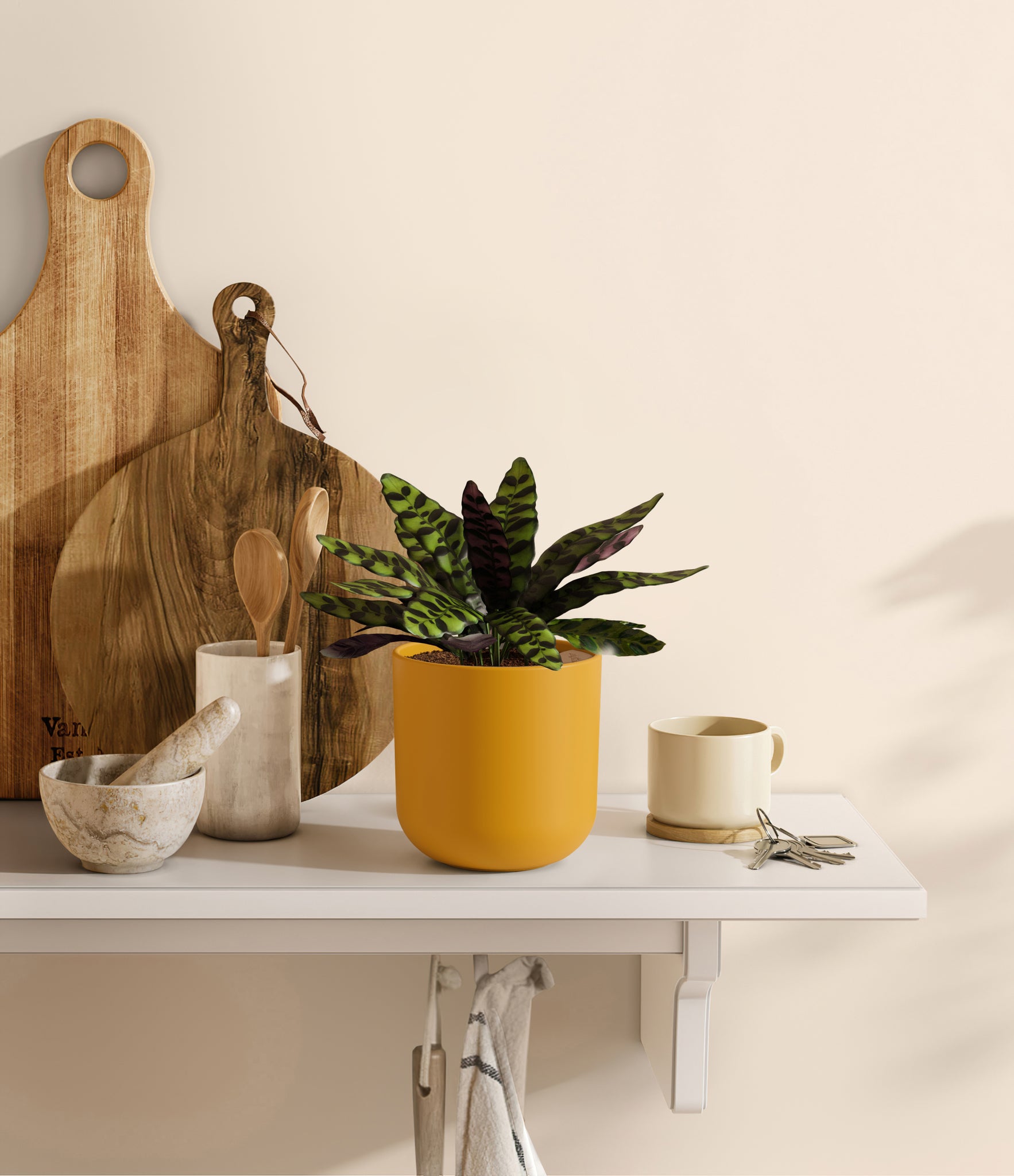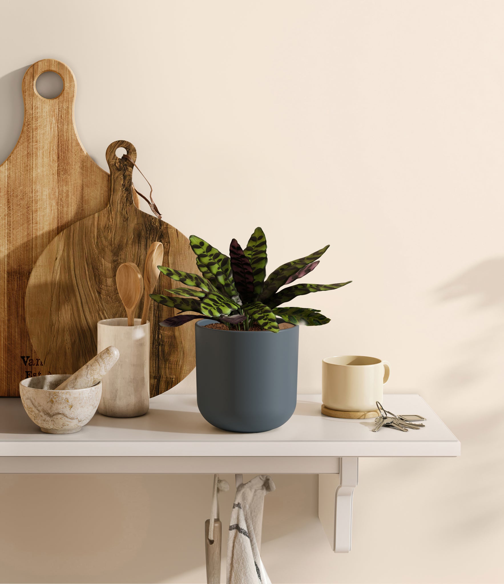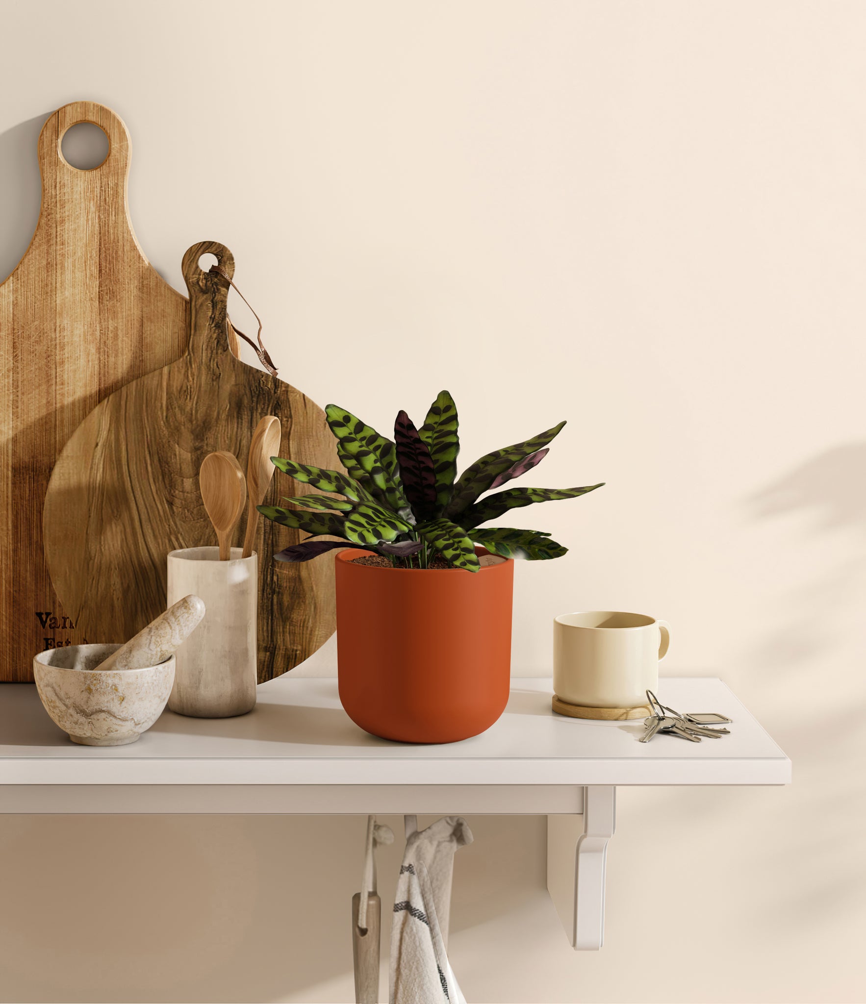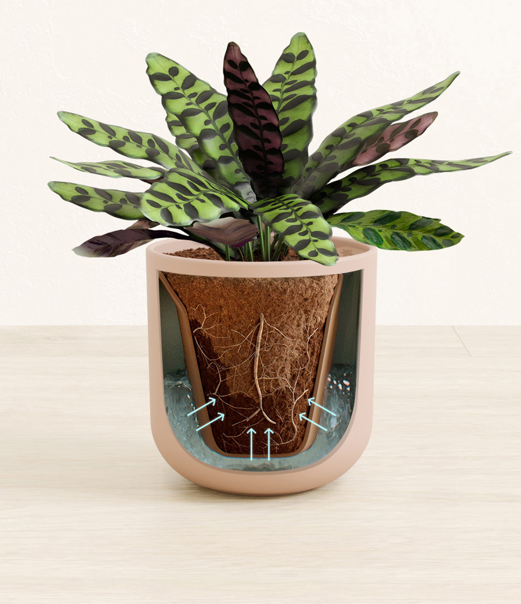 Native to the Amazonian jungles of South America, Rattlesnake Calathea wears an eccentric reptilian pattern on its leaves, with a plum underside and lush green brushstrokes on top. It belongs to the Marantaceae family, known as ‘Prayer Plants’, which much like humans and unlike most plants, have a wake-and-sleep cycle according to a circadian rhythm. This means its leaves move upwards during the night and downwards throughout the day in search of the sun.