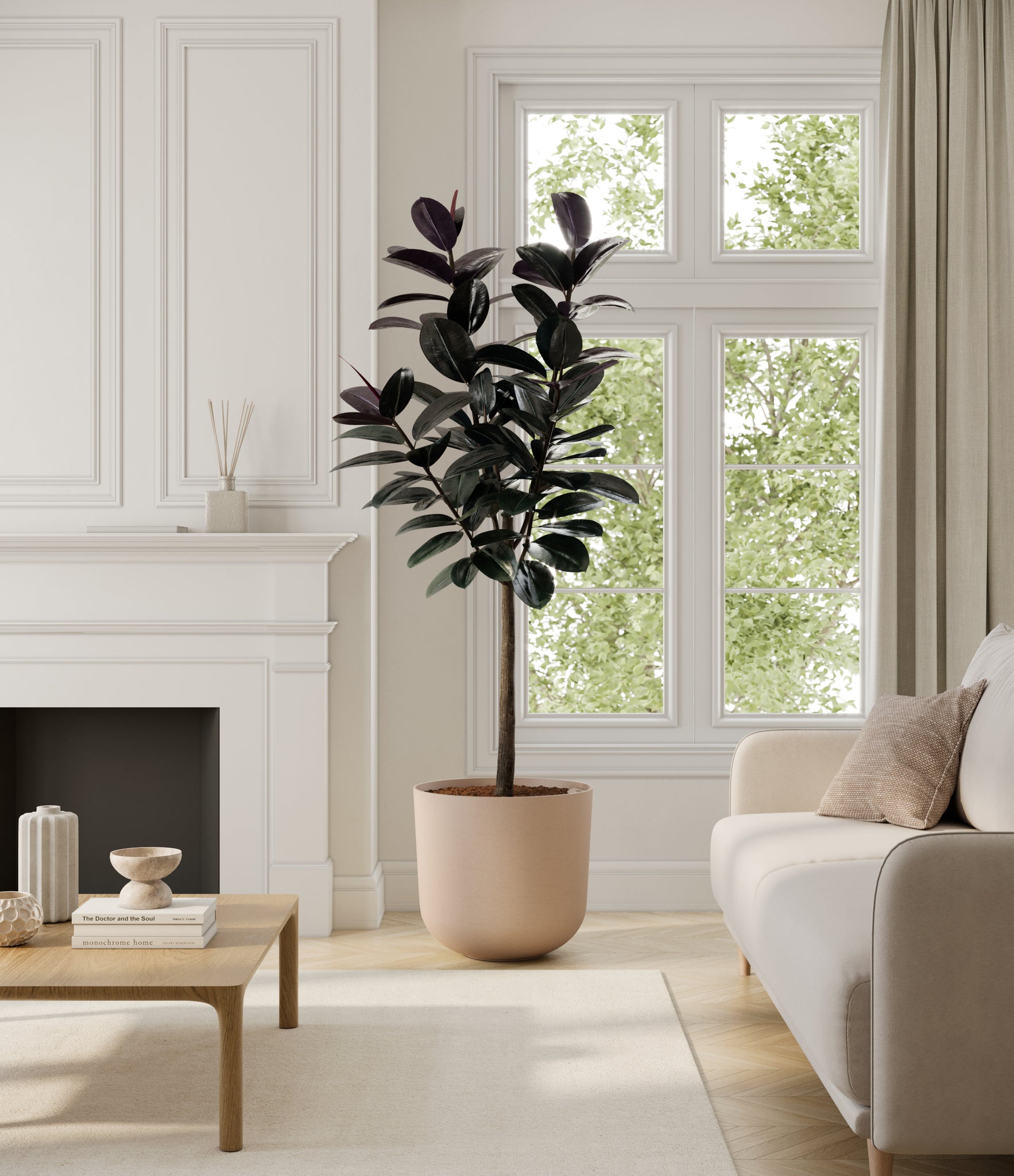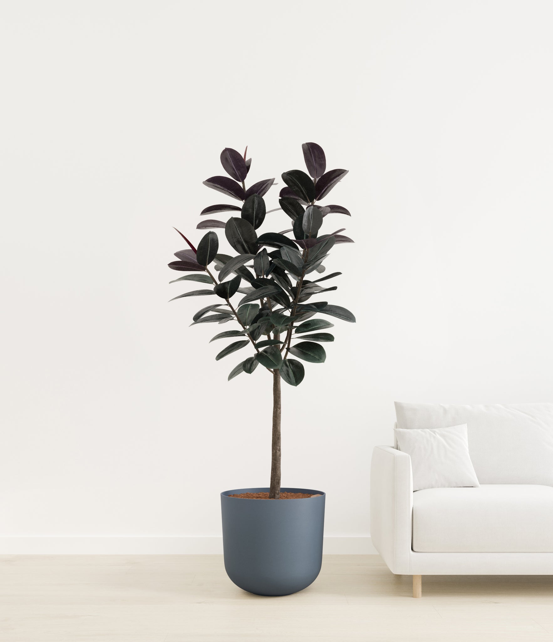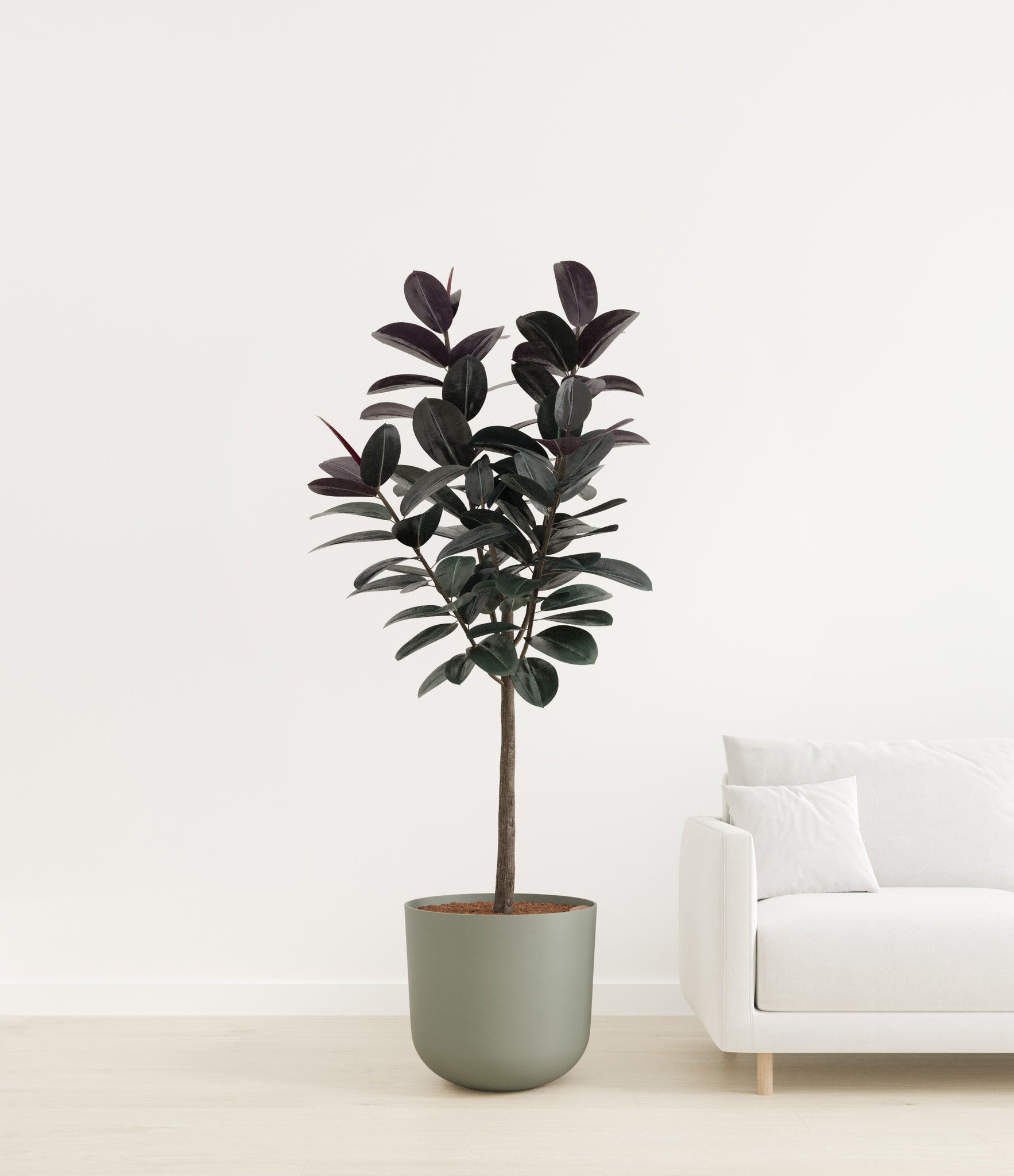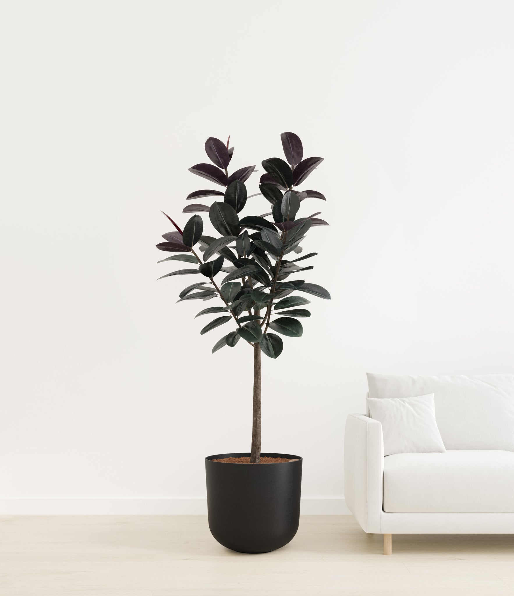 Native to Southeast Asia, the tropical Rubber Tree, also known as Ficus Burgundy, loves warmth and sun. In Feng Shui, its round-shaped leaves are known to soften up the space, and it is believed to bring good fortune and wealth. Historically, its milky white sap was used by ancient civilizations to produce rubber. With its great size and inherent ability to purify the air from common household toxins, Rubber Tree makes a perfect indoor plant loved for its ease of growing.