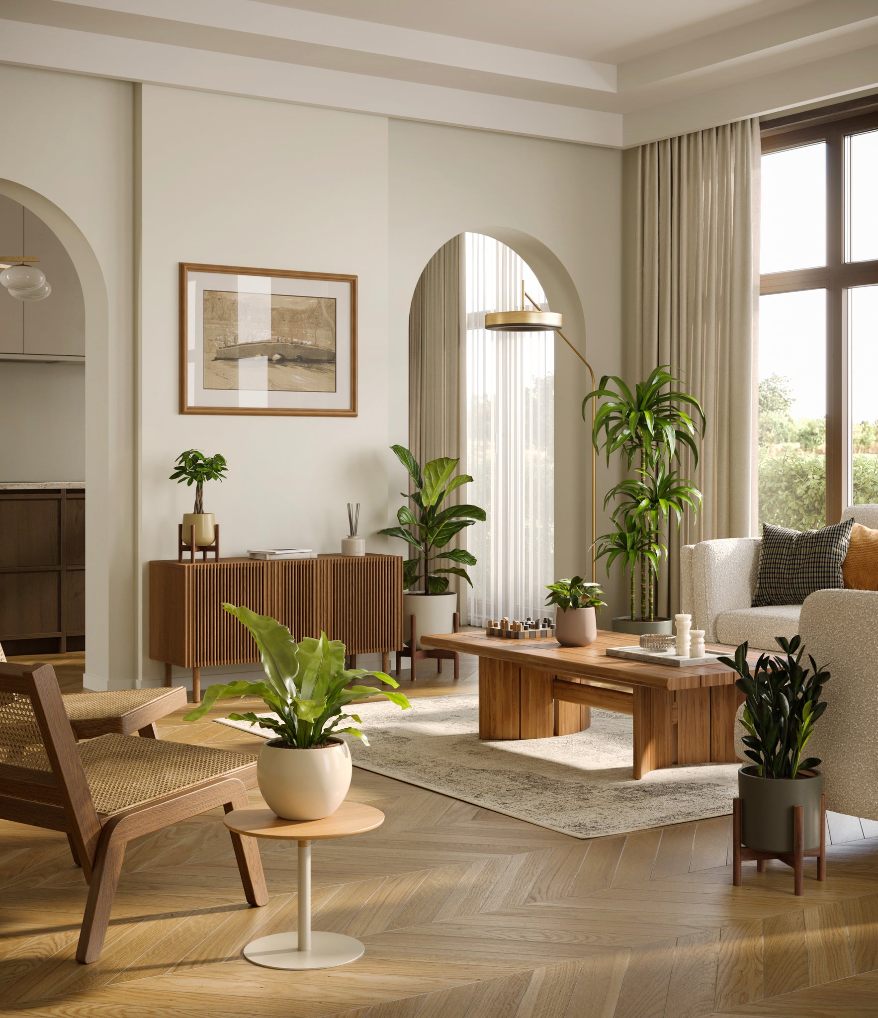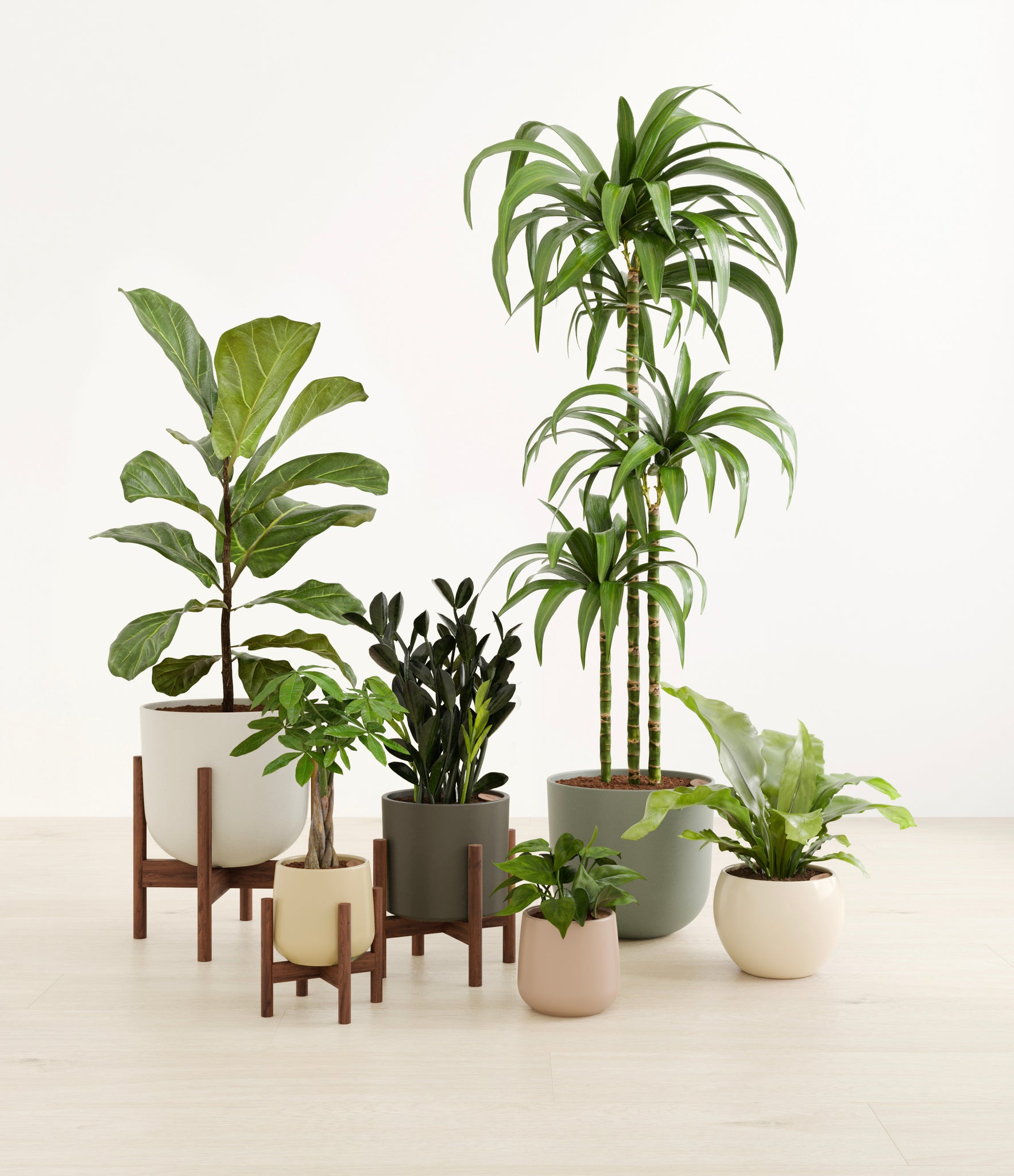 In this collection, you’ll receive six beloved houseplants that bring texture, depth, and timeless style to any space. The set includes a small Money Tree, long cherished as a symbol of good fortune and prosperity; a small Heartleaf Philodendron, with trailing, heart-shaped leaves that add a touch of softness and movement; a medium Black ZZ Plant, a sculptural beauty with dark, glossy foliage and unmatched resilience; a medium Birds’ Nest Fern, bursting with wavy, bright green fronds in a fluttering rosette; a large Fiddle Leaf Fig, a statement piece with bold, lyre-shaped leaves; and a huge Janet Craig, a hardy favorite known for its upright form and rich green color. Together, these six create a balanced, lush display, bringing both structure and flow to your indoor jungle.