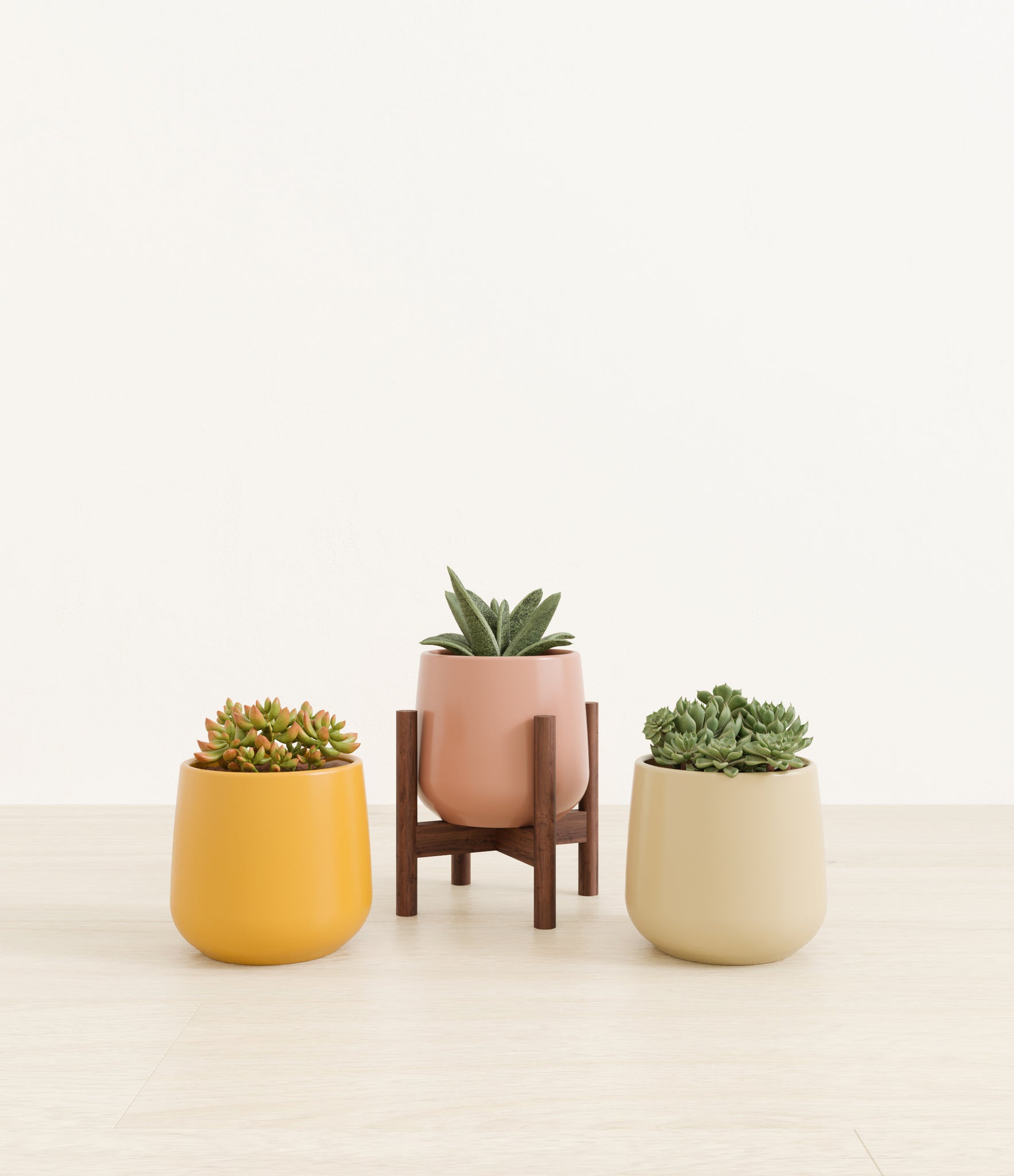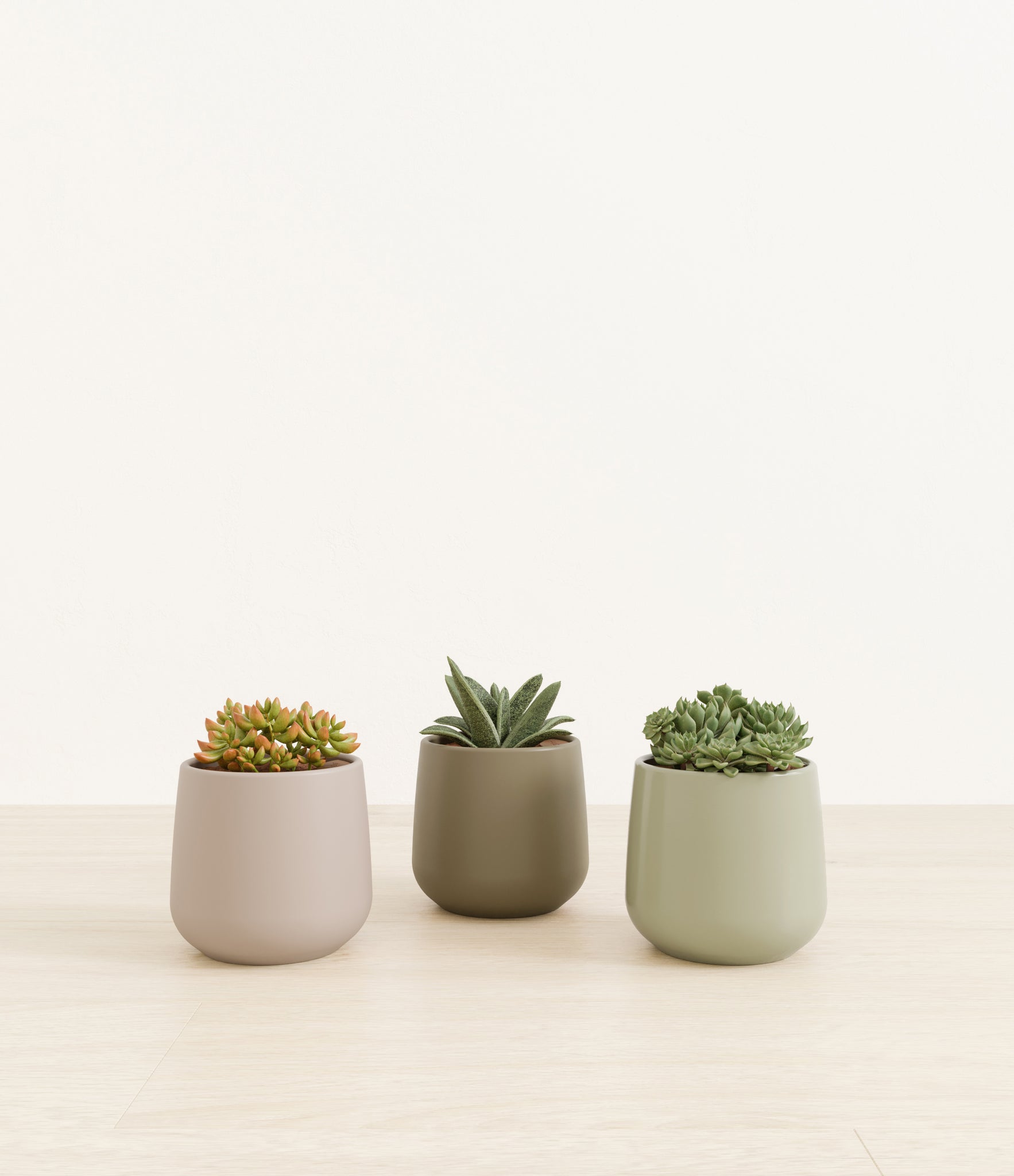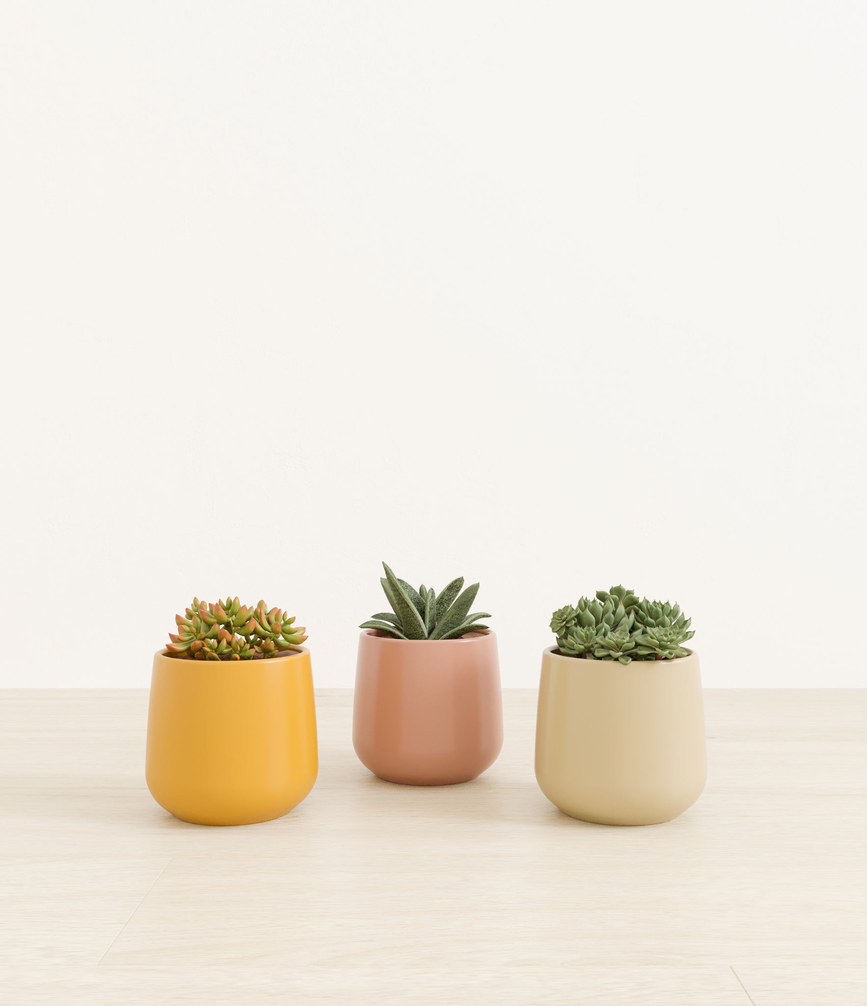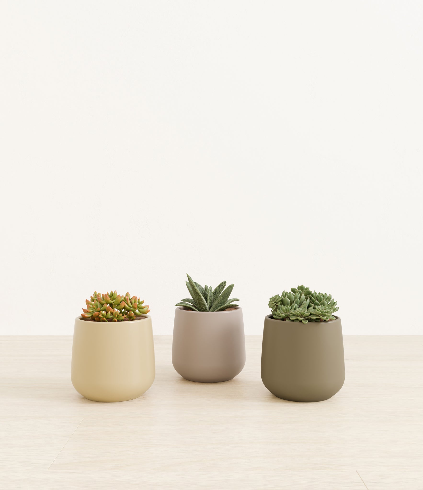 In this collection, you’ll receive a carefully curated set of three petite succulents that radiate calm and charm. The assortment includes a small Gasteria, known for its distinctive, speckled leaves arranged in graceful rosettes; small Hens and Chicks, a beloved classic that multiplies with adorable clusters of rosettes; and a small Firestorm Sedum, glowing with fiery edges that add a lively touch. United in their resilience and beauty, this serene trio stays effortlessly radiant with easyplant’s care, needing just one watering every three months to brighten shelves, desks, or windowsills.