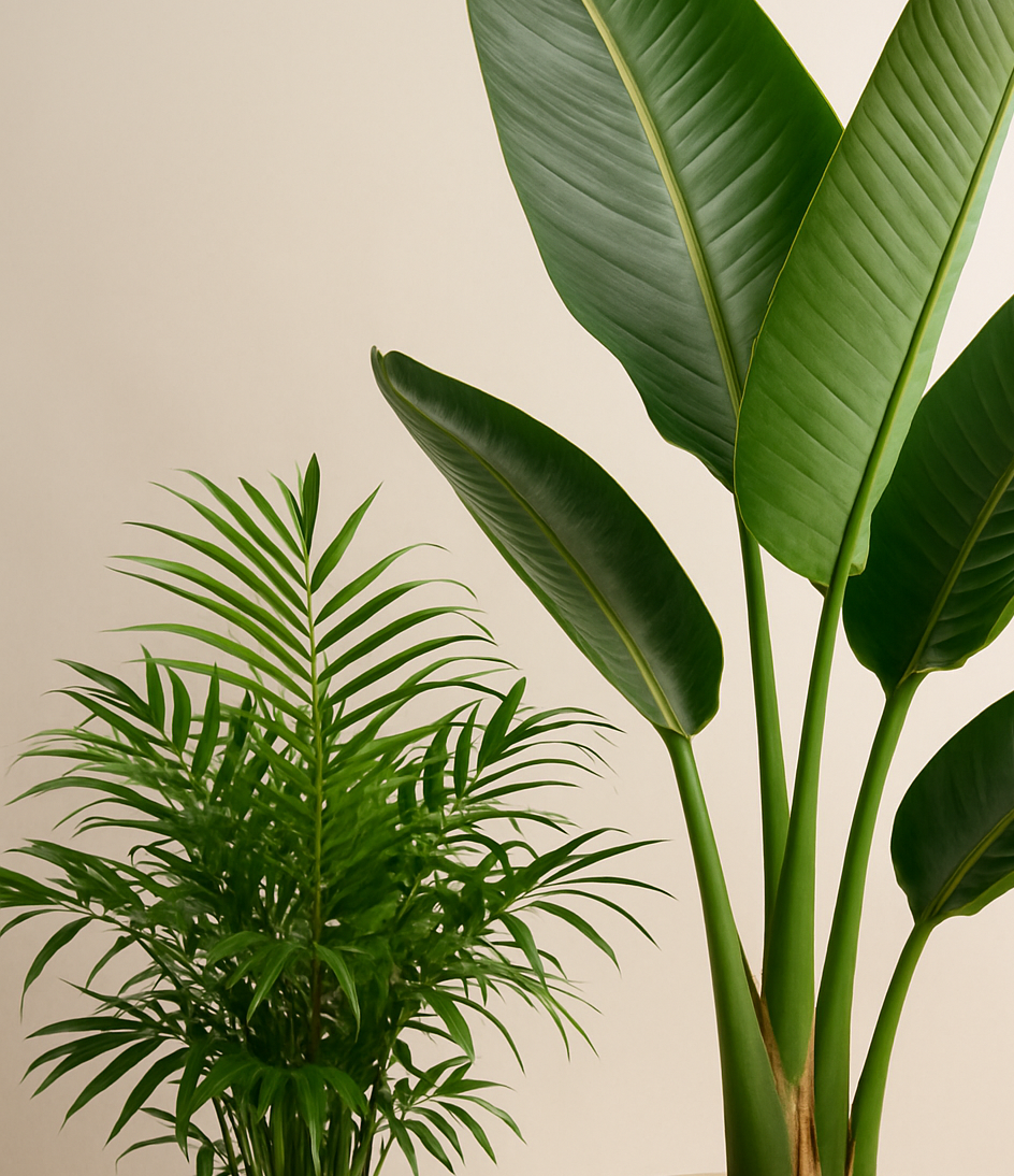 In this set, you'll receive two pristine houseplants that perfectly complement one another. The huge White Bird of Paradise towers to great heights and playfully hangs like birds in flight, while the medium Parlor Palm shines with a beautifully lush texture and delicate energy, making it a must-have centerpiece for ultimate radiance.