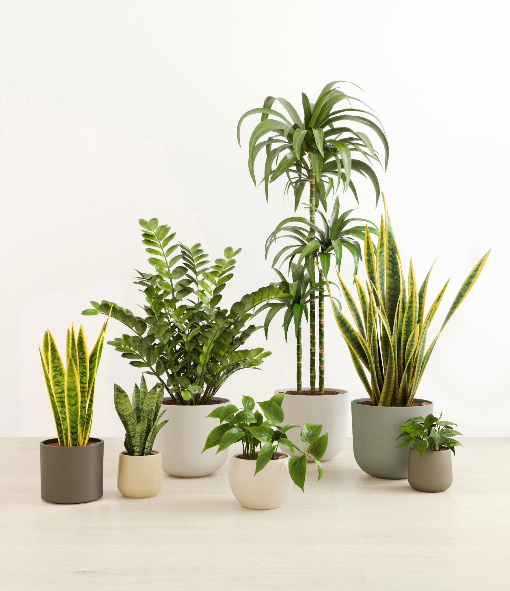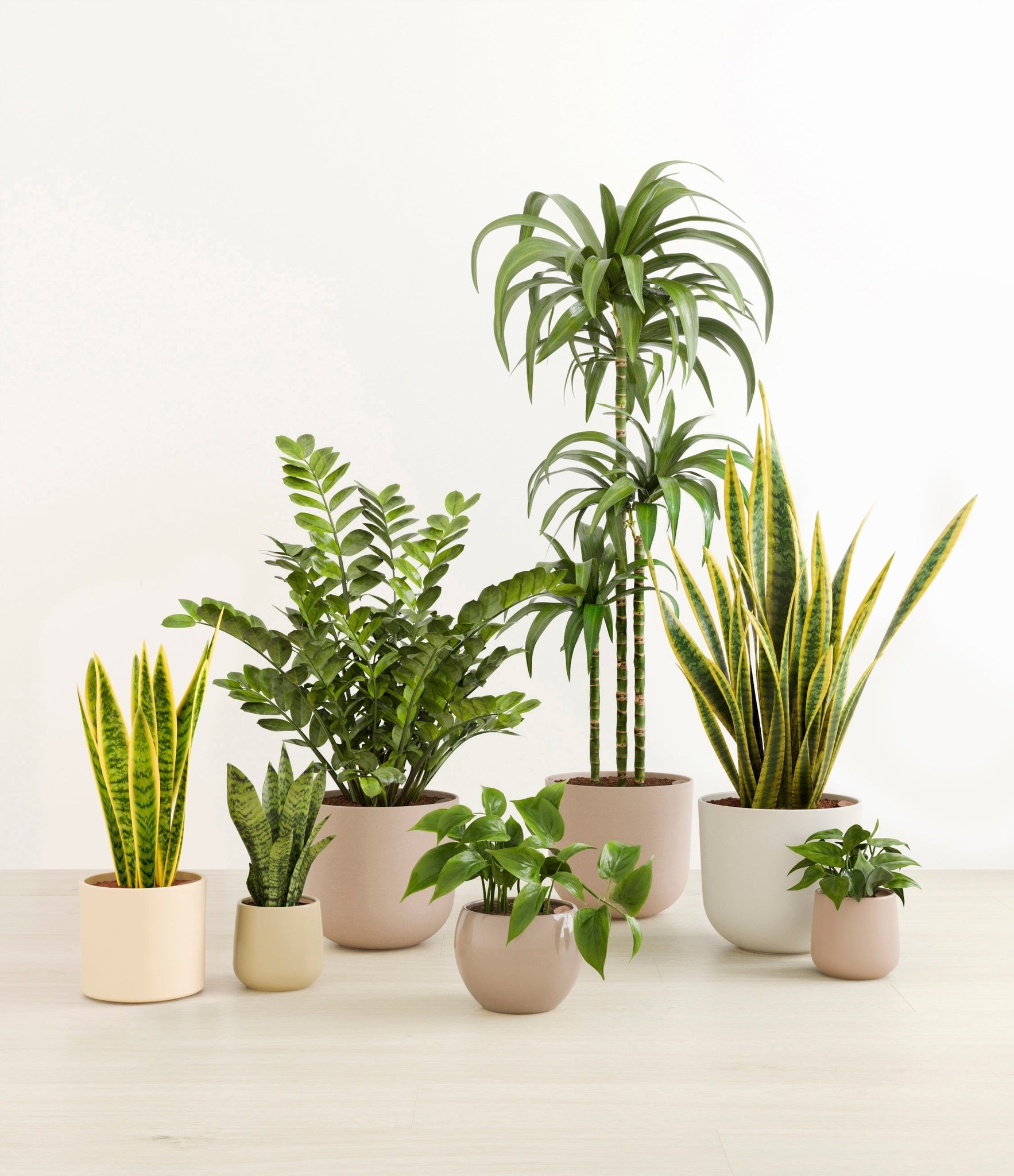 In this collection, you'll receive seven beautiful, easy-to-maintain houseplants that instantly enhance every space – even those lacking light – and are considered the best air-purifying plants. The assortment includes a small Heartleaf Philodendron with trailing forest green heart-shaped foliage; small, medium, and large Snake plants with tall vibrant green leaves edged with streaks of sunshine; a medium Jade Pothos with graceful vines and enchanting foliage; a large ZZ Plant, which thrives under almost any condition, making it a favorite in every plant collection; and a huge Dracaena Janet Craig wearing luscious thick and wavy foliage.