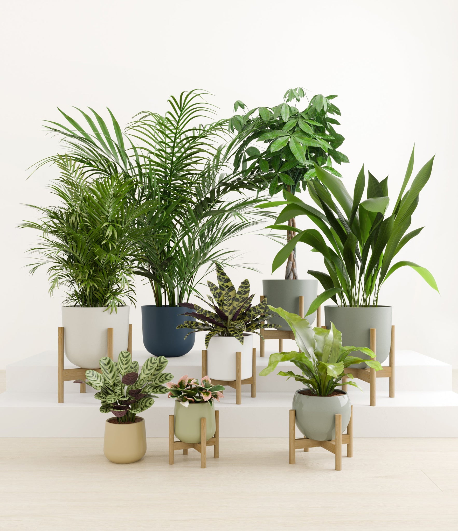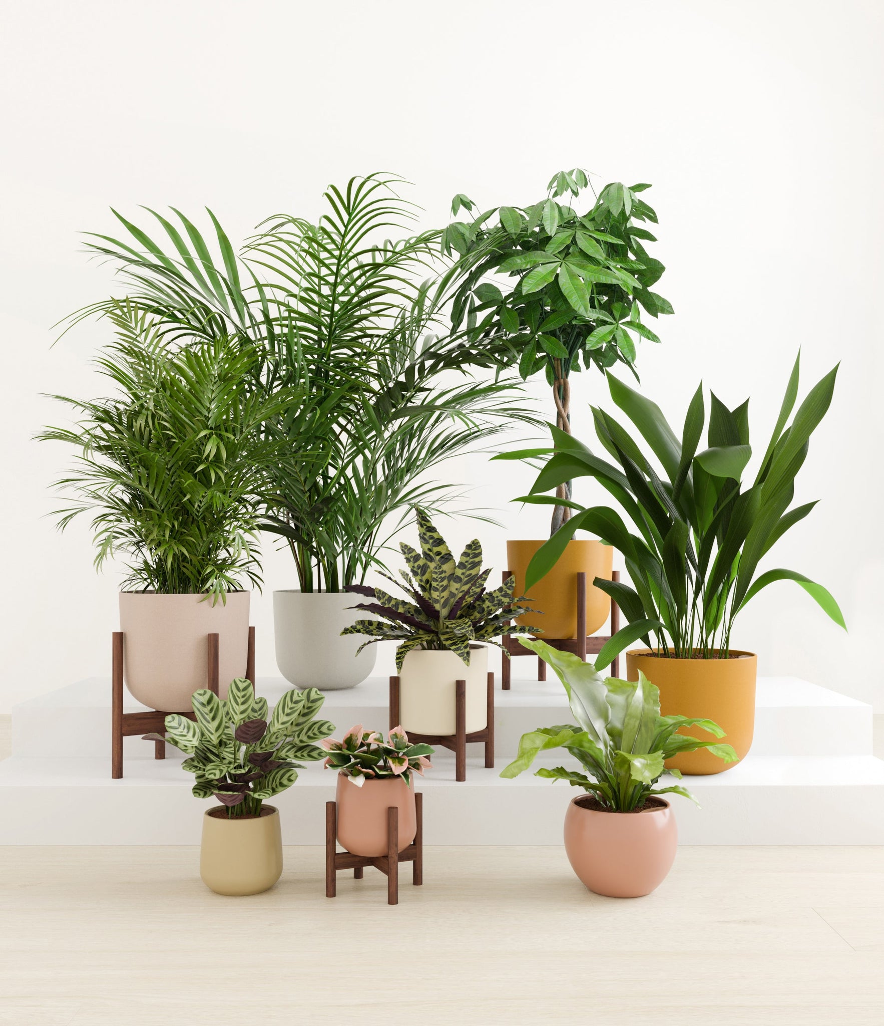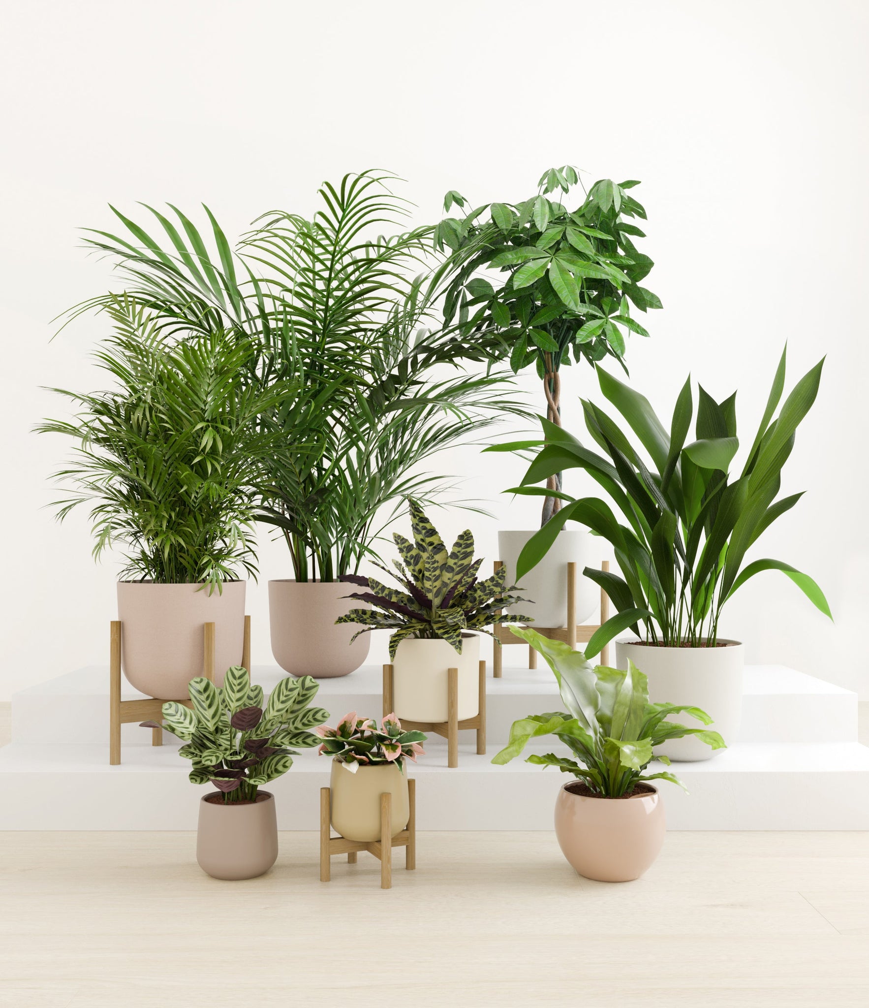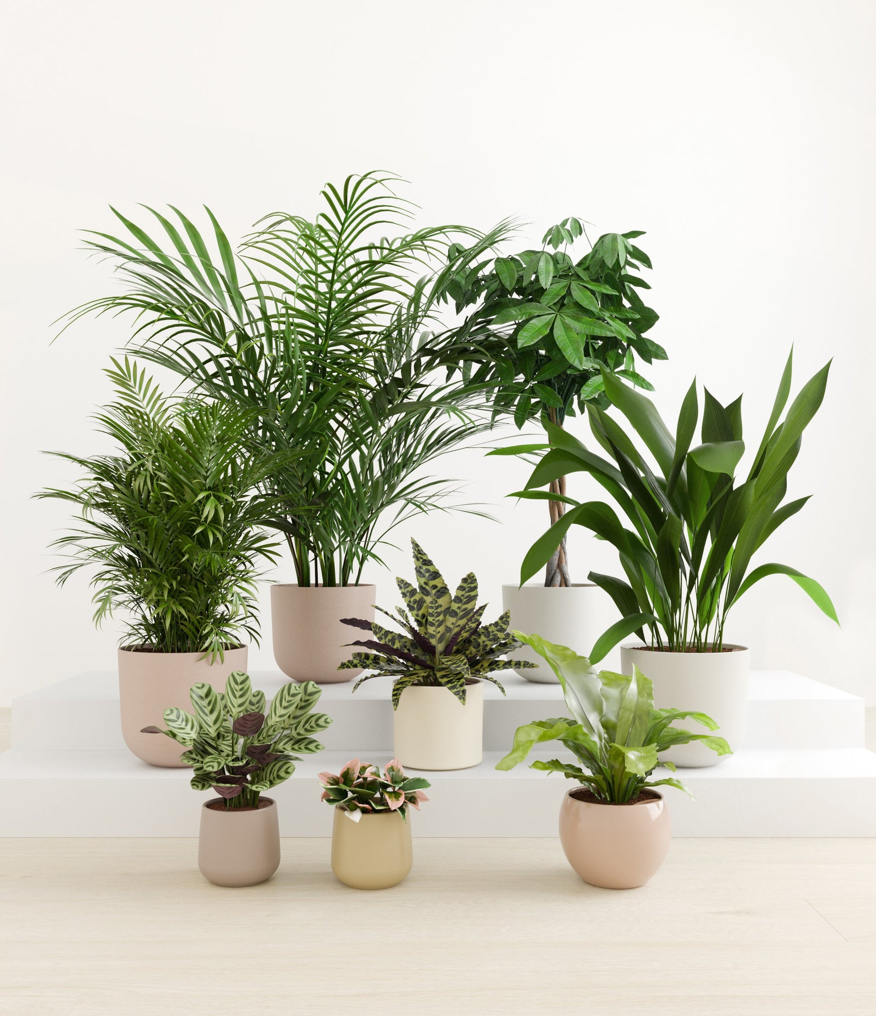 In this collection, you’ll receive eight tropical pet-friendly houseplants that make any space feel like a serene indoor jungle. The set includes a small Marxii Calathea, displaying intricate rippling foliage; a small Hoya Tricolor, with marvelous variegations of pink and white on deep green leaves; a medium Bird’s Nest Fern, bursting with bright green, wavy fronds; and a medium Rattlesnake Calathea, wearing its signature reptilian pattern. For the large plants, you'll receive a Cast Iron Plant, known for its incredible resilience, and a large Parlor Palm, offering a timeless touch of greenery. For the grand statement pieces, you'll enjoy a huge Money Tree, symbolizing good fortune and prosperity, and a huge Areca Palm, adding a dash of tropical elegance.