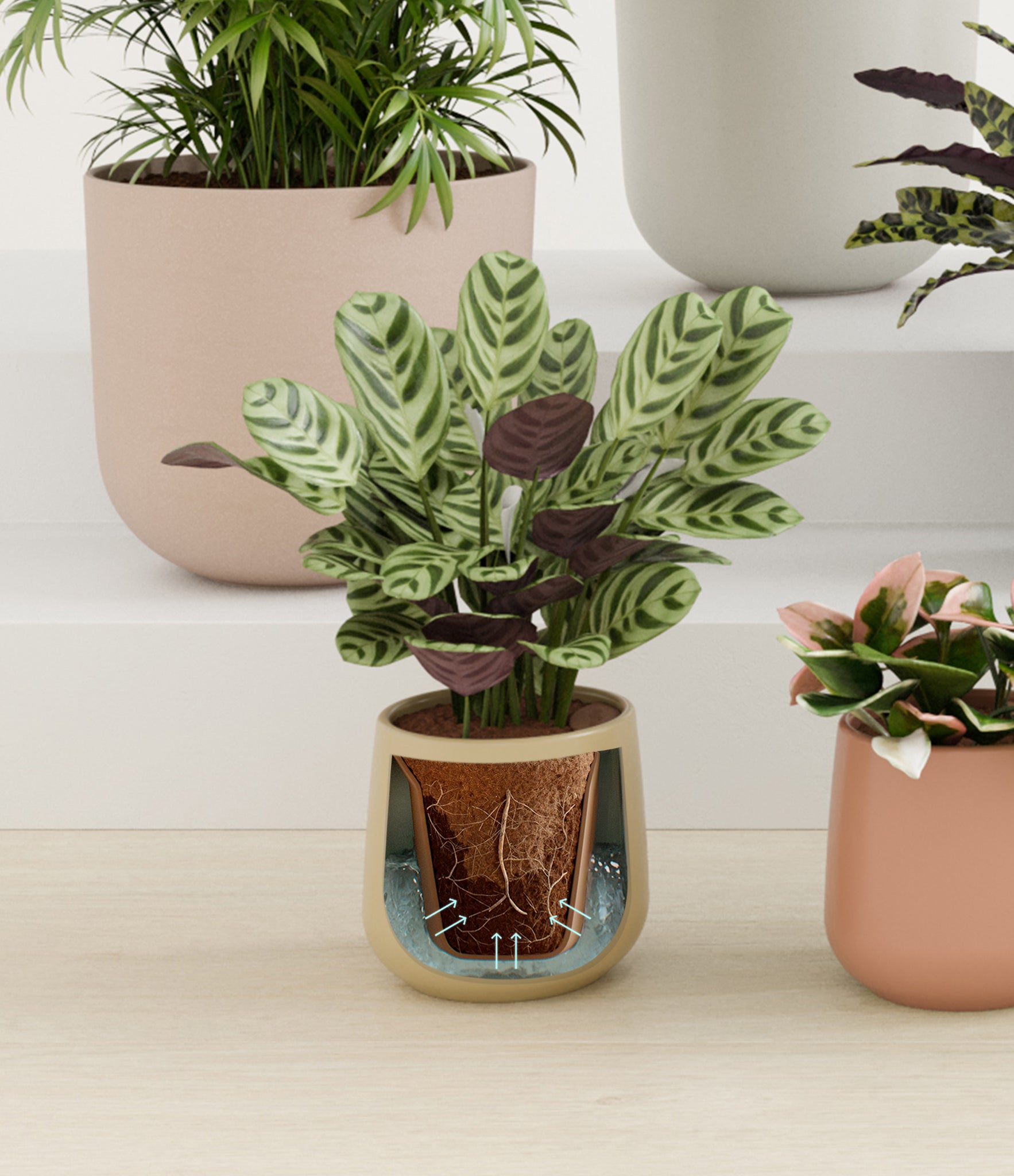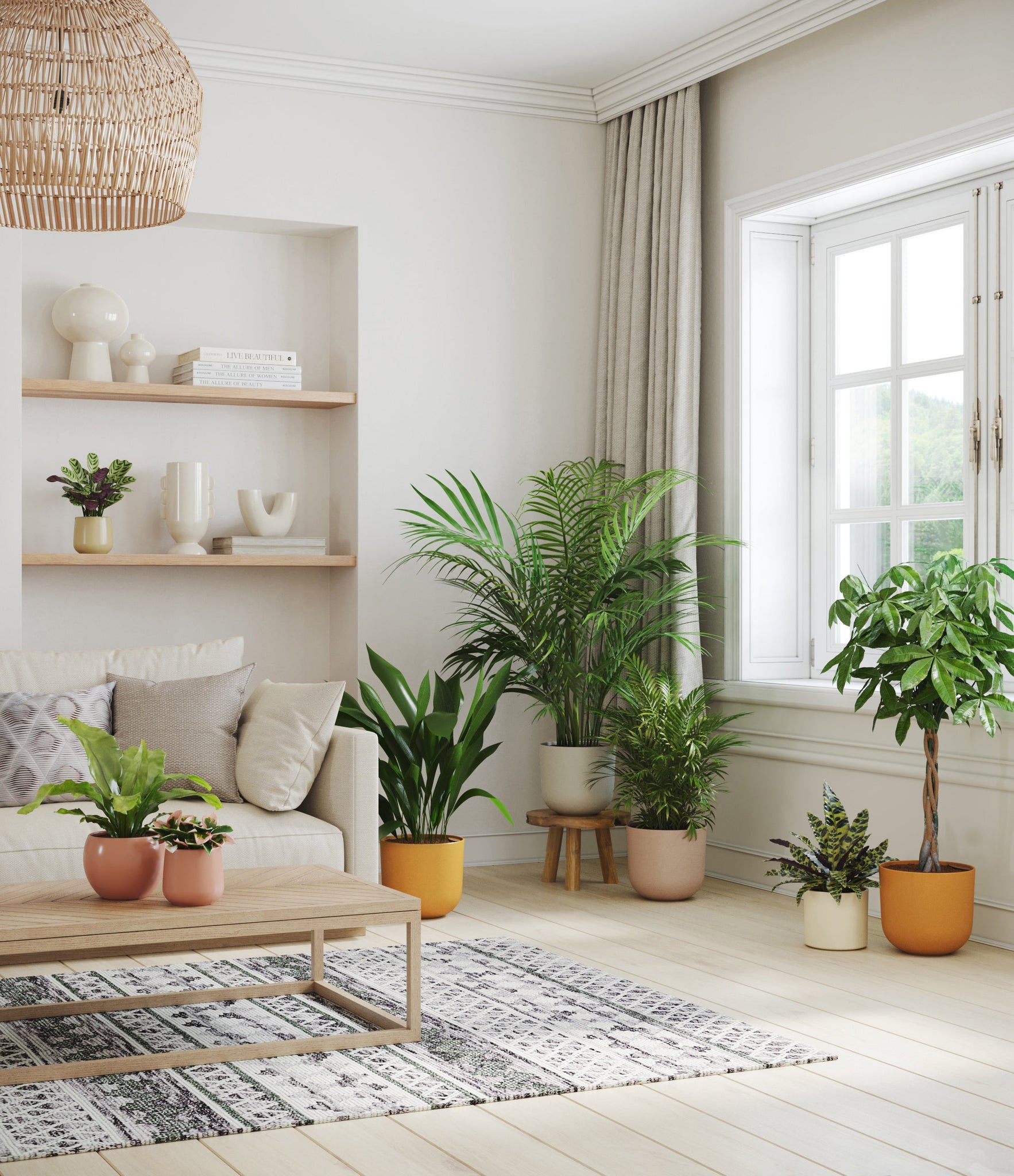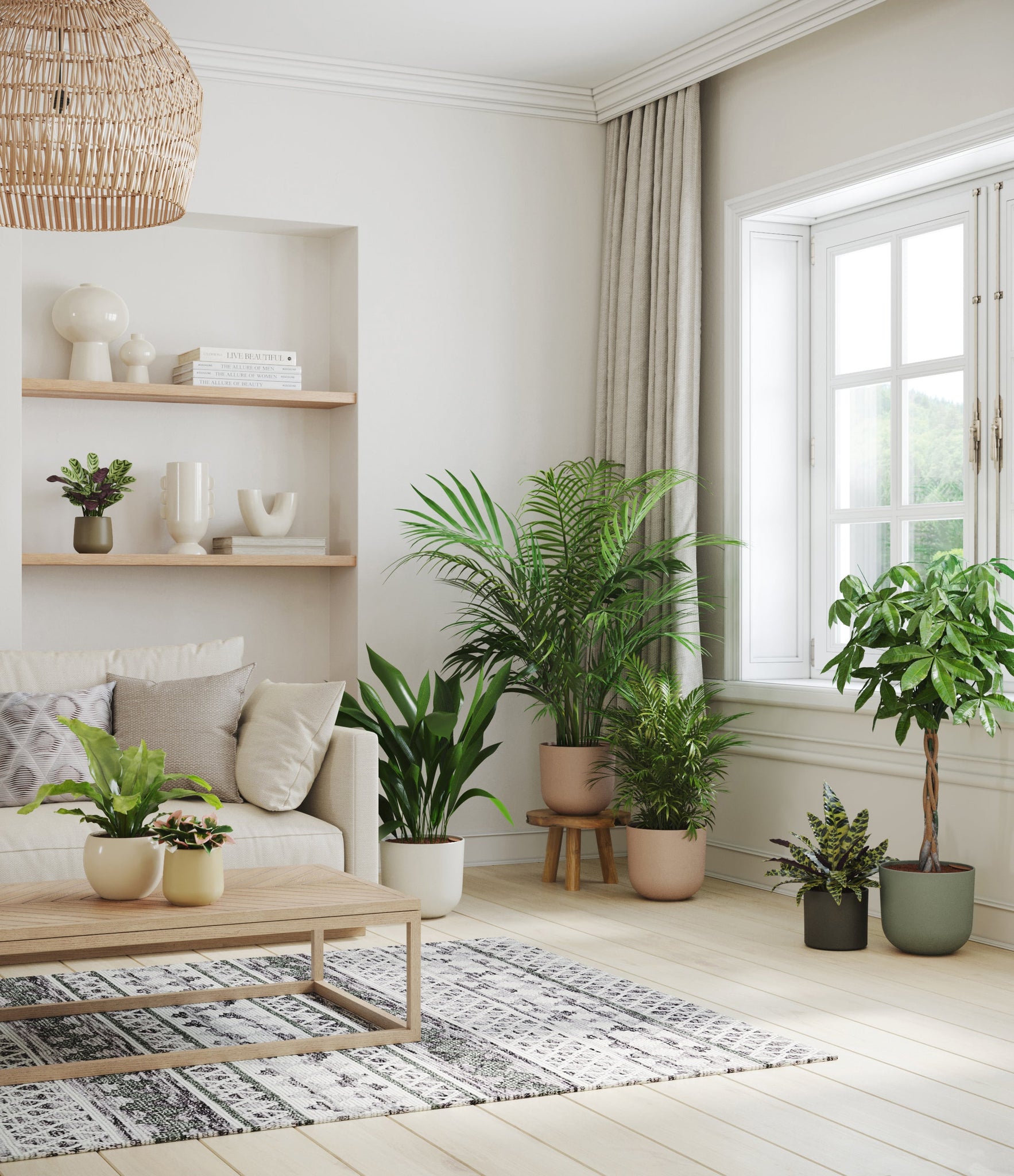 In this collection, you’ll receive eight tropical pet-friendly houseplants that make any space feel like a serene indoor jungle. The set includes a small Marxii Calathea, displaying intricate rippling foliage; a small Hoya Tricolor, with marvelous variegations of pink and white on deep green leaves; a medium Bird’s Nest Fern, bursting with bright green, wavy fronds; and a medium Rattlesnake Calathea, wearing its signature reptilian pattern. For the large plants, you'll receive a Cast Iron Plant, known for its incredible resilience, and a large Parlor Palm, offering a timeless touch of greenery. For the grand statement pieces, you'll enjoy a huge Money Tree, symbolizing good fortune and prosperity, and a huge Areca Palm, adding a dash of tropical elegance.