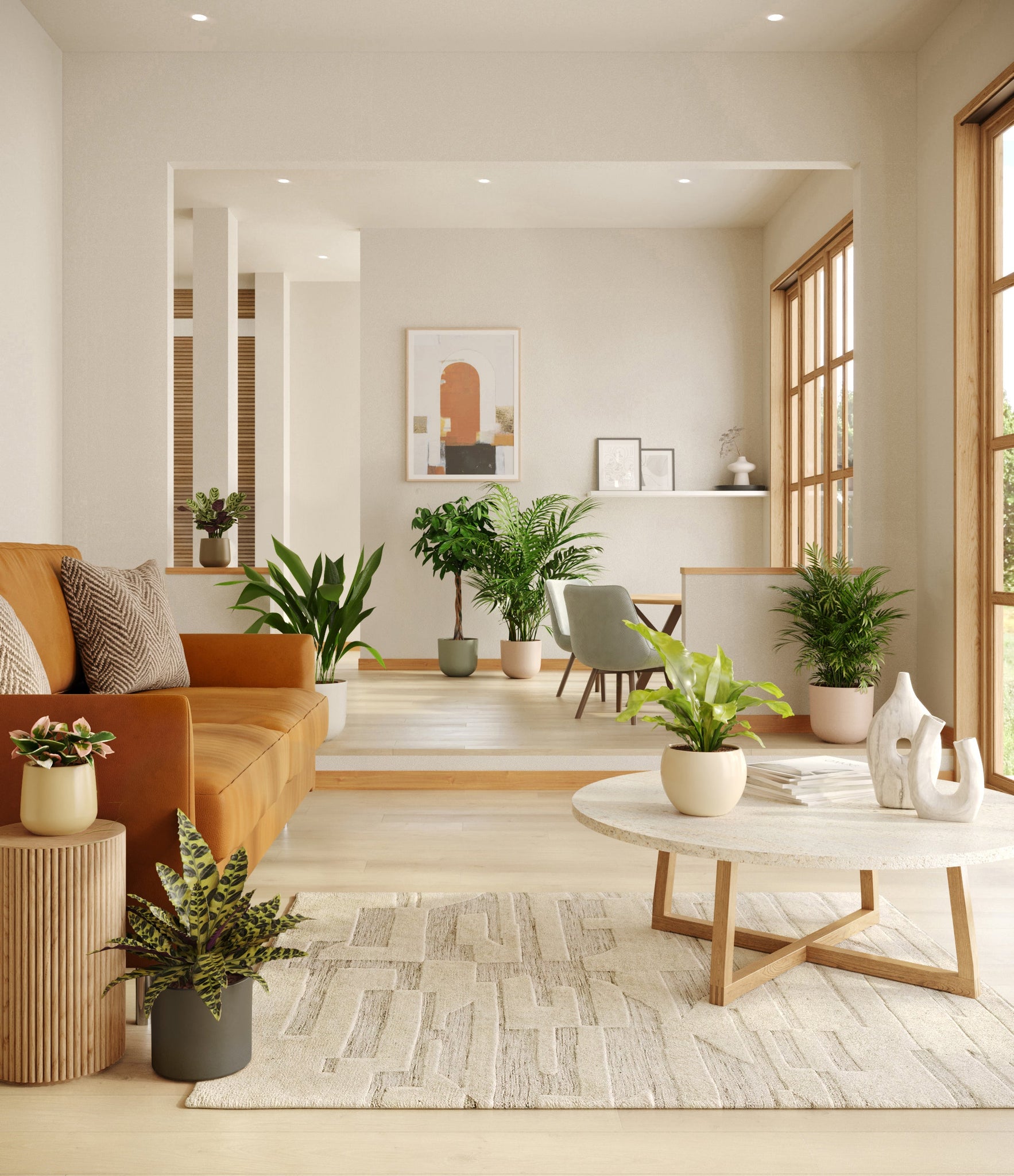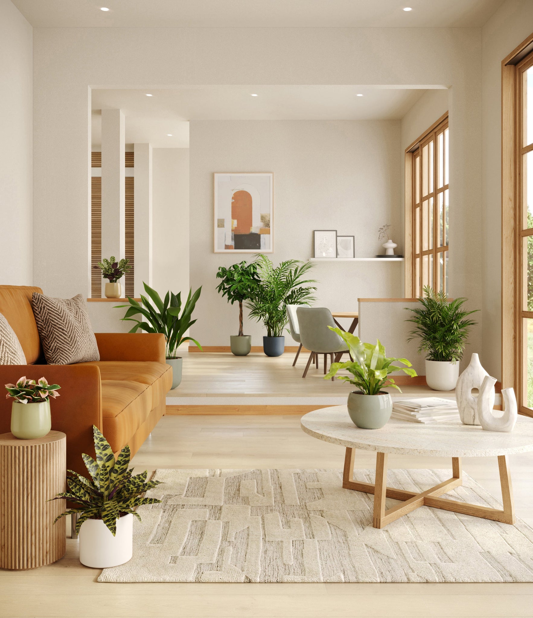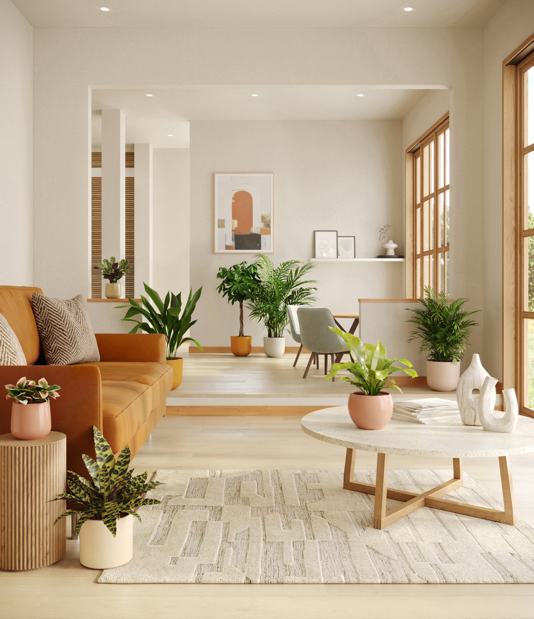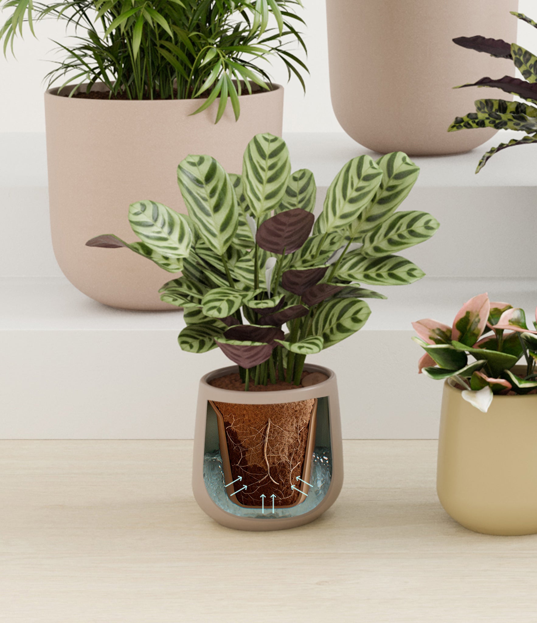 In this collection, you’ll receive eight tropical pet-friendly houseplants that make any space feel like a serene indoor jungle. The set includes a small Marxii Calathea, displaying intricate rippling foliage; a small Hoya Tricolor, with marvelous variegations of pink and white on deep green leaves; a medium Bird’s Nest Fern, bursting with bright green, wavy fronds; and a medium Rattlesnake Calathea, wearing its signature reptilian pattern. For the large plants, you'll receive a Cast Iron Plant, known for its incredible resilience, and a large Parlor Palm, offering a timeless touch of greenery. For the grand statement pieces, you'll enjoy a huge Money Tree, symbolizing good fortune and prosperity, and a huge Areca Palm, adding a dash of tropical elegance.